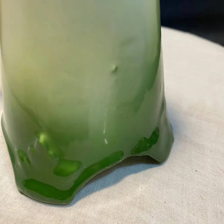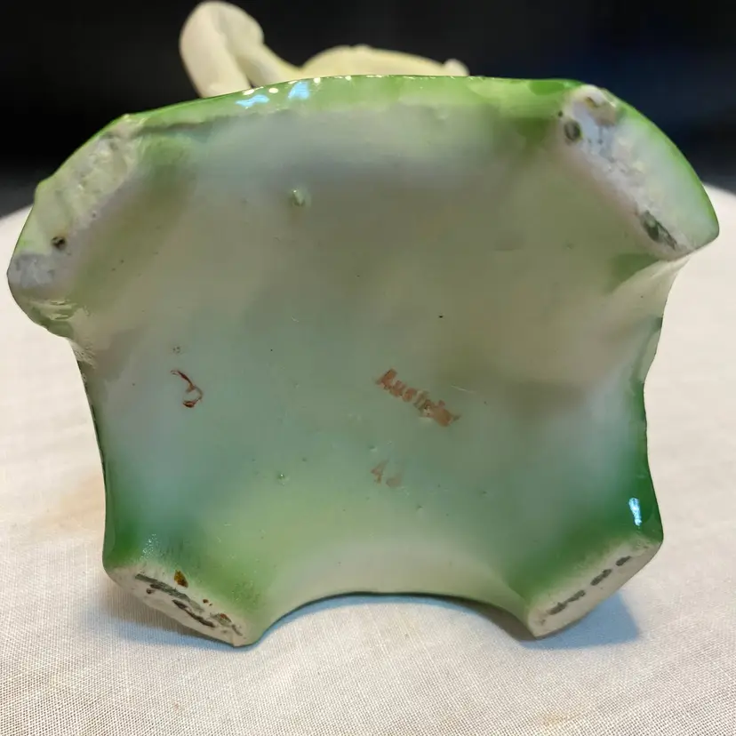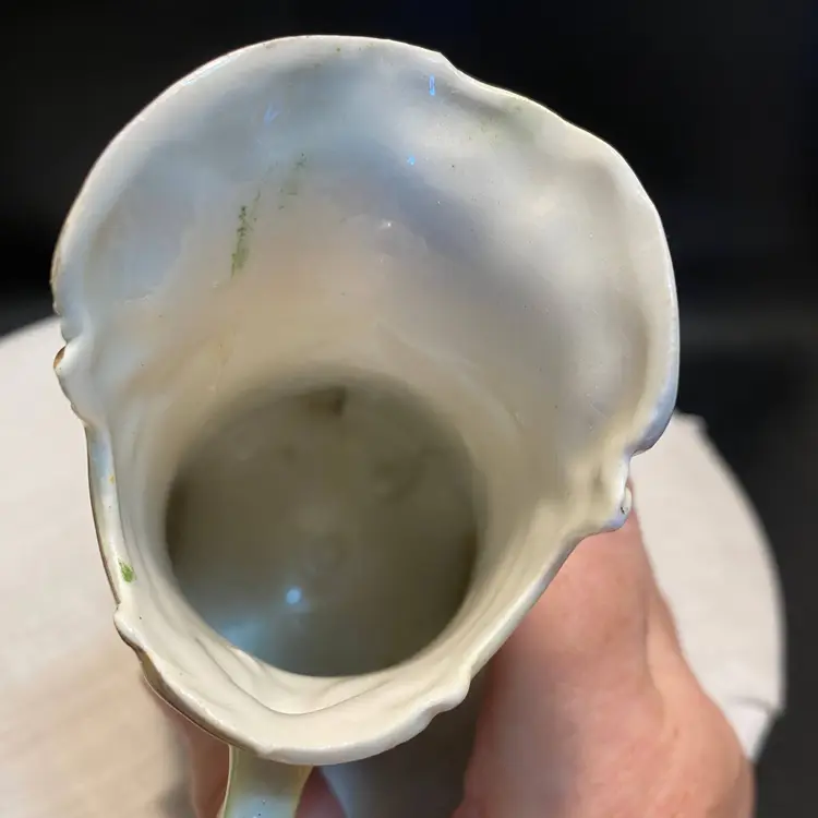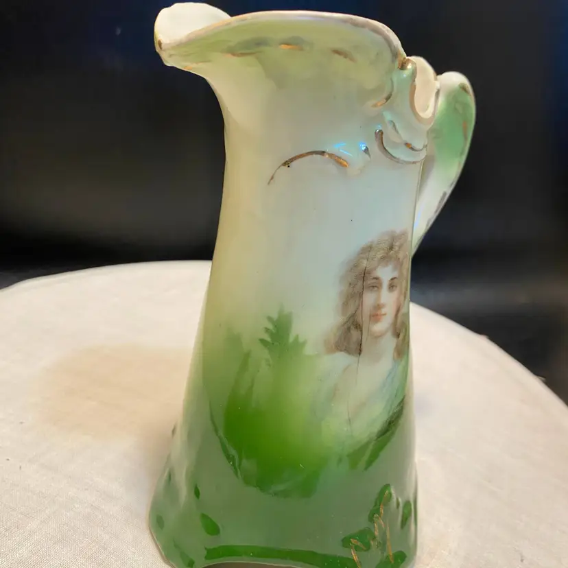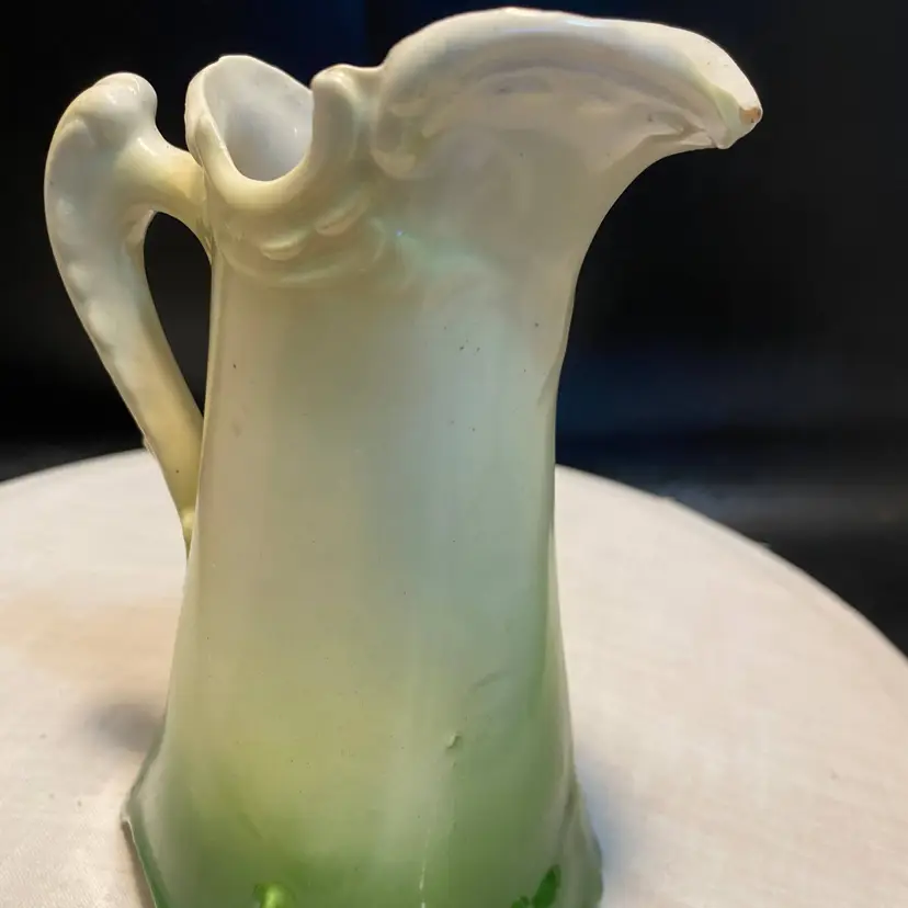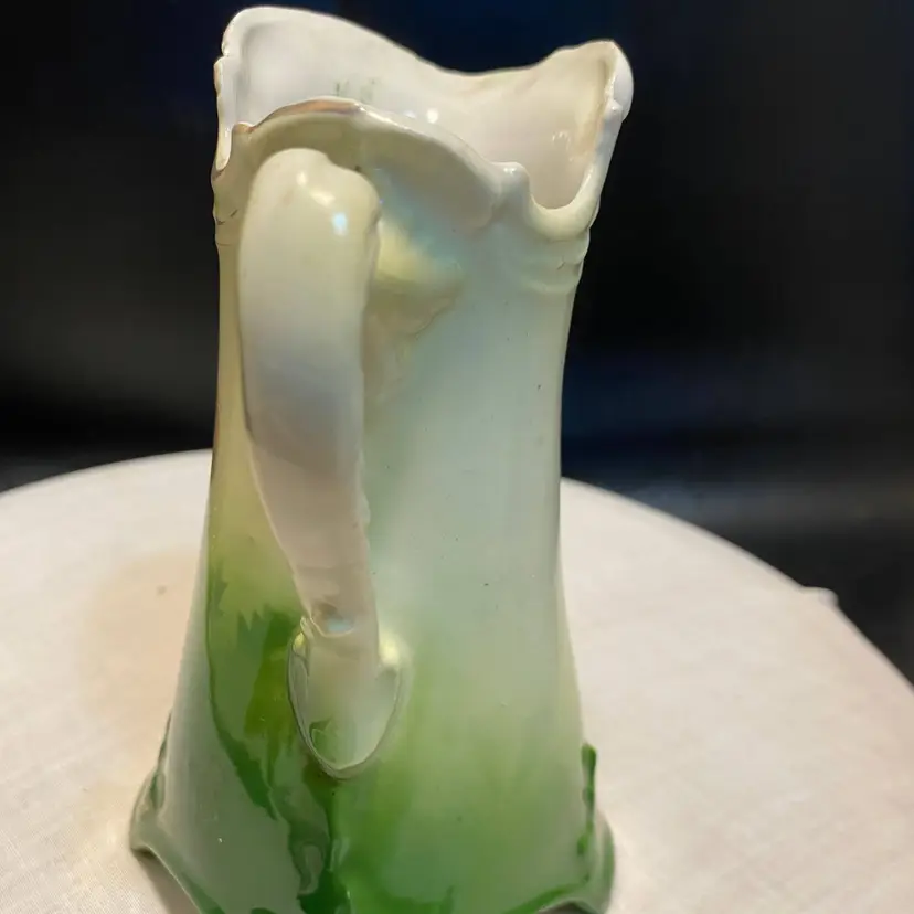No chips or cracks, finish has a few scratches as shown in pictures. Pitcher has footed bottom, makers mark on bottom. Coloring is bright. Measurements are 5 3/4” tall, 4” wide with handle, 3 1/2” wide, 4 1/4” deep.