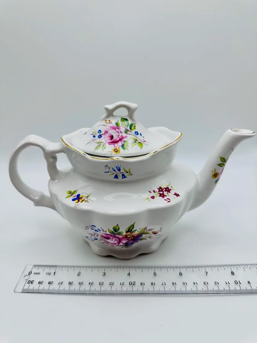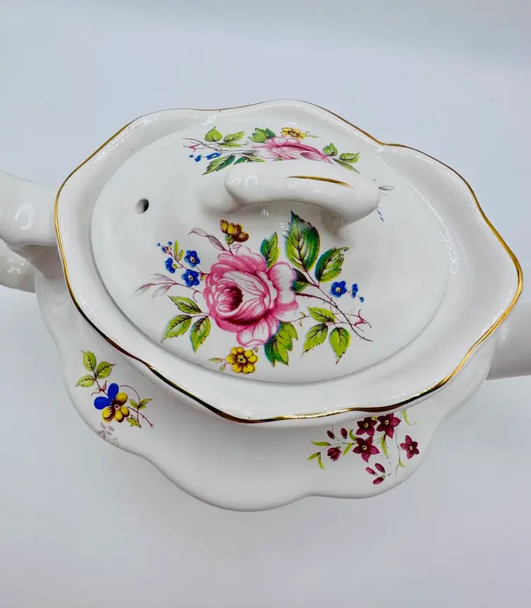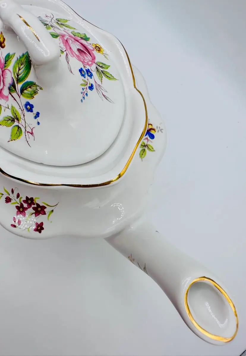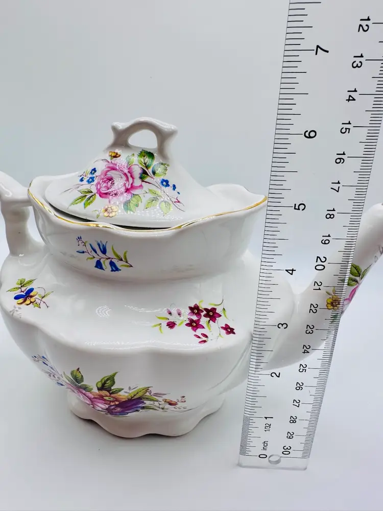 This vintage porcelain teapot, made in England during the 1950s, features a beautiful English Rose pattern in a multicolor design. Perfect for serving tea in medium size gatherings, this collectible piece adds a touch of elegance to any kitchen or dining table. Its retro charm and fine craftsmanship make it a sought-after item for tea enthusiasts and collectors of vintage dinnerware.