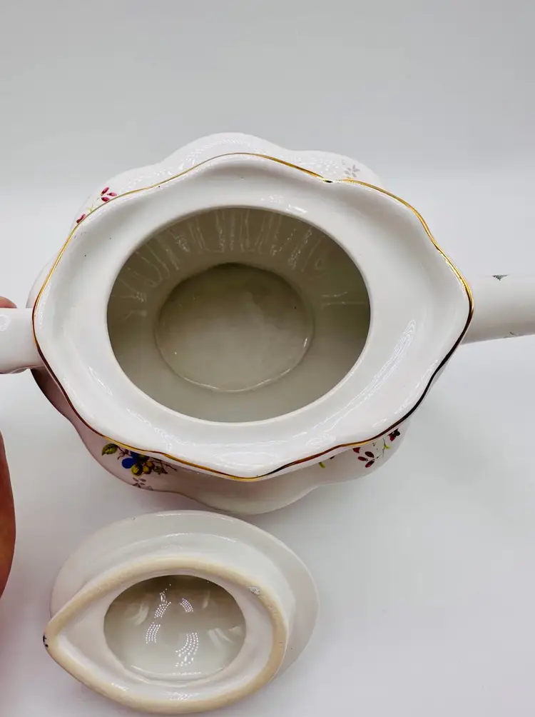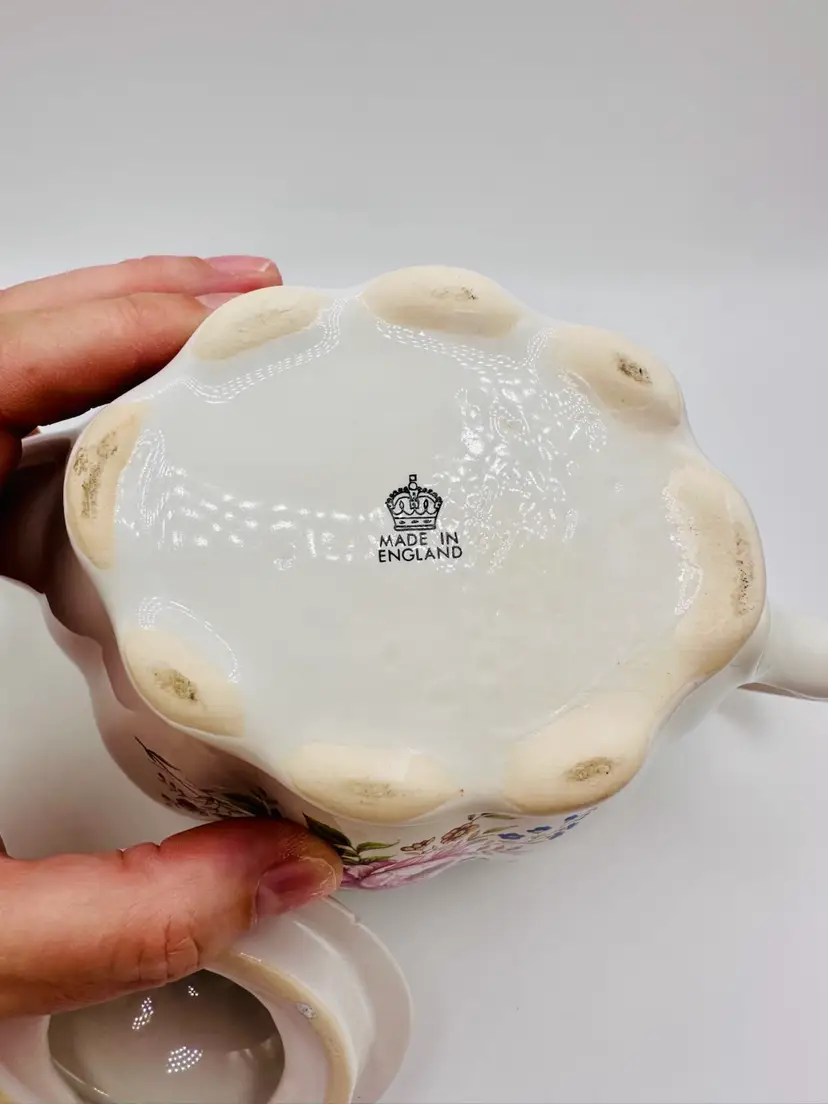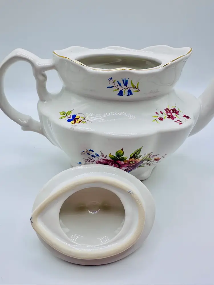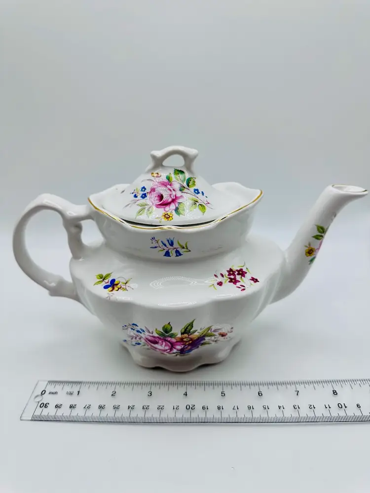 This vintage porcelain teapot, made in England during the 1950s, features a beautiful English Rose pattern in a multicolor design. Perfect for serving tea in medium size gatherings, this collectible piece adds a touch of elegance to any kitchen or dining table. Its retro charm and fine craftsmanship make it a sought-after item for tea enthusiasts and collectors of vintage dinnerware.