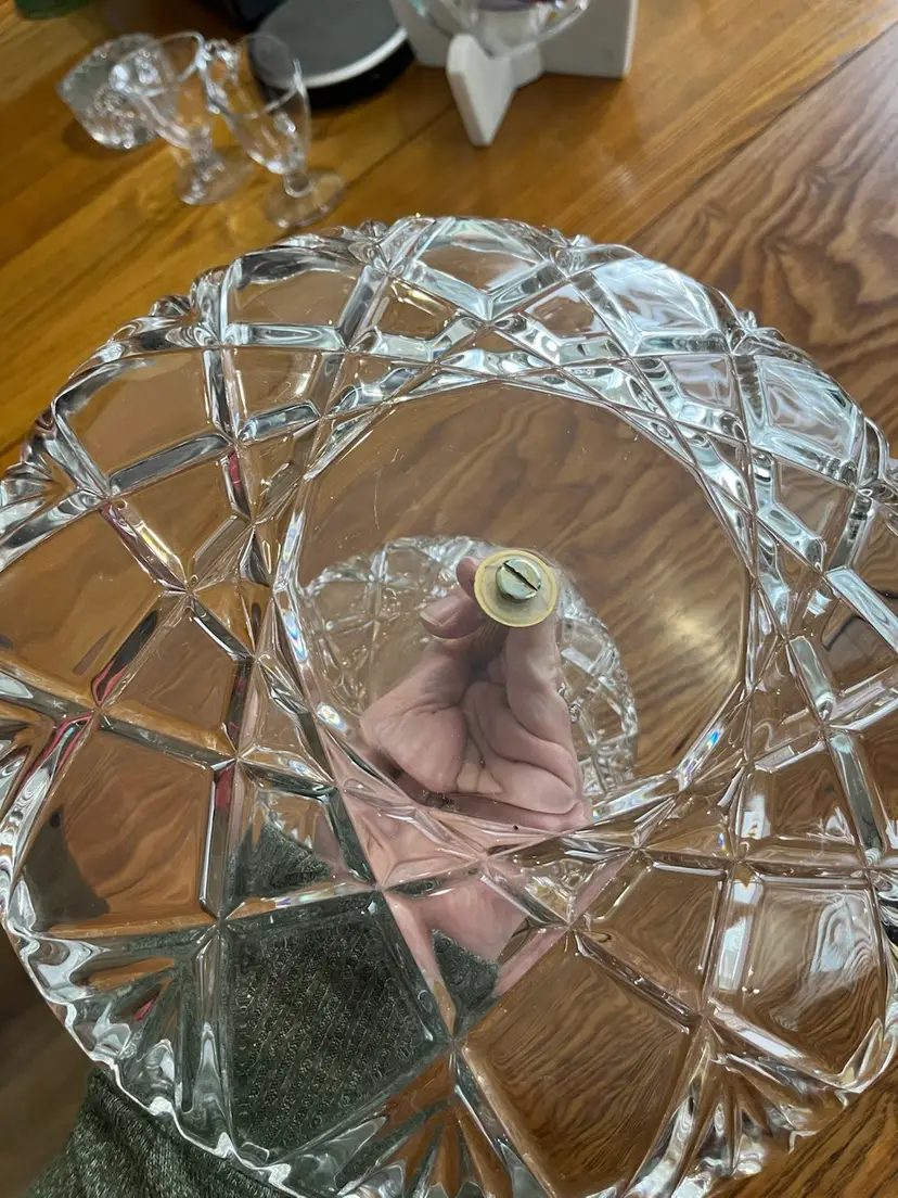 This particular style, with its geometric pressed or cut patterns and simple gold-toned hardware, is characteristic of mid-century home entertaining. Such pieces were common in households during the 1950s through the 1970s, reflecting a period of increased domesticity and social gatherings. They are often found in various decorative glass patterns, from hobnail to starbursts, and are valued for their practicality and decorative appeal.