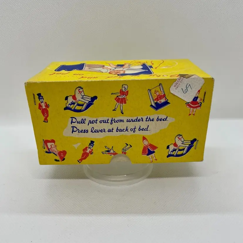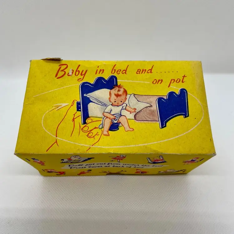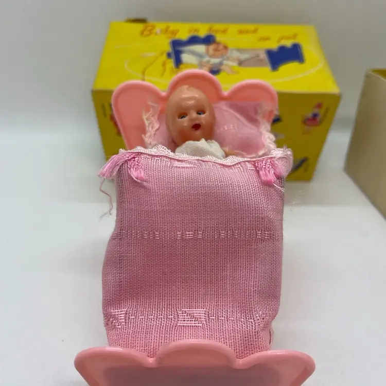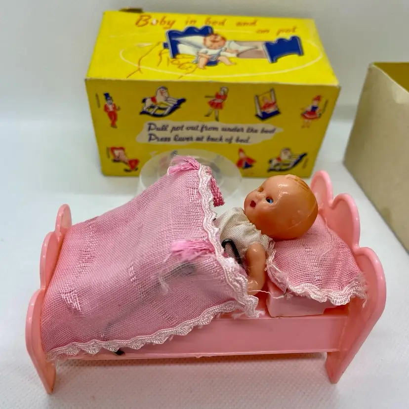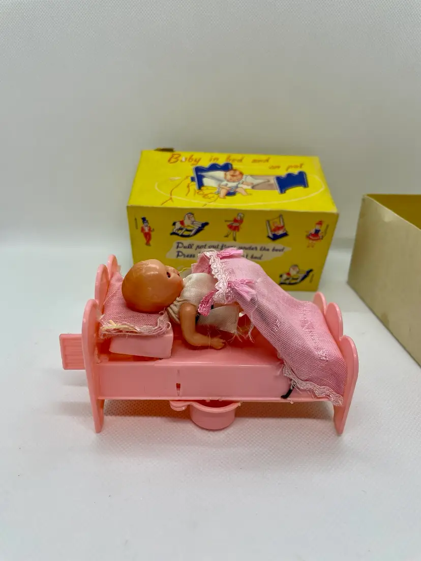 Vintage plastic toy made in Italy of a baby in a bed with a chamber pot underneath. Comes in the original box in good vintage condition. It measures approx 4.25” L x 3” W x 2.5” H