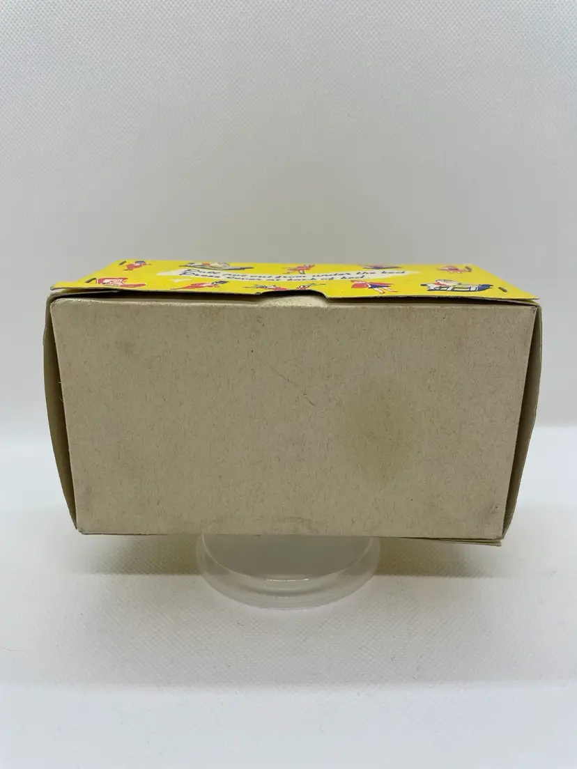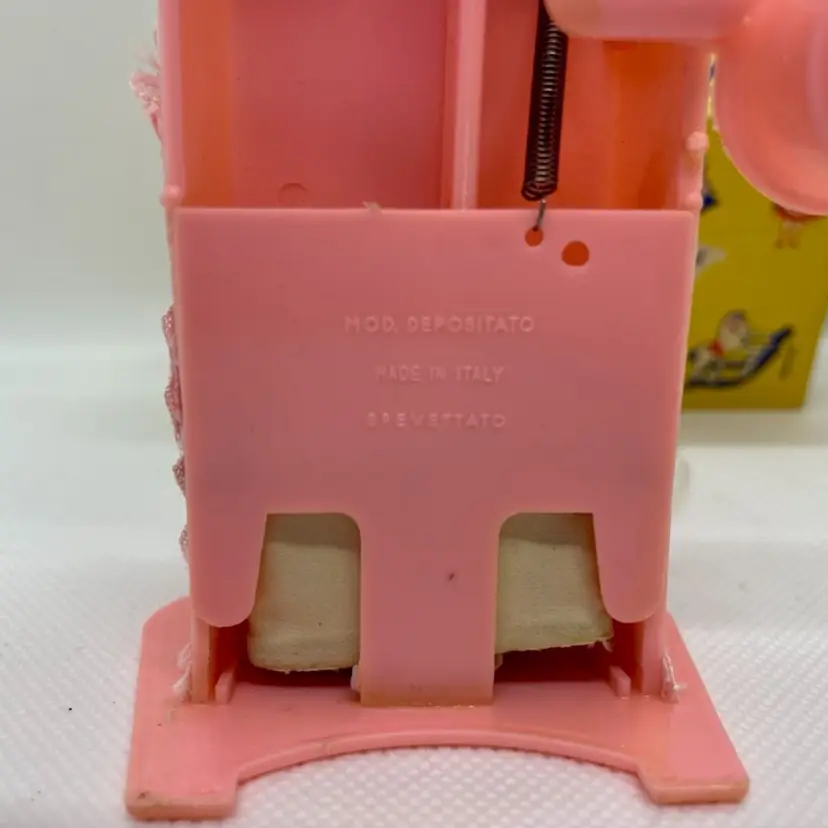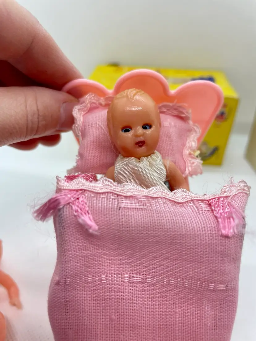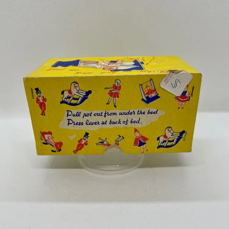 Vintage plastic toy made in Italy of a baby in a bed with a chamber pot underneath. Comes in the original box in good vintage condition. It measures approx 4.25” L x 3” W x 2.5” H