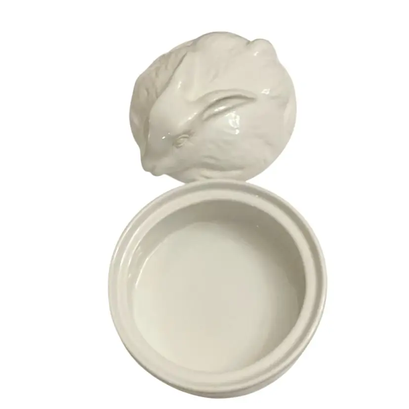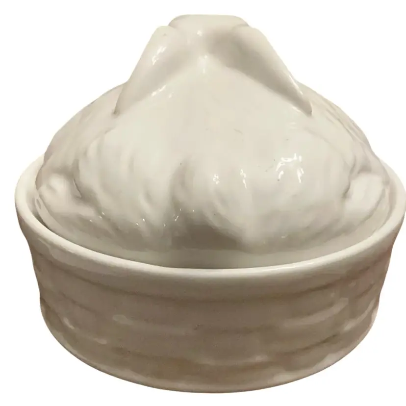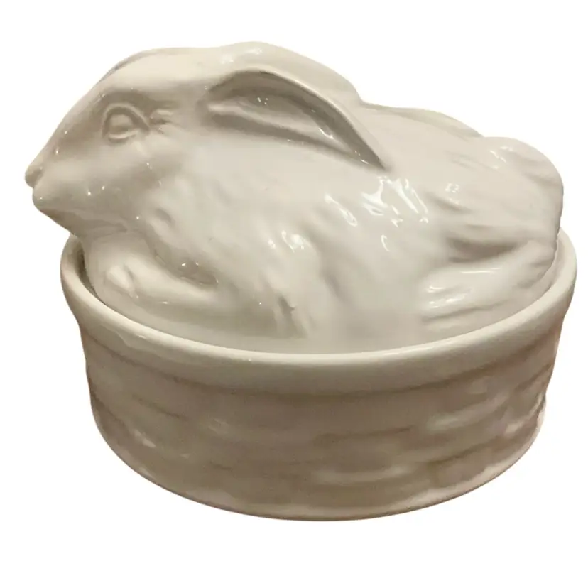 Vintage signed made in Italy with the mould number on the basketweave nest base. This adorable ceramic bunny on nest could be a candy dish, powder dish, trinket dish, etc. Fill it with some Easter grass and some colored eggs for a cute addition to your Easter decor.