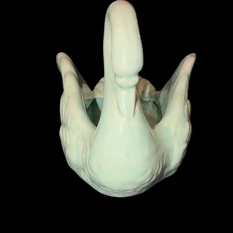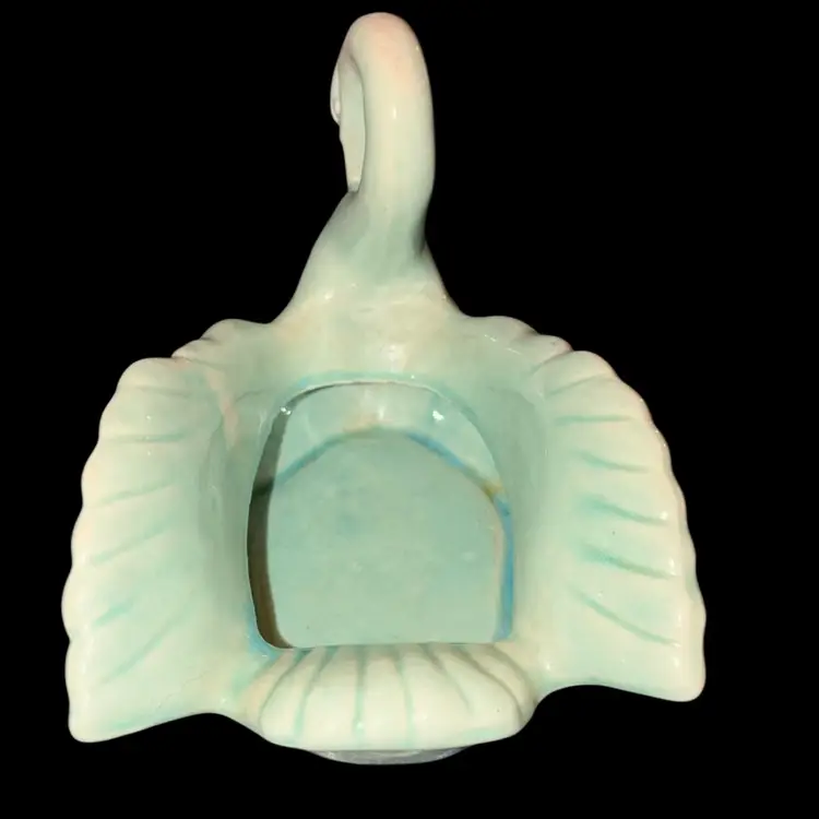 This vintage made in Japan aqua swan figurine, candy or trinket dish measures about 6 inches tall, 7 inches long, and 5 inches wide. It has a texture giving the appearance of feathers. It has a back stamp of a black crown and ribbon with made in Japan. It is in very good condition with no chips or cracks. Please see and enlarge the pictures for the condition. This would be great for the swan or bird lover!