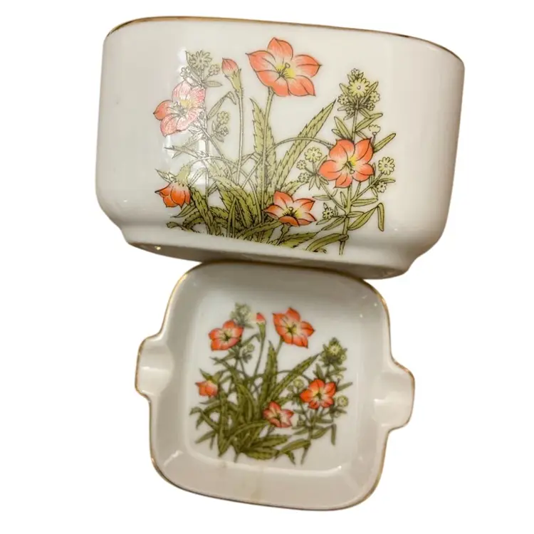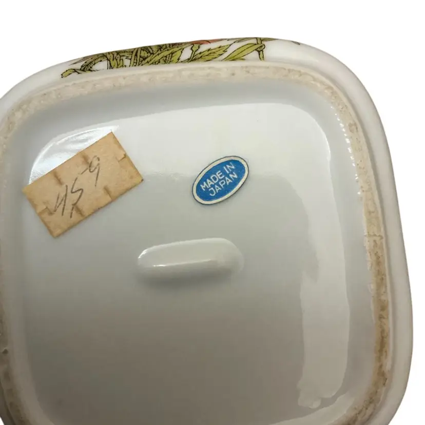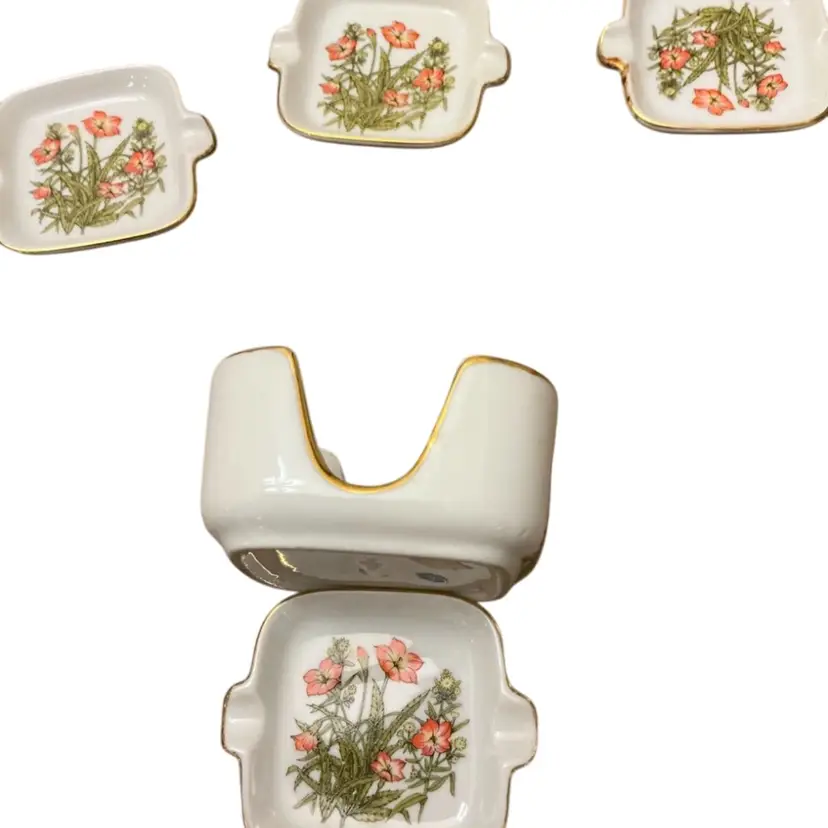 Vintage Japanese individual ash tray/ butter pat/ salt cellar/ trinket dishes. Set of 4 nest in the original holding tray. Beautiful floral design. 4” by4 1/2.”
