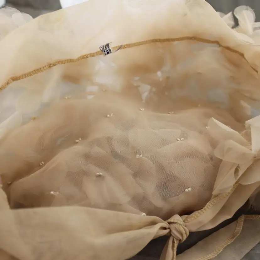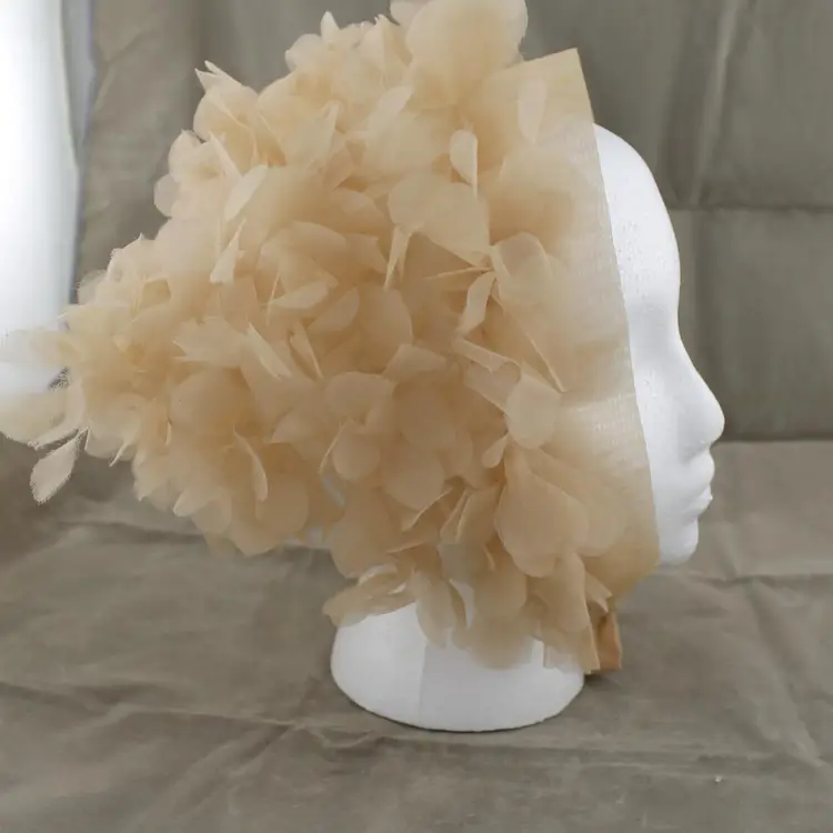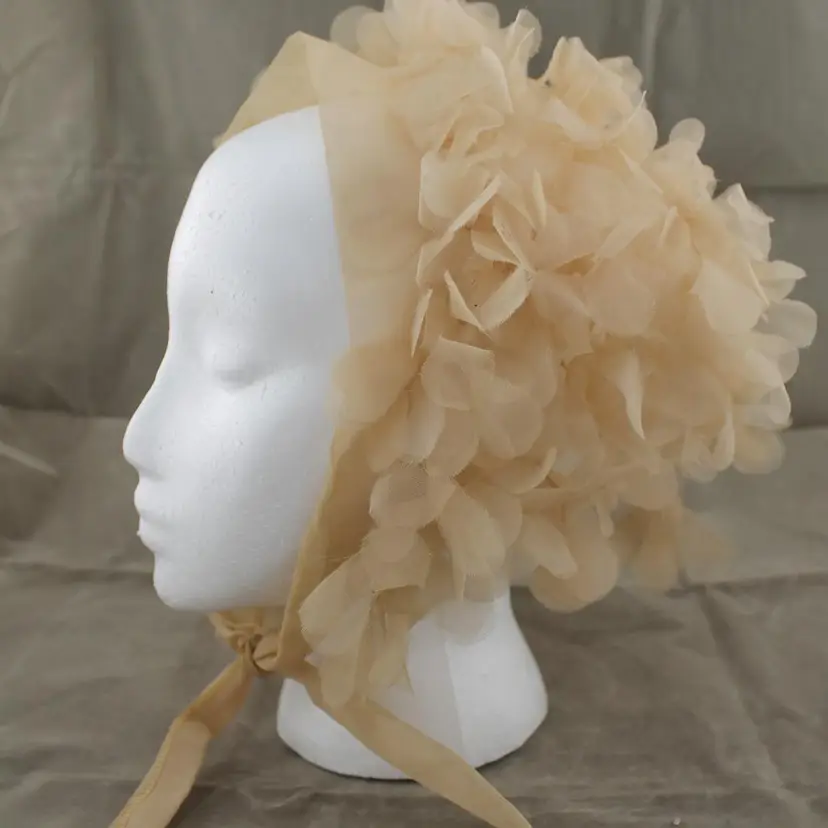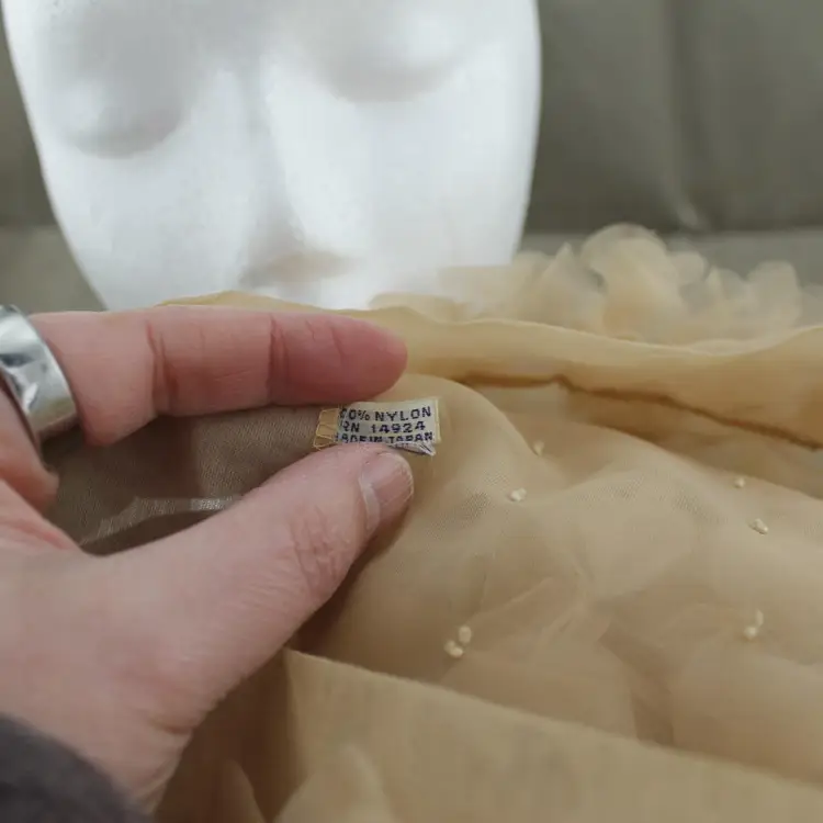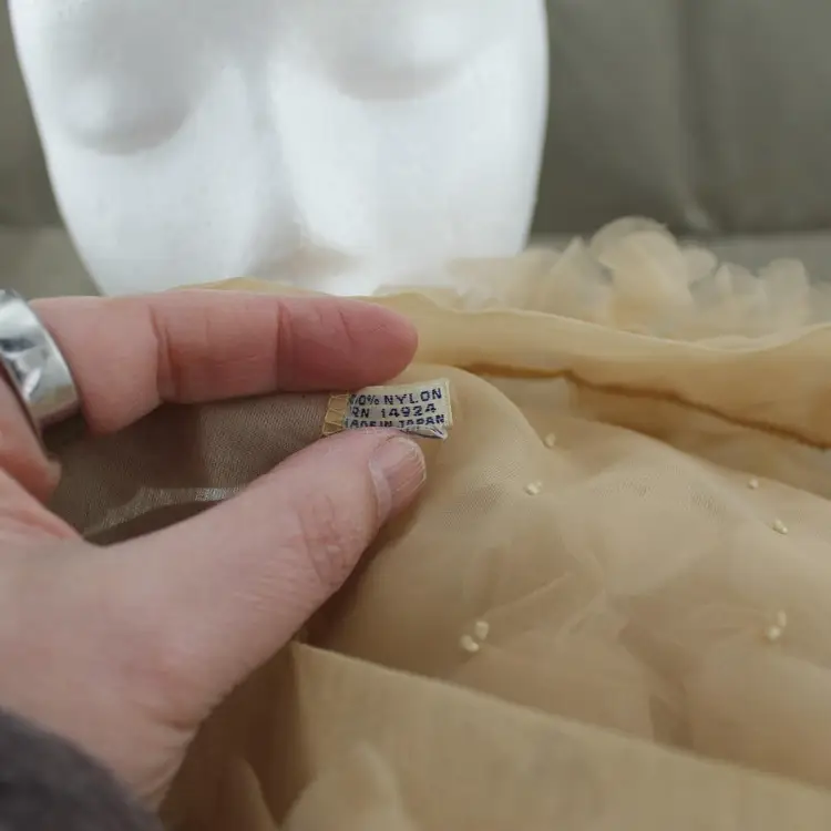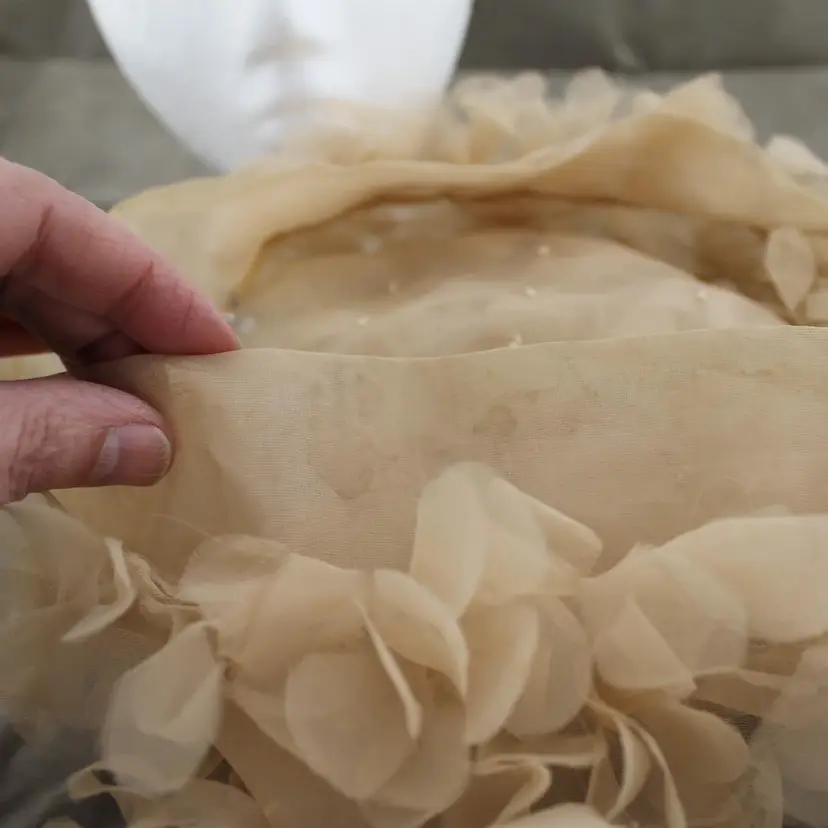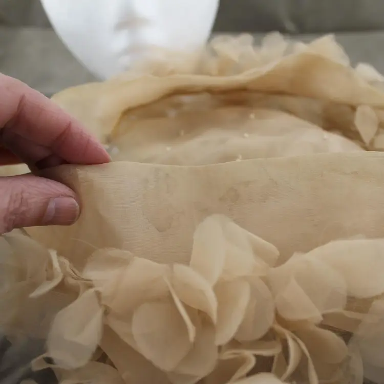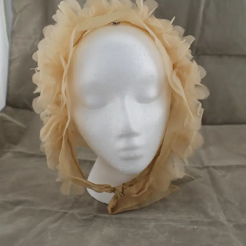 This is a vintage head scarf made in Japan. It's in pretty good shape. No rips, tears or holes or odors. There are couple of stains. My home is smoke free. It's tan or beige in color with a floral pattern. I can say about where it came from.
