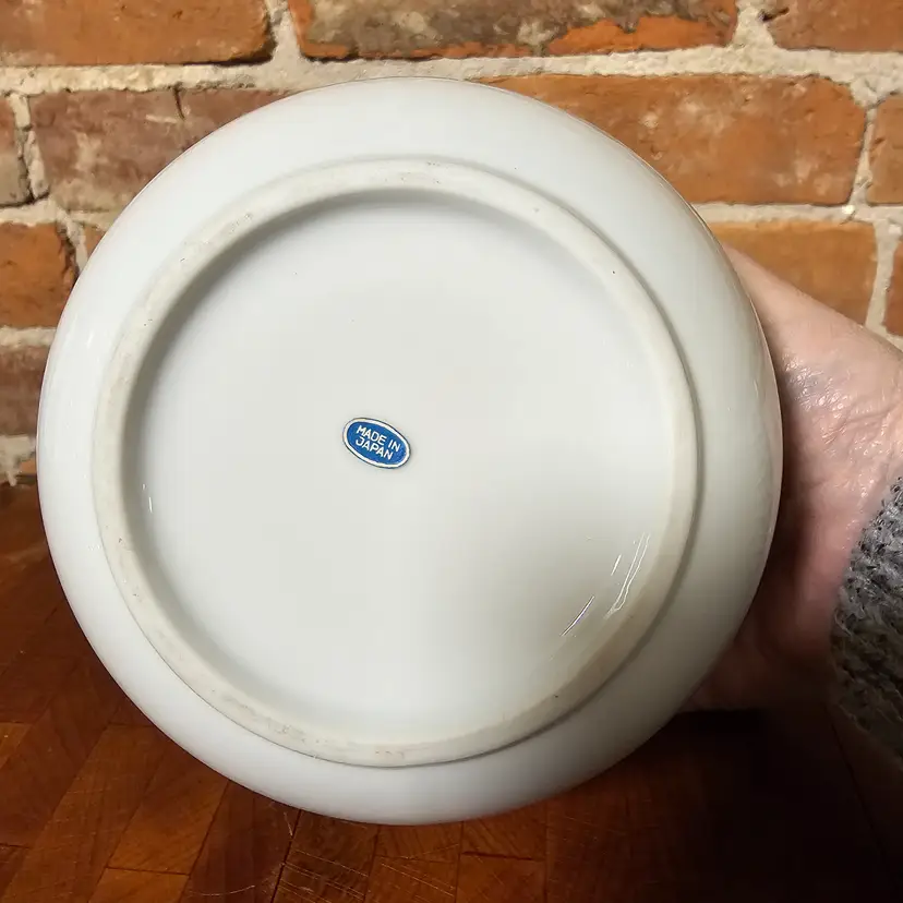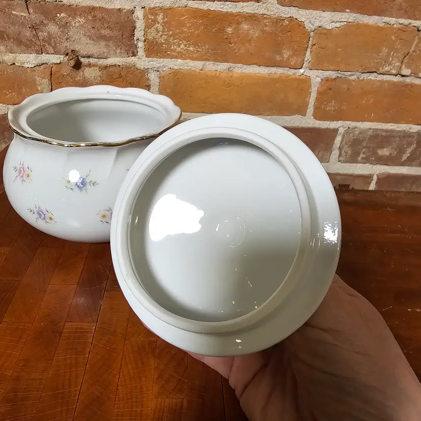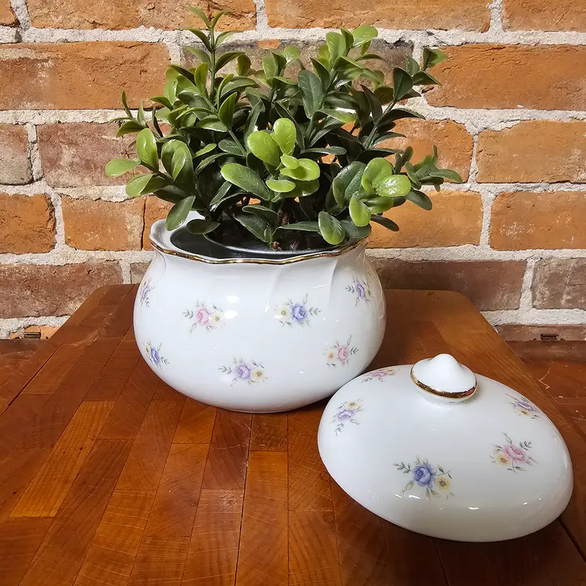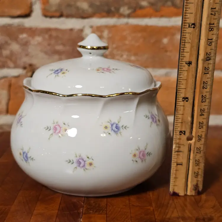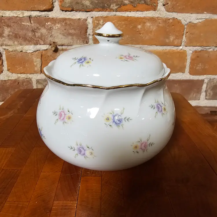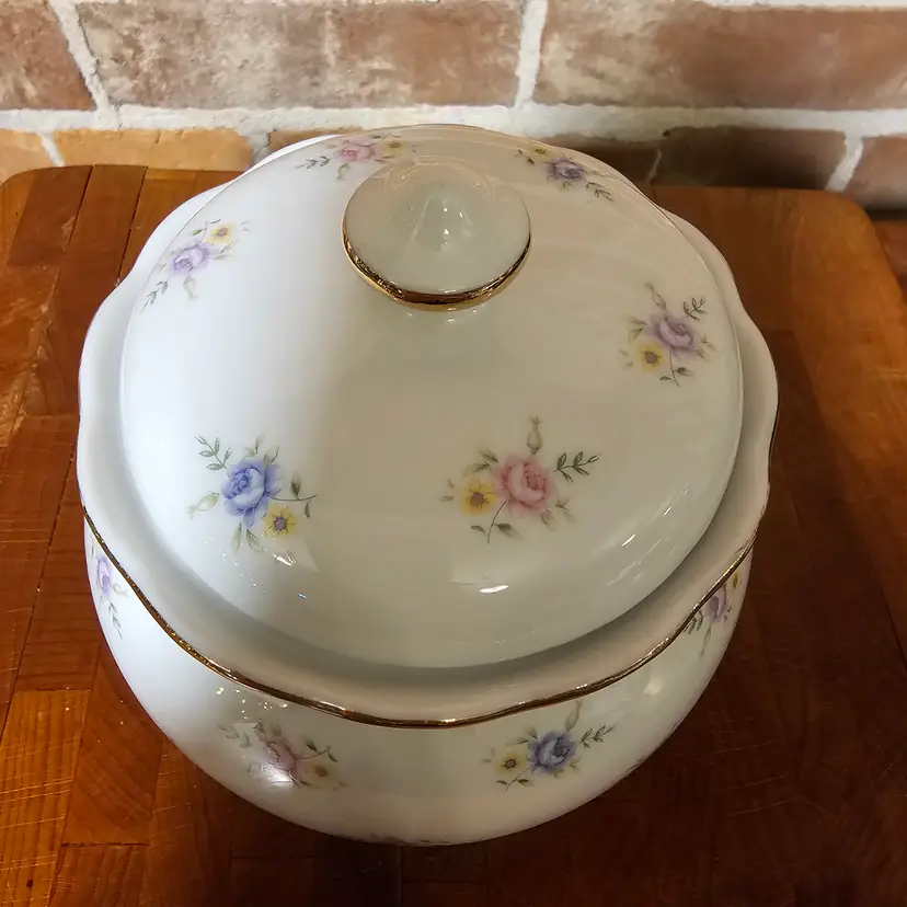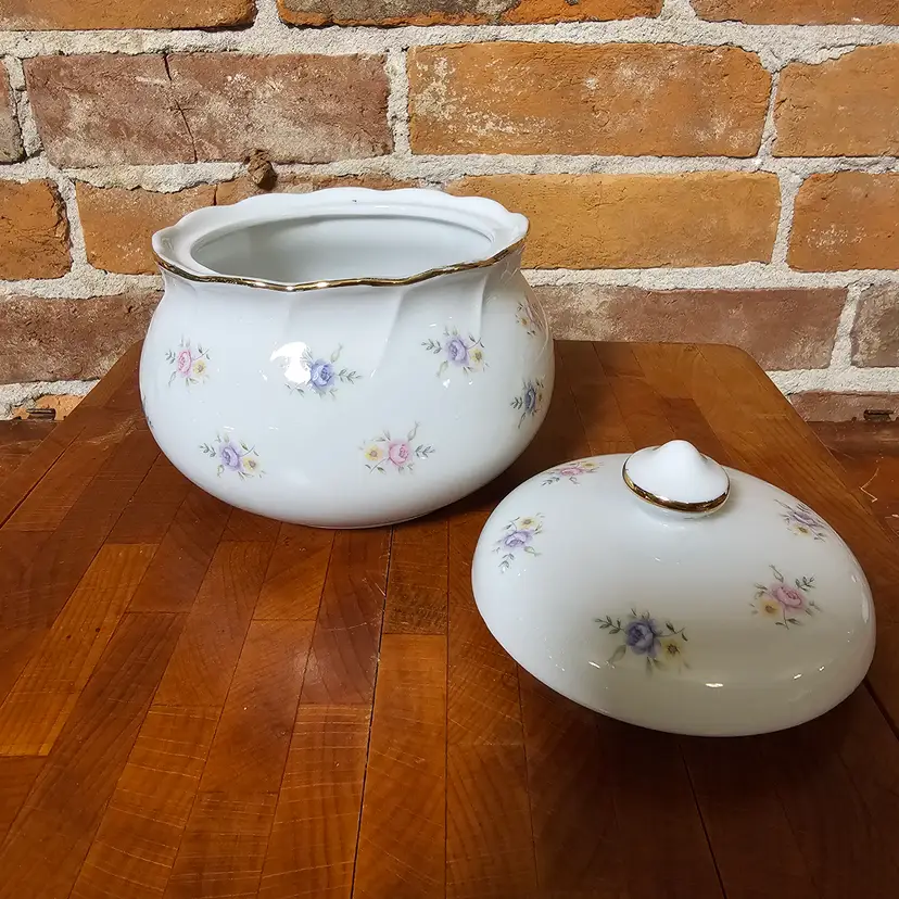 Charming vintage covered dish made in Japan featuring delicate pink and blue floral accents on a soft white background with gold trim detailing. A timeless piece perfect for cottage, shabby chic, or traditional decor.
