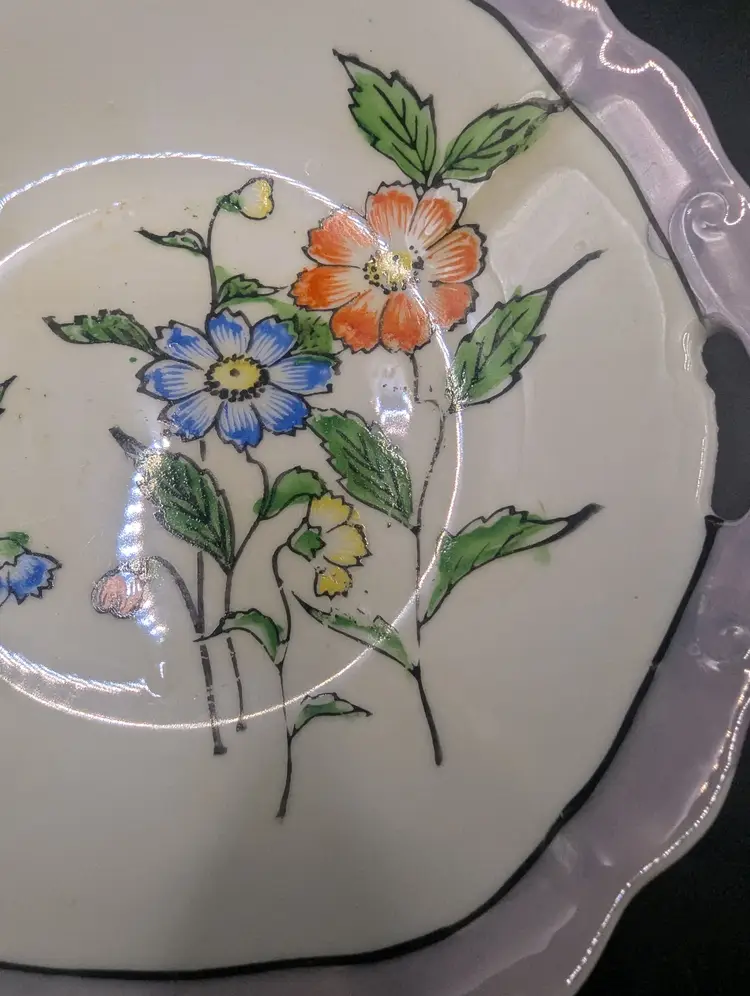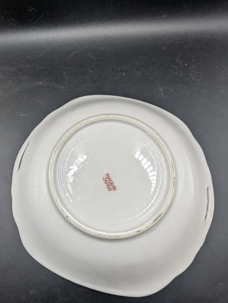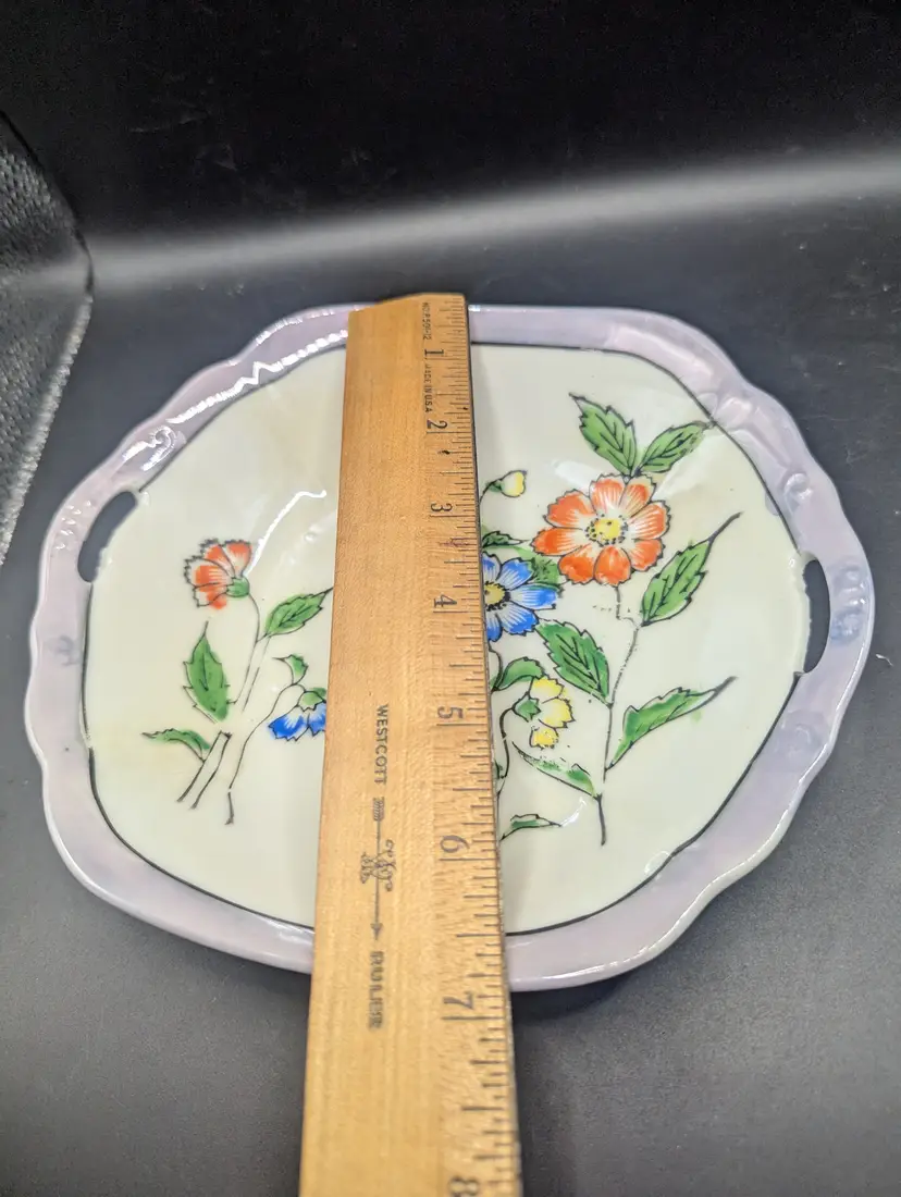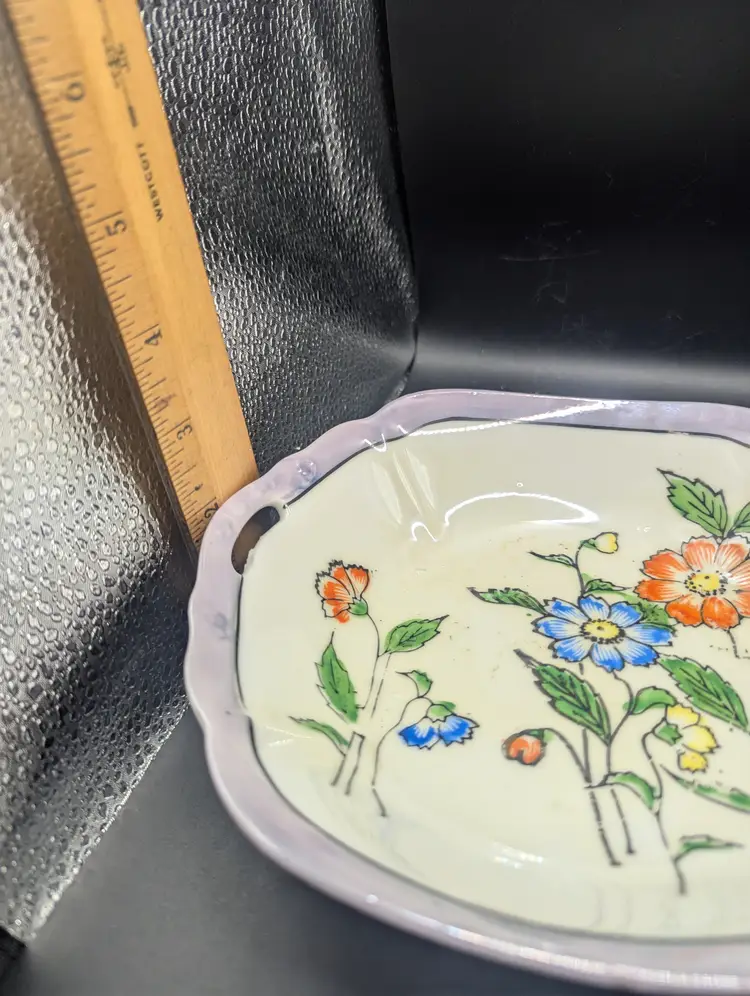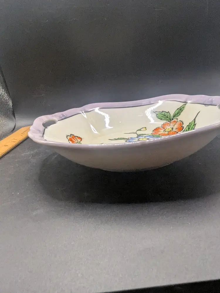 This is a lovely Vintage Made in Japan Purple Lustreware Rimmed Two Handled Serving Bowl. It has hand painted flowers on the inside of the bowl. It measures 7 inches in diameter and is 2 inches deep. No chips or cracks. Please see all pictures for condition and measurements.