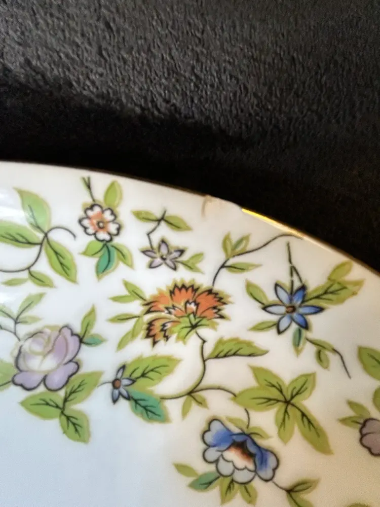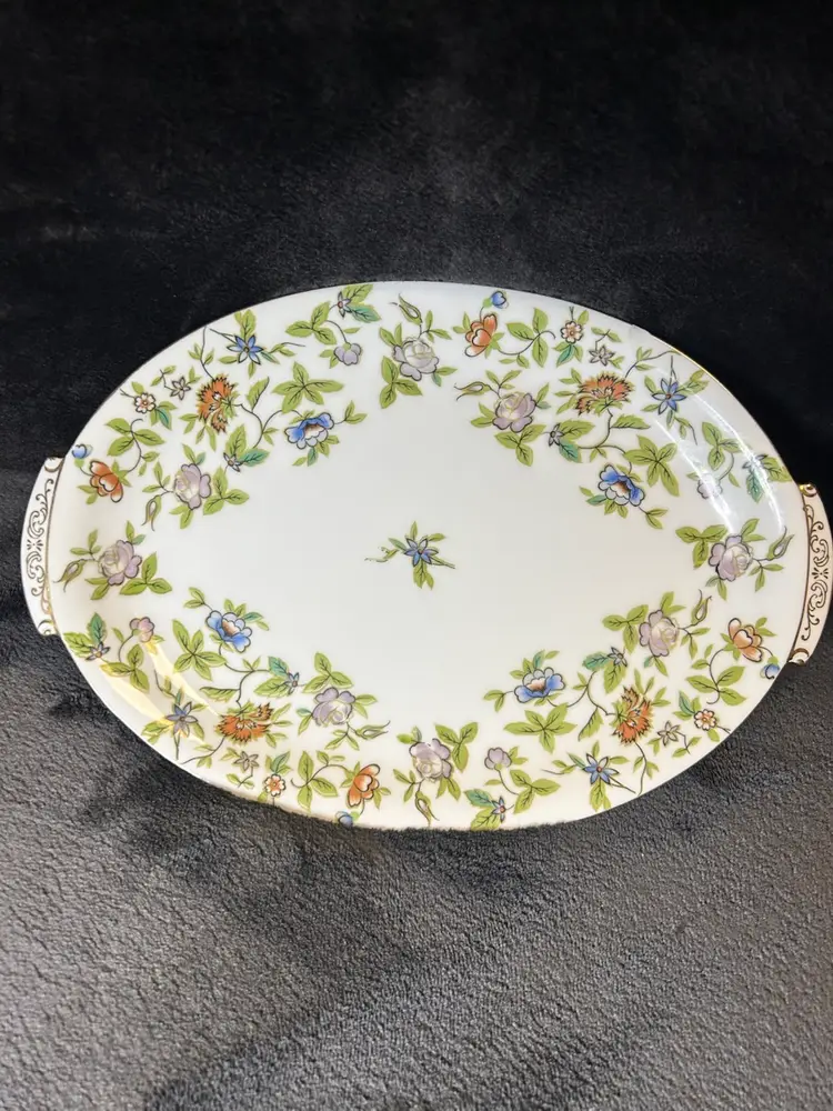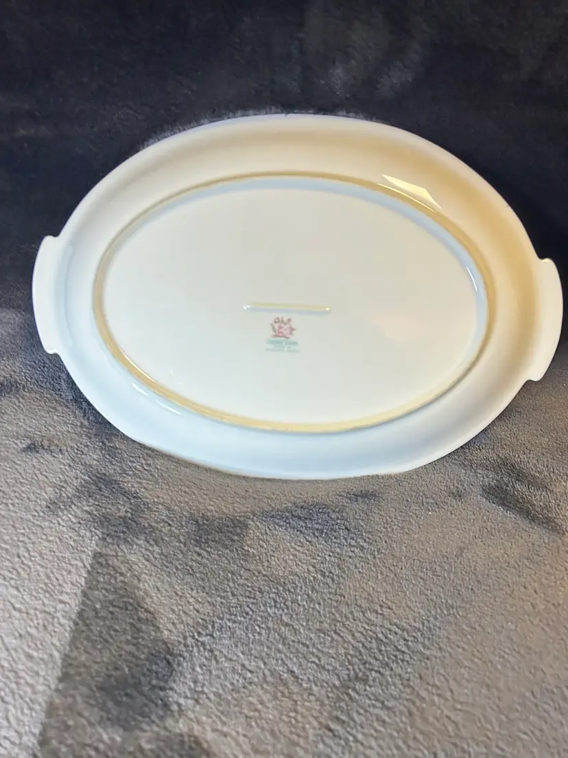 This is a vintage Cherry China serving plate made in Japan from 1945-1952. The oval-shaped porcelain dish features a floral pattern in multicolor. It has a glossy finish and carries a Japanese cultural influence. The small chip is the only known flaw on this original retro piece.