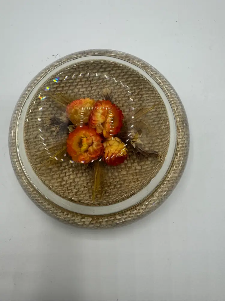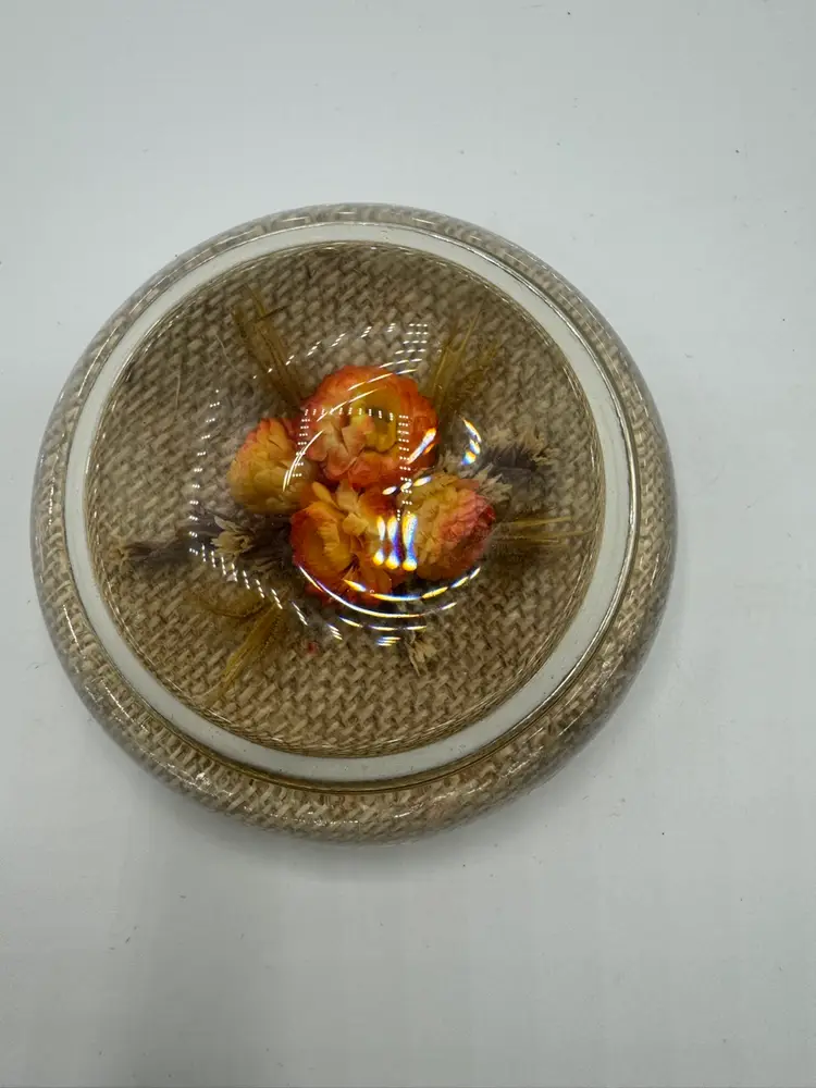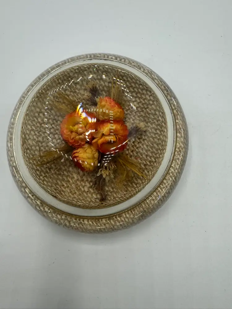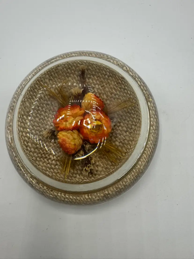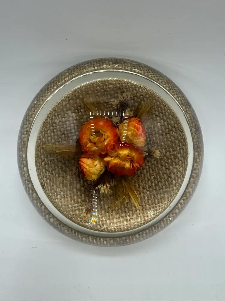 Beautiful vintage magnified paper weight with dried flowers. Great condition. No chips or cracks. Measures 3” inch in diameter and 2” in height.