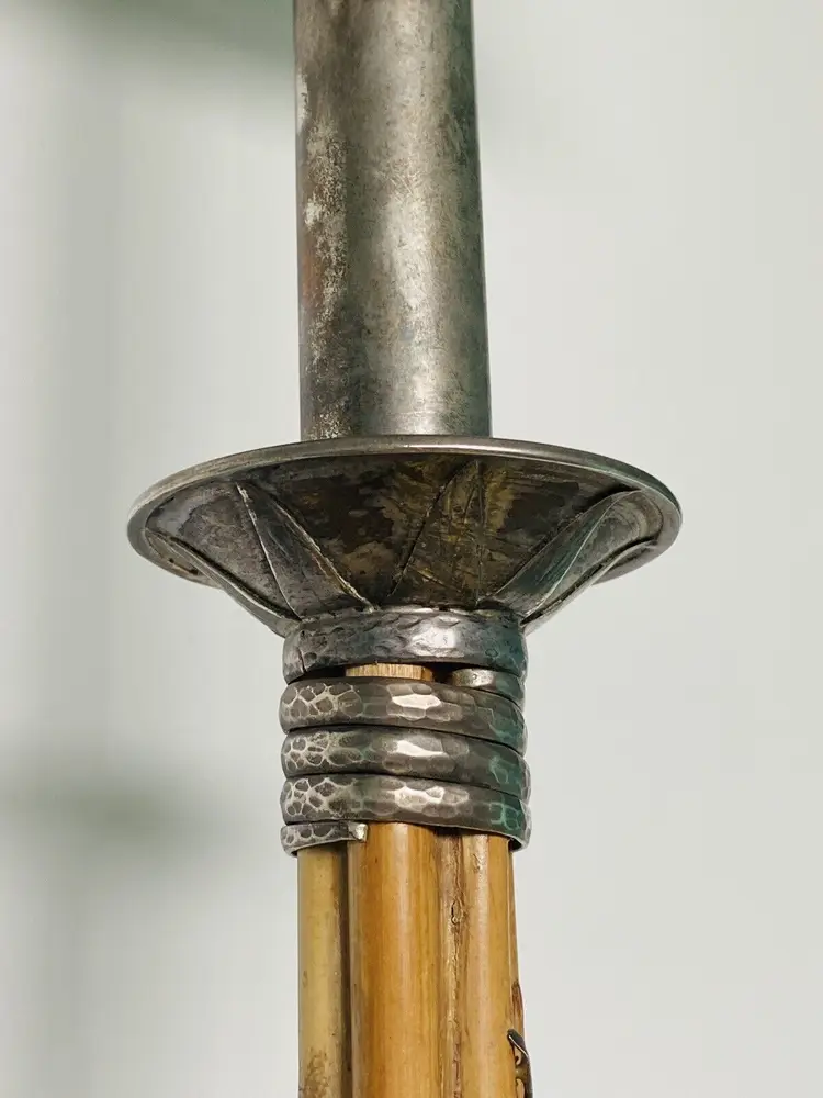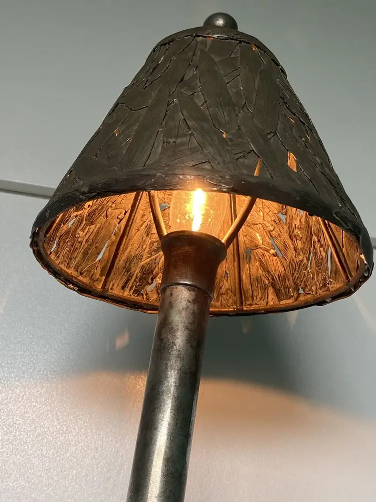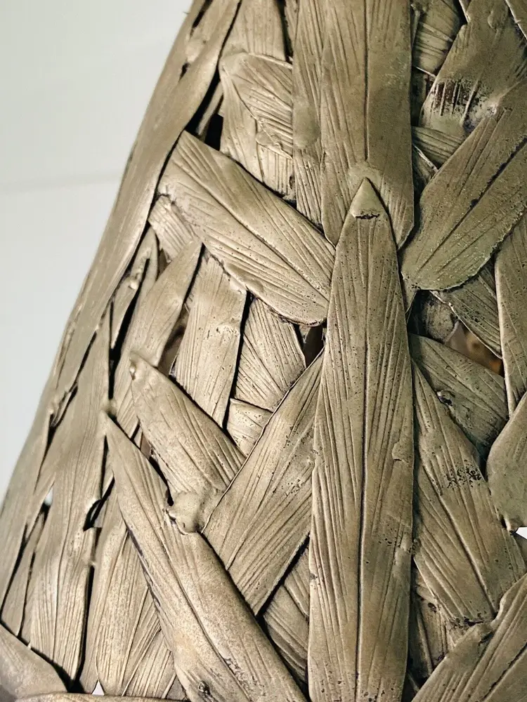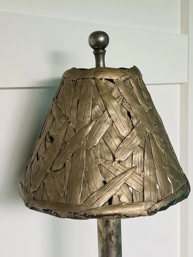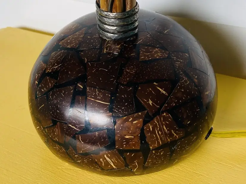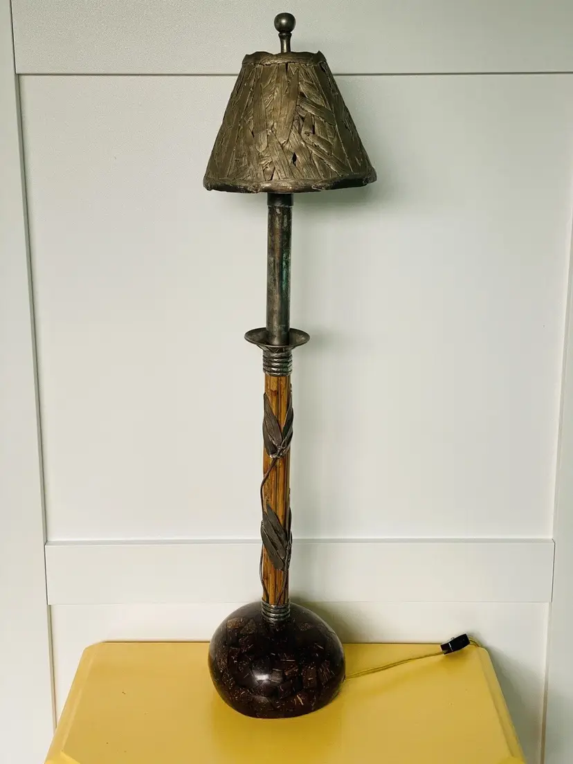 Vintage Maitland Smith Lamp Silver Tone Tiki Bamboo Inlaid Coconut Lucite Leaf Shade.