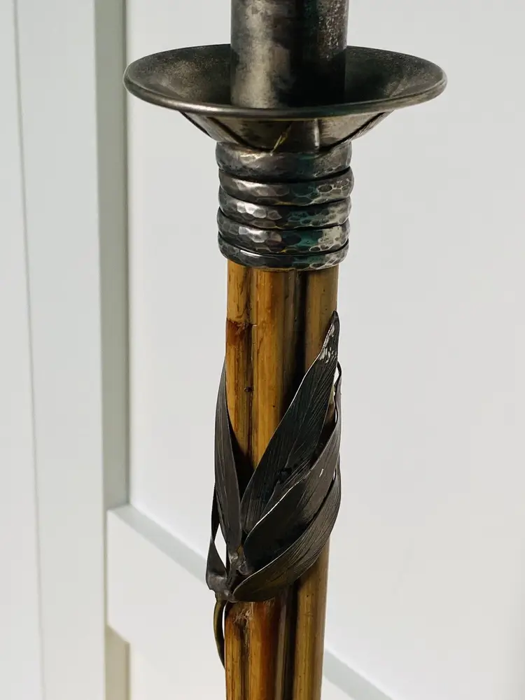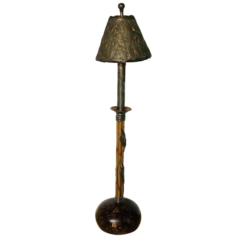 Condition is "Used". No Chips. No Cracks. Very Unique And Rare Table Lamp That Features A Tropical Touches Like Bamboo, Silver Tone Leaf Details Around Body Of Piece As Well As The Shade. Base Has Small Flea Bites And A Few Spots Where You Can can Feel The Inlay. The Lamp Shade And Base Has A Lean. Will Leave It Up To Buyer To Determine Best Strategy To Adjust. Piece Has Original Finial. Tested And Light Works. Please See Photos For Details. Please Message Us If You Have Any Questions Or Would Like More Photos.