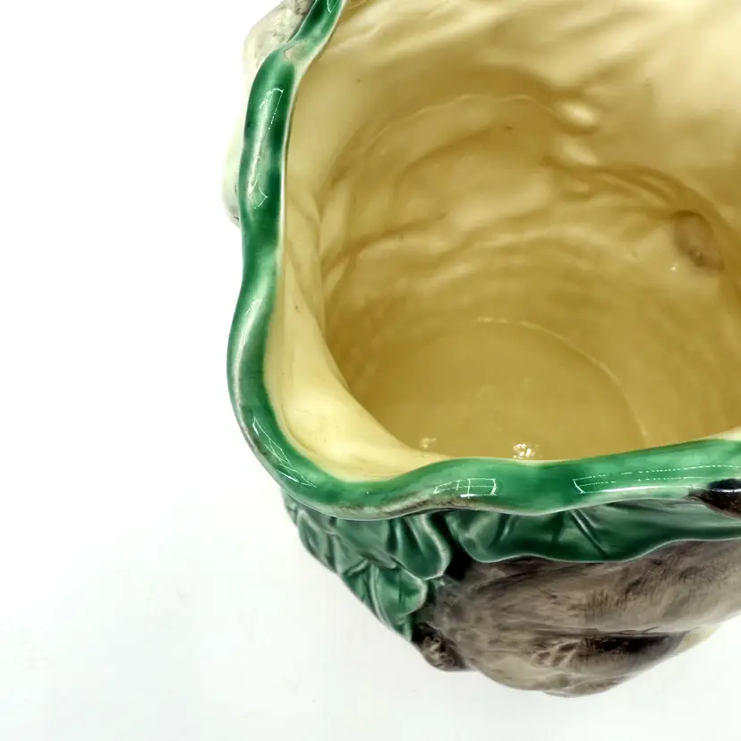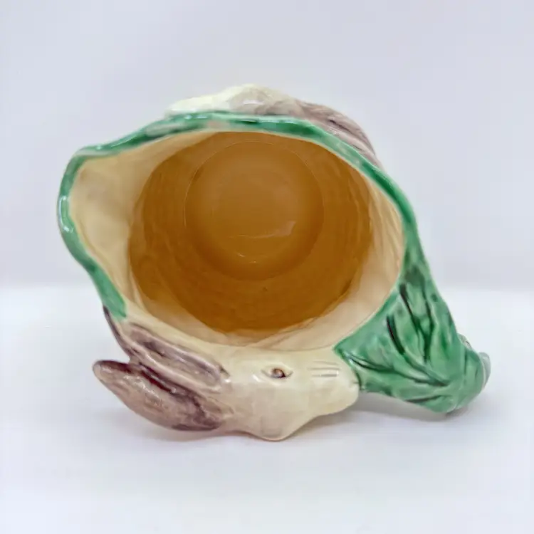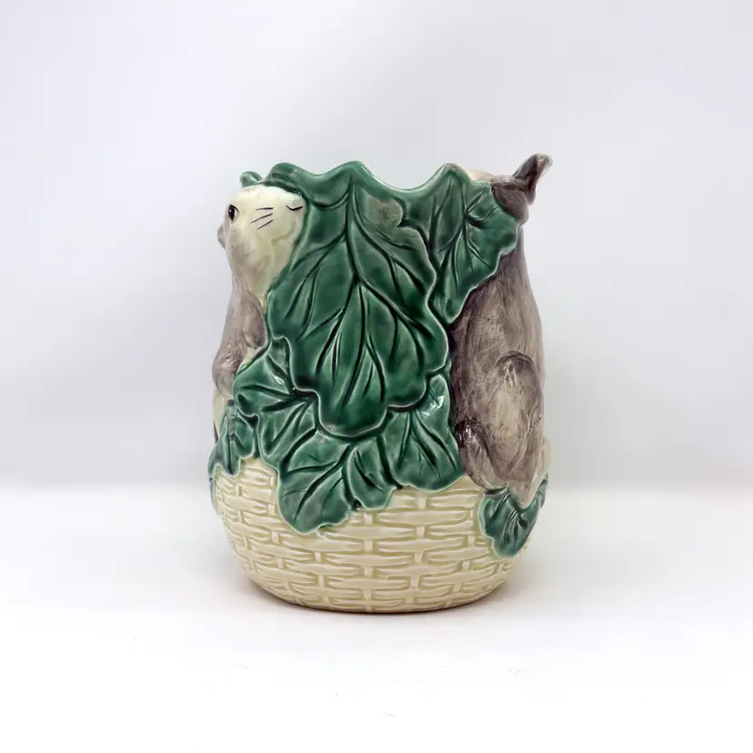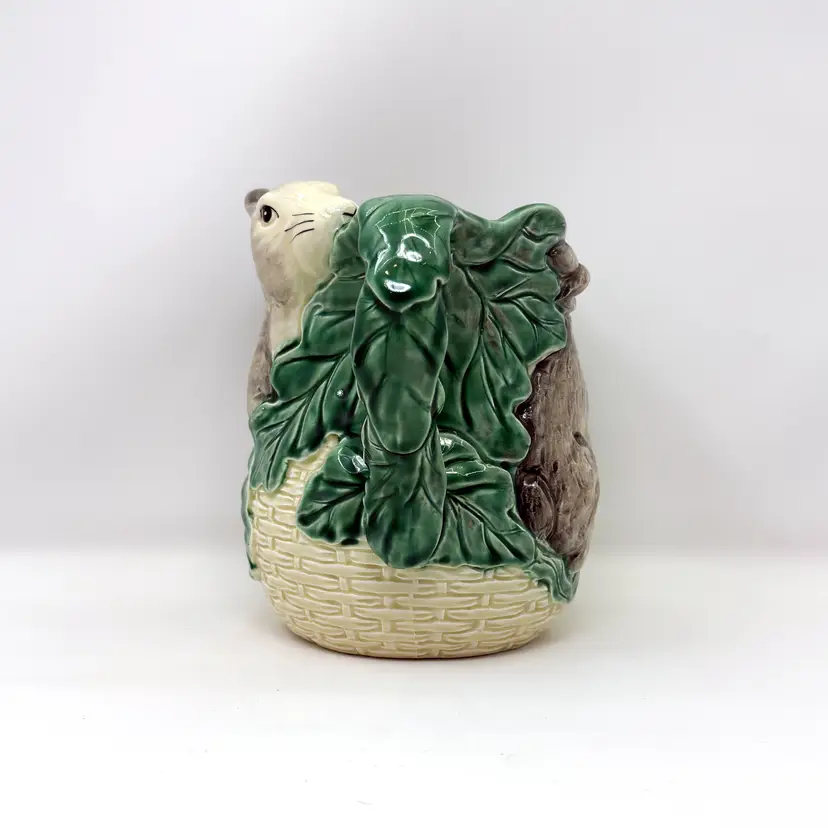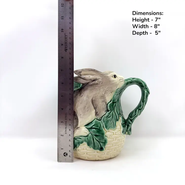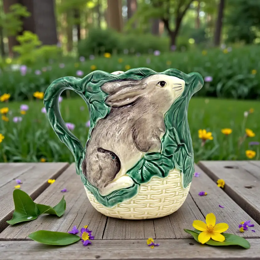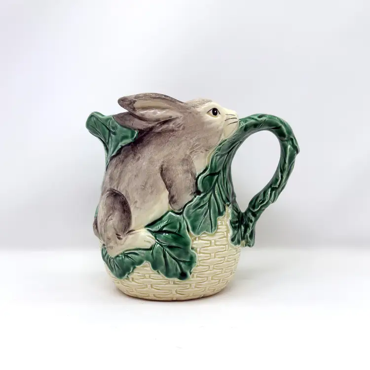 Celebrate spring with this beautifully hand-painted ceramic bunny pitcher from Takahashi San Francisco, made in Japan. Measuring 7 inches tall and richly glazed in creamy neutrals with deep green leaf accents, this sculptural majolica-style piece is a collector's favorite. The high-relief rabbit design evokes nostalgia and natural whimsy—perfect for seasonal display, Easter brunches, or year-round cottage decor.