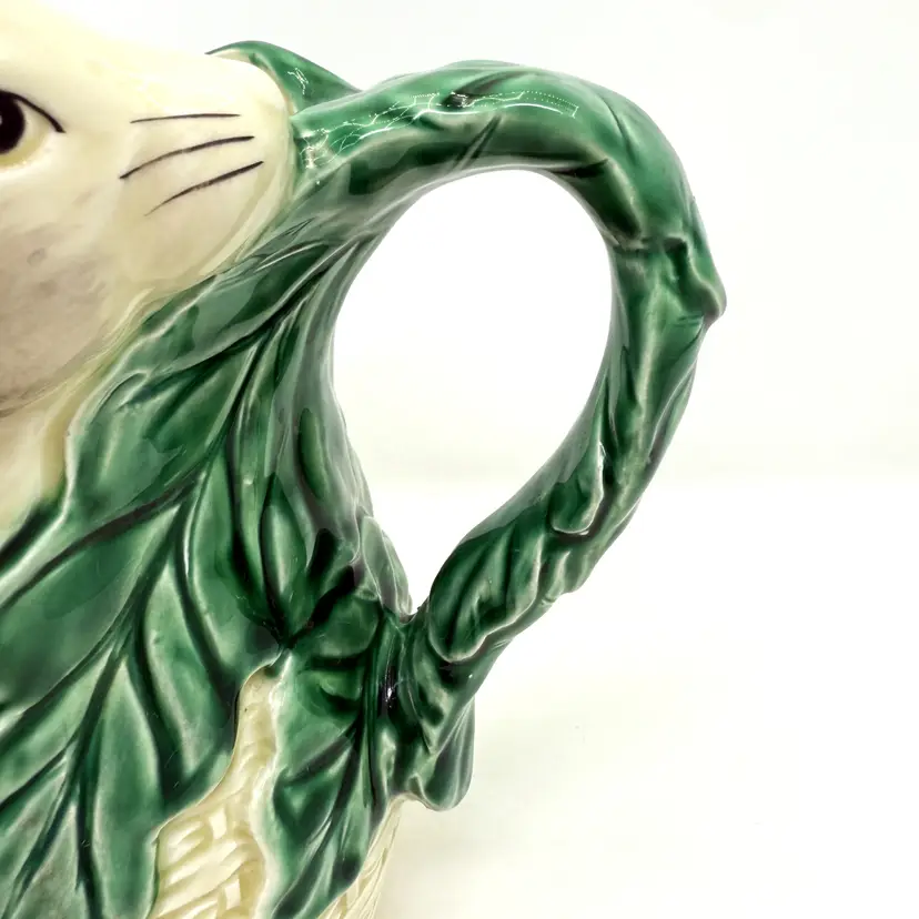 Charming hand-painted bunny pitcher by Takahashi Japan, featuring rich majolica glaze and sculpted leaves—perfect for springtime display or cottagecore charm.