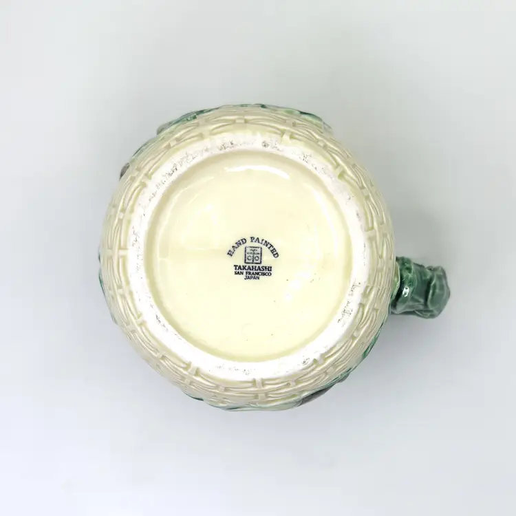 Takahashi was a noted mid-century importer of Japanese ceramics, known for whimsical, high-quality hand-painted housewares. This piece likely dates to the 1970s–1980s, and still retains its original bottom stamp. In excellent vintage condition with no chips, cracks, or repairs—only very gentle shelf wear. A standout addition to a springtime display or vintage pitcher collection.