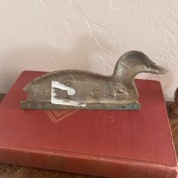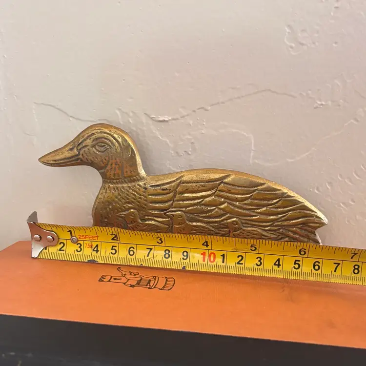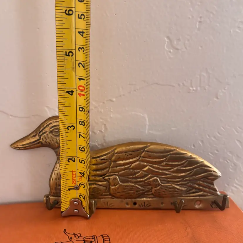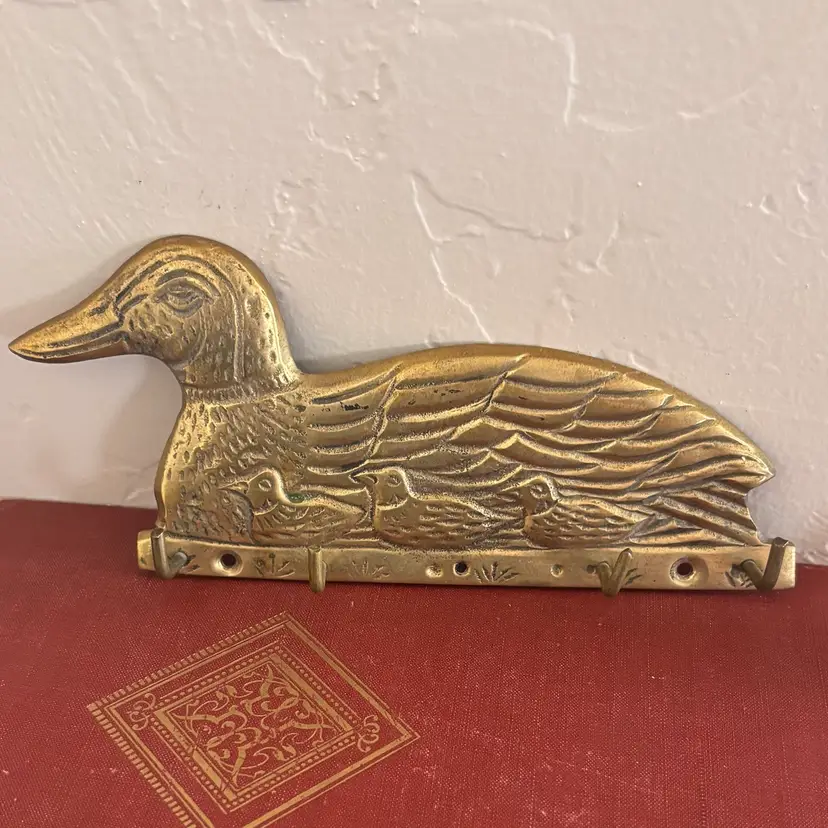 Darling brass duck hooks 3 1/2”tall x 6 1/2”long Missing middle hook and one hook is loose- still fully functional Vintage wear and patina as shown- has not been shined