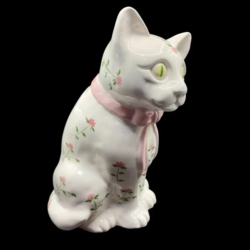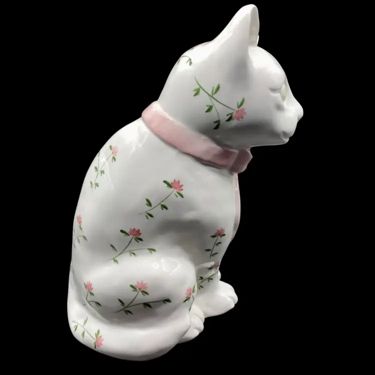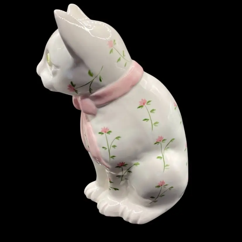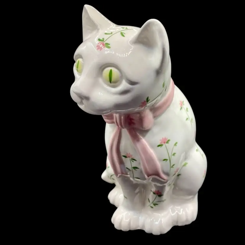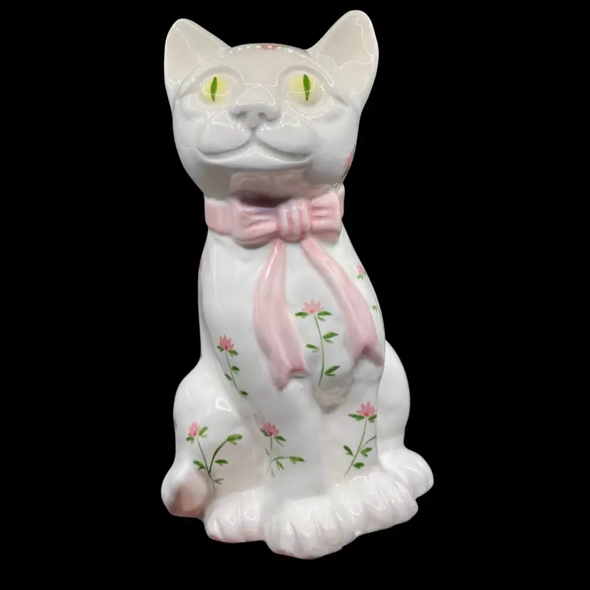This vintage ceramic figurine from Mann features a smiling cat surrounded by beautiful hand-painted pink country roses and a pink ribbon tied around its neck. The kitty's bright green eyes and alert ears make it adorable! The figurine stands at 8.5 inches tall and 5 inches wide. It was manufactured in 1982 and is in mint condition. There is some minor crazing due to age in random spots.