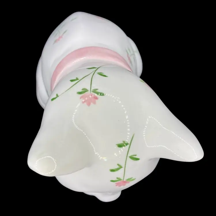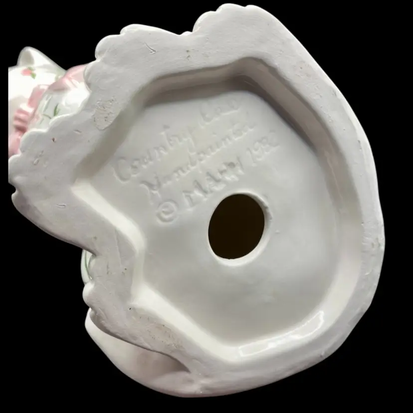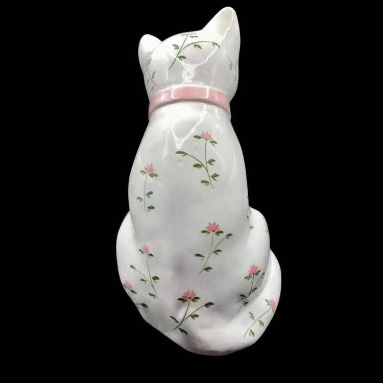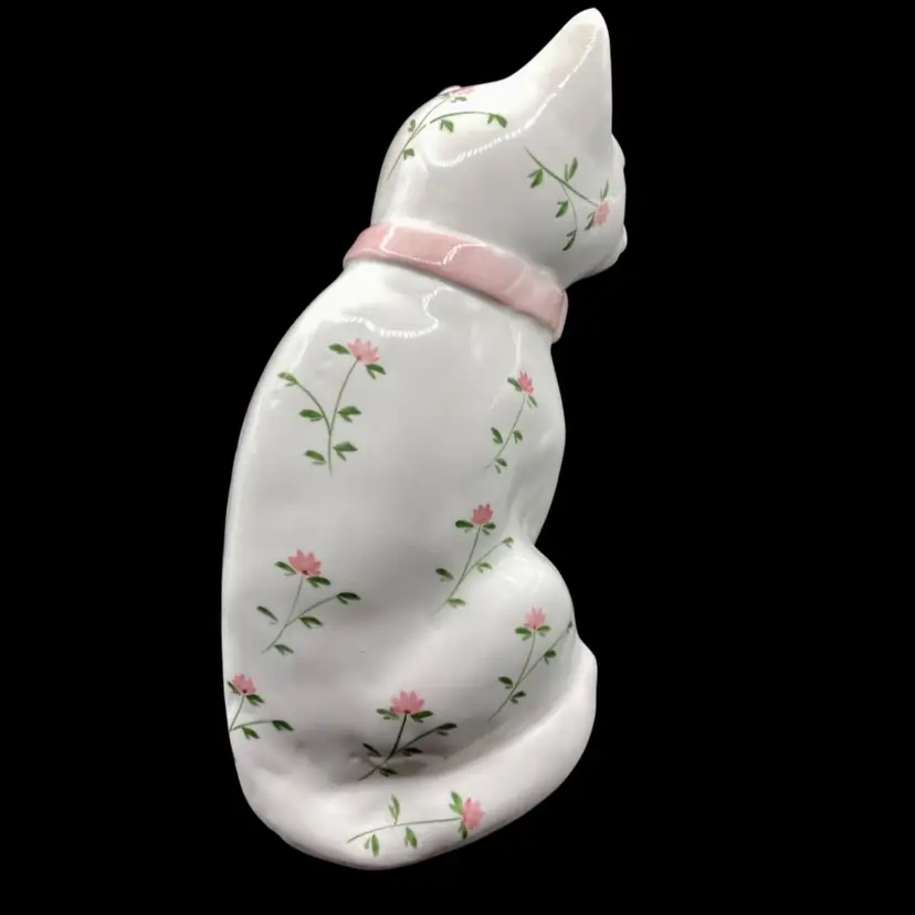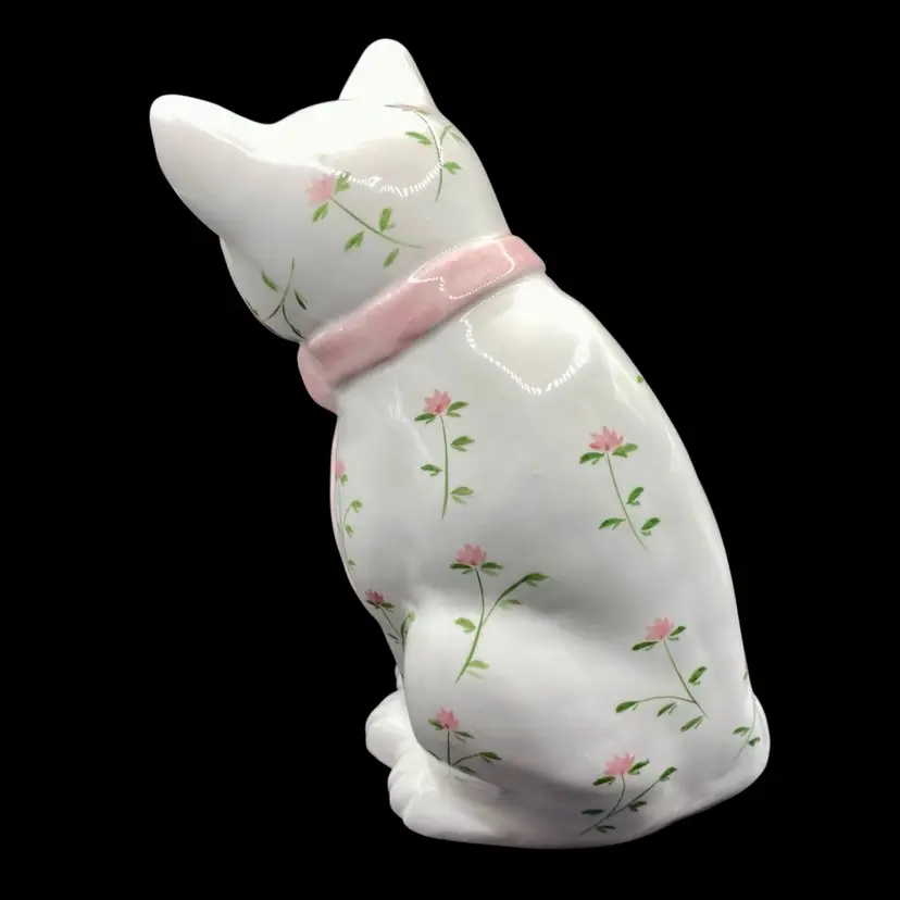 This vintage ceramic figurine from Mann features a smiling cat surrounded by beautiful hand-painted pink country roses and a pink ribbon tied around its neck. The kitty's bright green eyes and alert ears make it adorable! The figurine stands at 8.5 inches tall and 5 inches wide. It was manufactured in 1982 and is in mint condition. There is some minor crazing due to age in random spots.