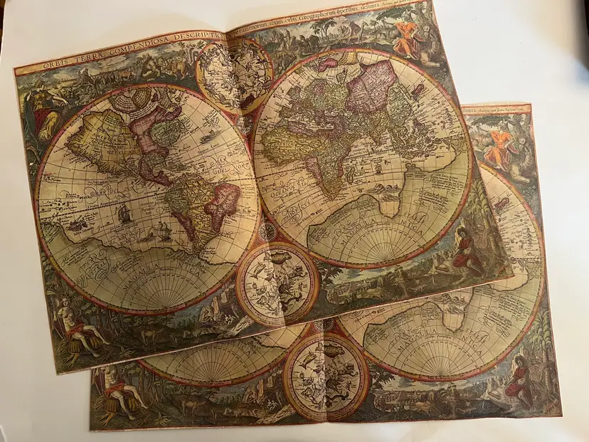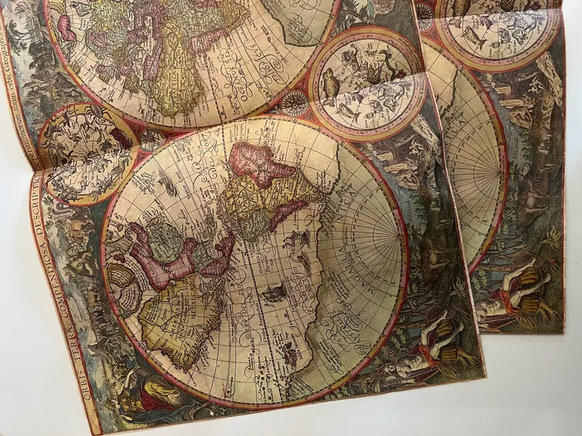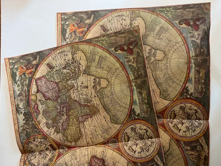 2 Antique sheets of extra large map paper from a 1950s atlas. The fronts feature old timey maps and the backs are blank. Pages are folded over as they were in the book. Laid flat each sheet measures 20.5" x 14 1/8" Both are in excellent condition