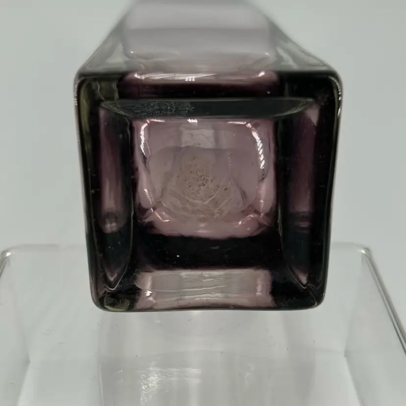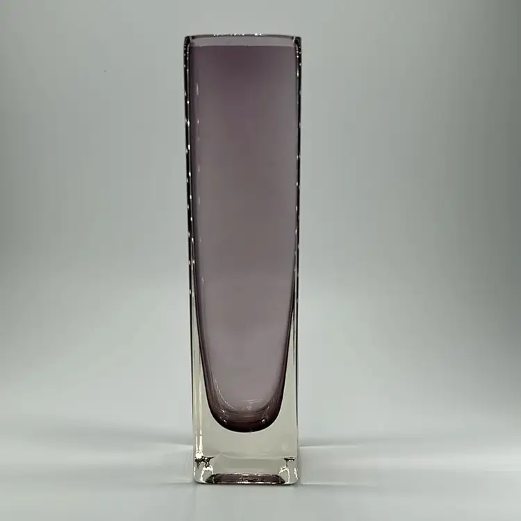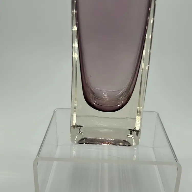 Here we have a vintage Murano glass vase featuring a purple color encased in clear glass, often referred to as a sommerso technique. It stands 7 inches tall and approximately an inch and a half across the top excellent condition no chips or cracks.