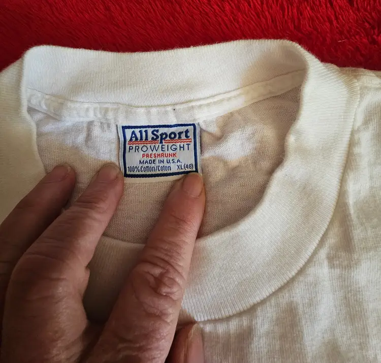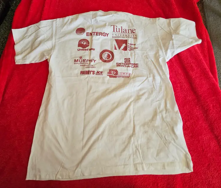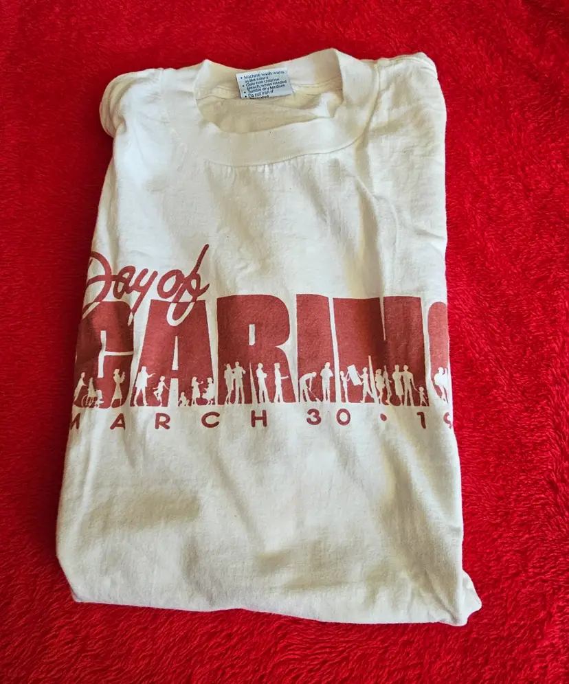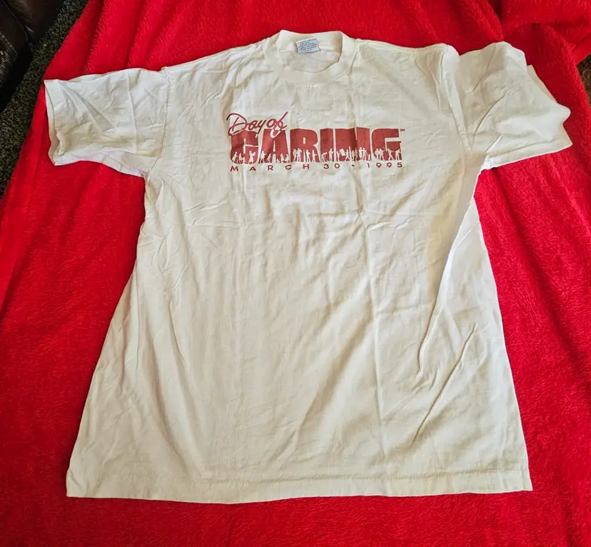 This Vintage March 30, 1995 Day of Caring Men’s T-Shirt in size XL features a graphic print design that is perfect for the summer, fall, and spring seasons. Made of cotton material, this short sleeve shirt is machine washable and has a regular fit. It is a vintage piece from the 1990s, manufactured by All Sport in the United States. This multicolor t-shirt is a unique addition to any man's wardrobe, representing a day of caring and community from over two decades ago.