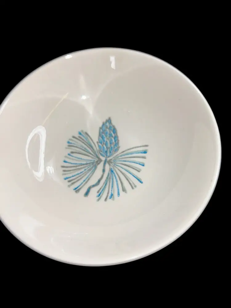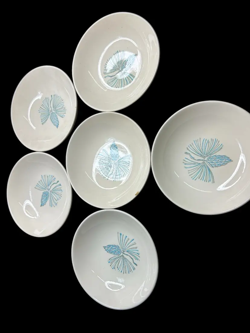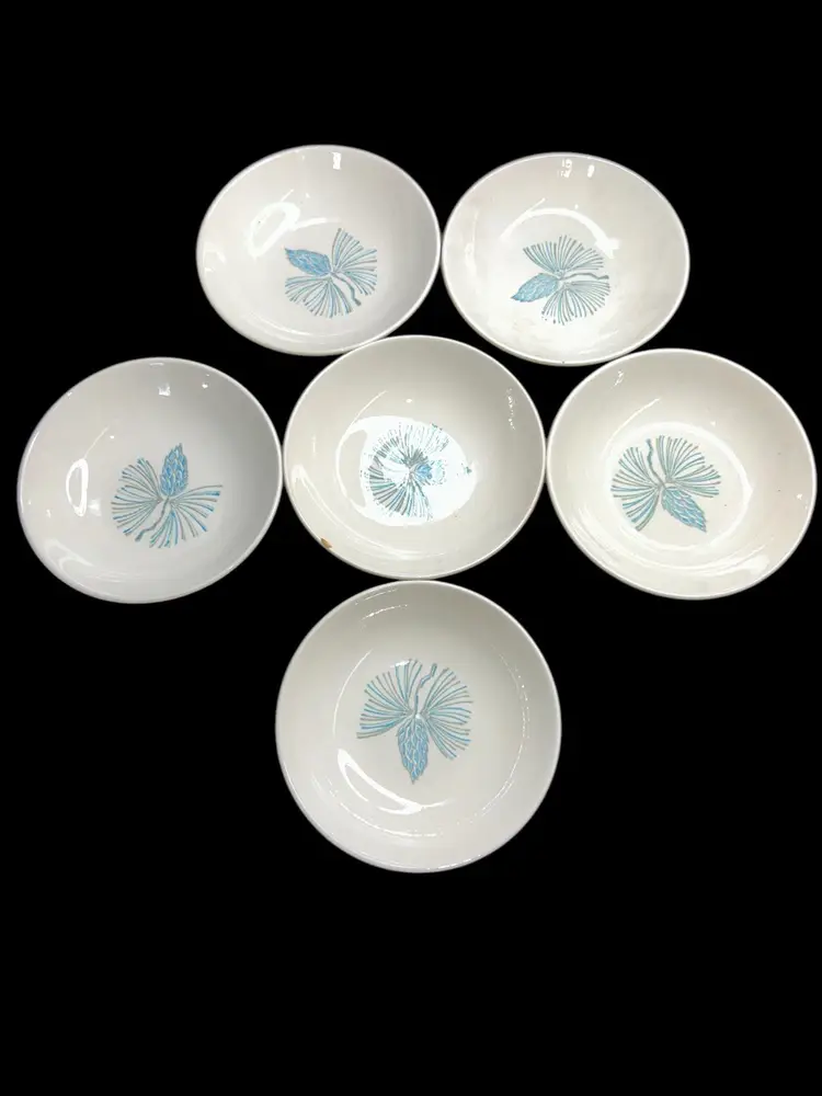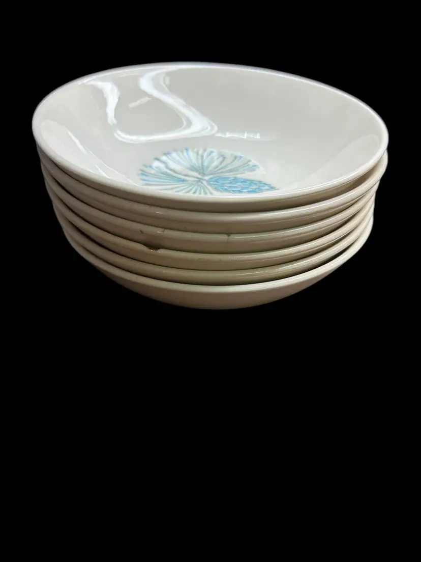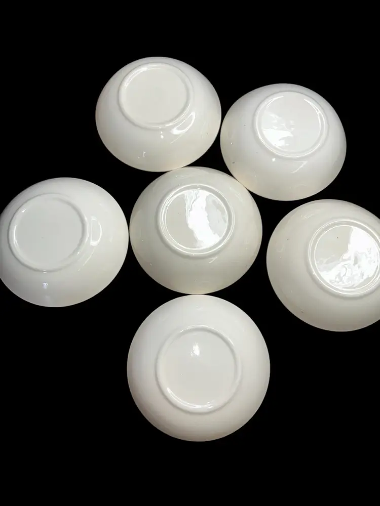 Set of 6 berry bowls, 5.25” diameter. Two have crazing on bottom. One has a chip on the edge. These issues are shown in the photos. Most are in very good condition.