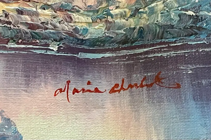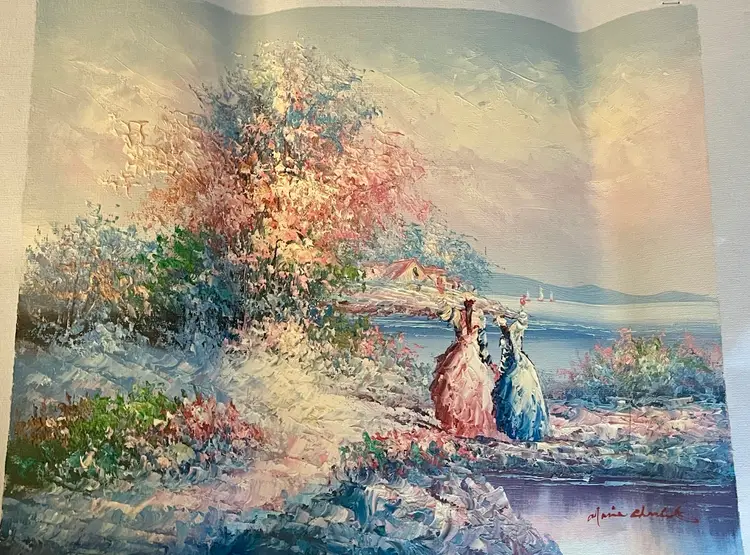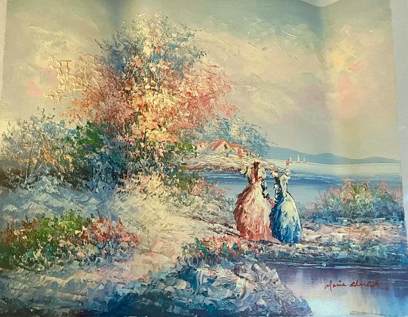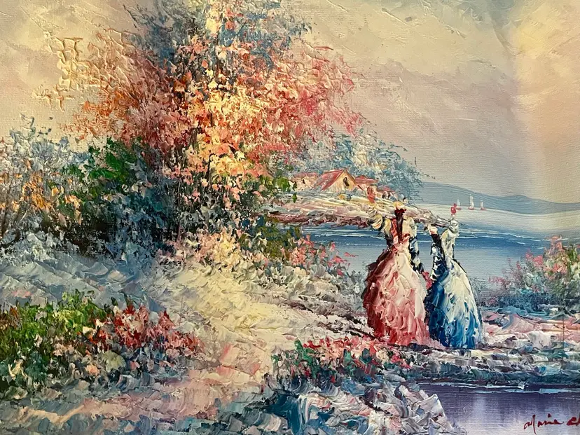 This is an oil painting signed "Marie Charlot," depicting a scene with two women near a body of water,m. "Marie Charlot" is a pseudonym used by Collector's Corners Inc. from the 1960s to 1970s for hand-painted art.