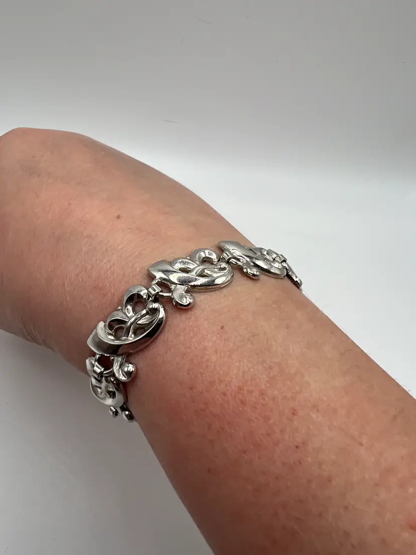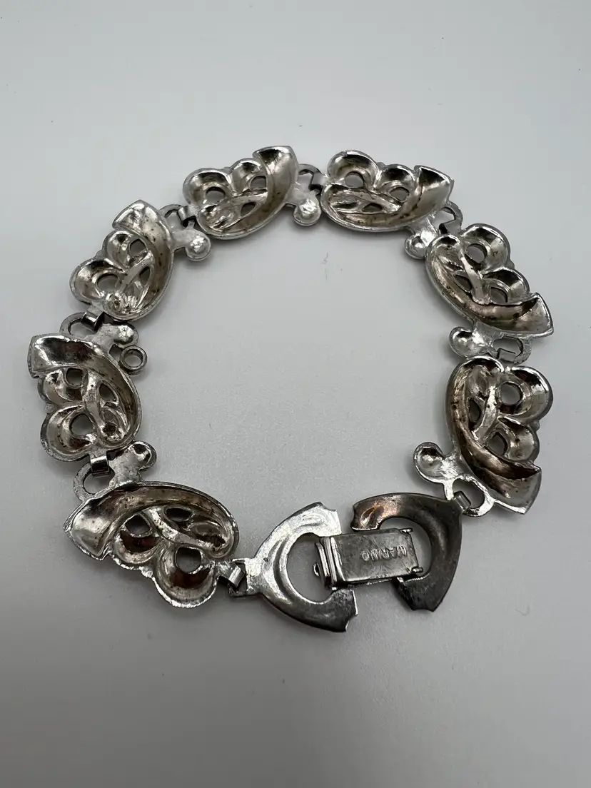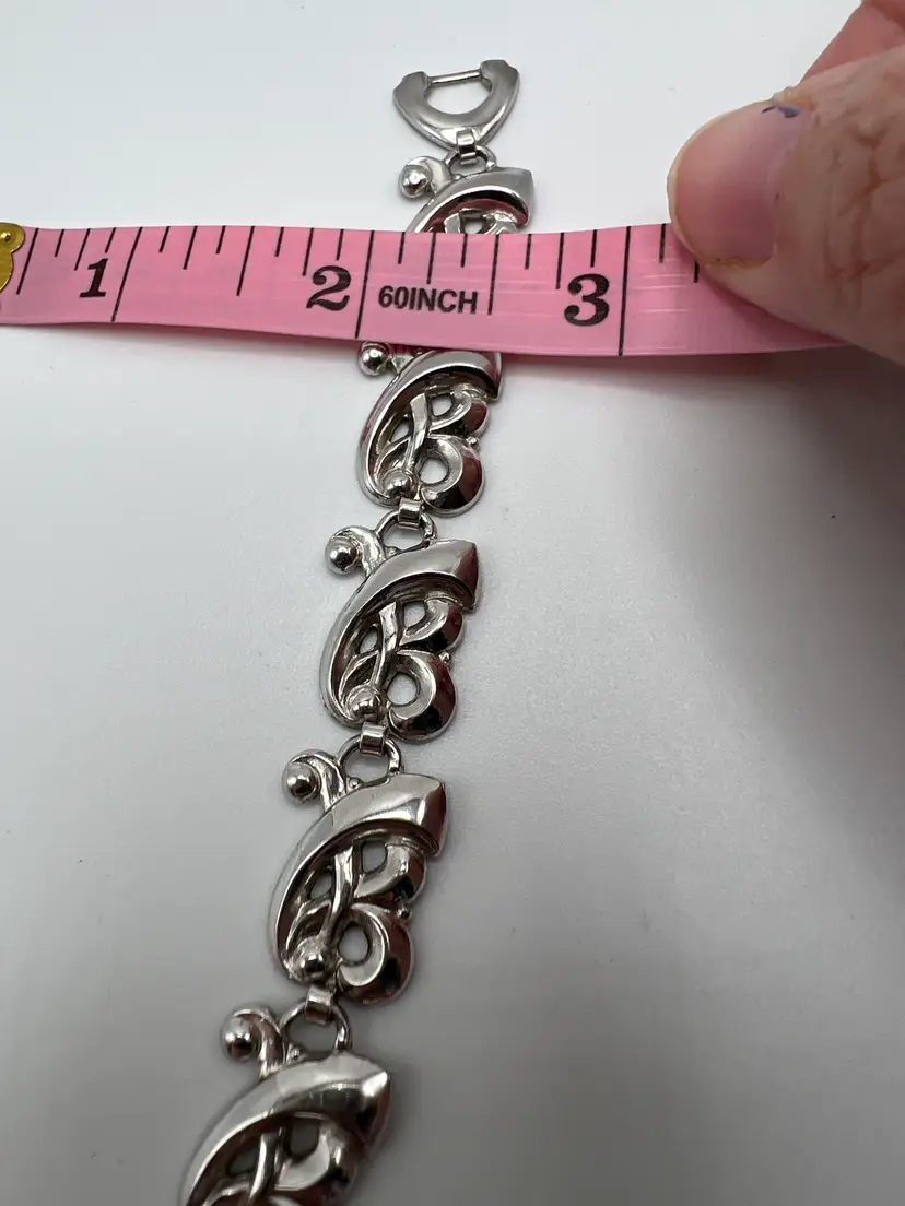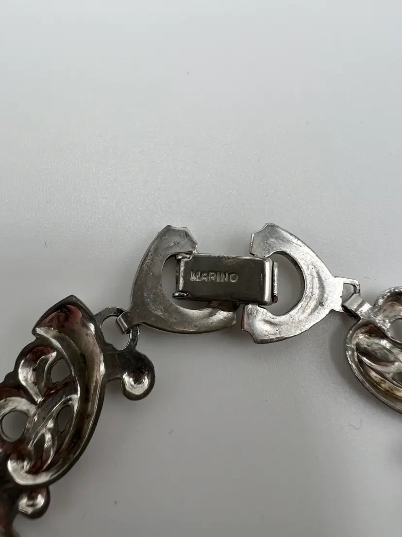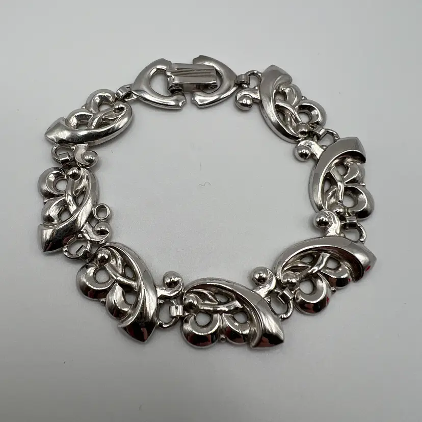 Measurements: Fits up to approx. 6.5" wrist comfortably. I am not sure of exact decade pieces were made from the 30s-80s. The look of it though leans more early eras 30s-50s then late 70/80s Condition: Vintage condition with visible wear. Notable pitting and darkening on the underside/back of links; front-facing side presents well when worn. Vintage Marino silver tone bracelet featuring an ornate scroll link design with a baroque, romantic aesthetic. The dimensional links give it a bold, decorative look while still being lightweight and wearable. This is a great “looks good on” piece—wear is mostly concentrated on the underside, making it ideal for styling without sacrificing visual impact.