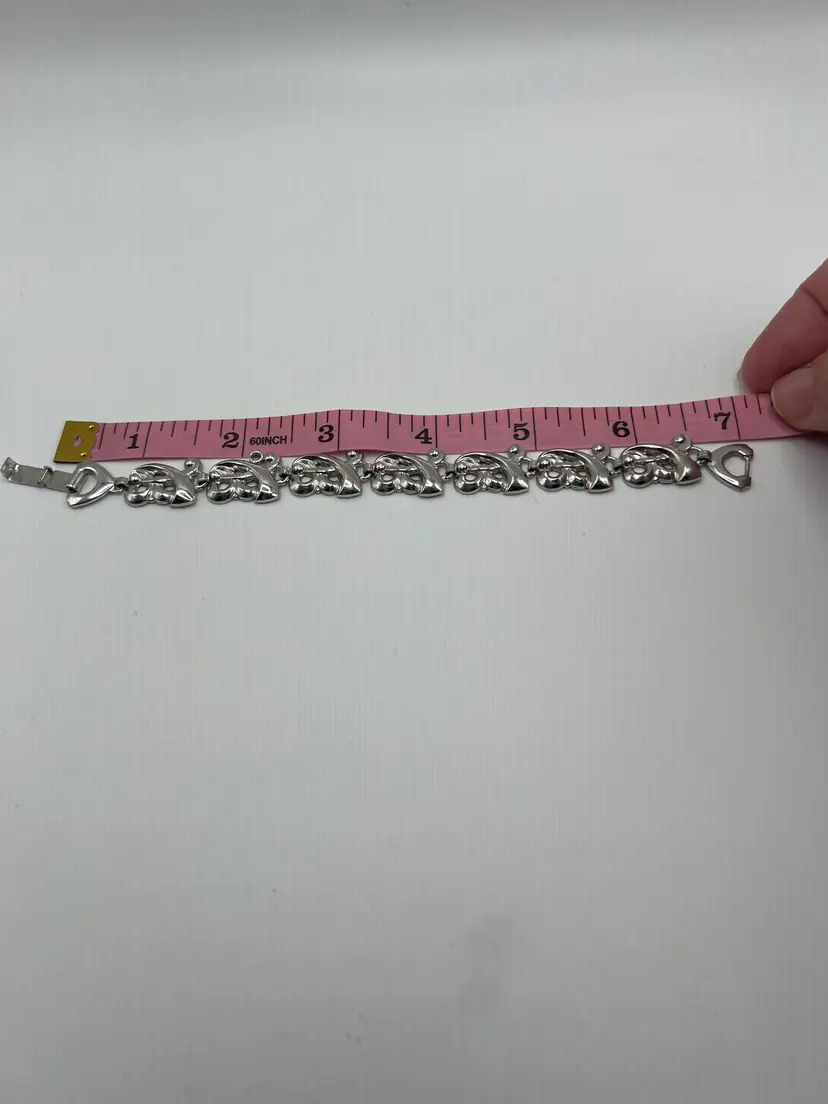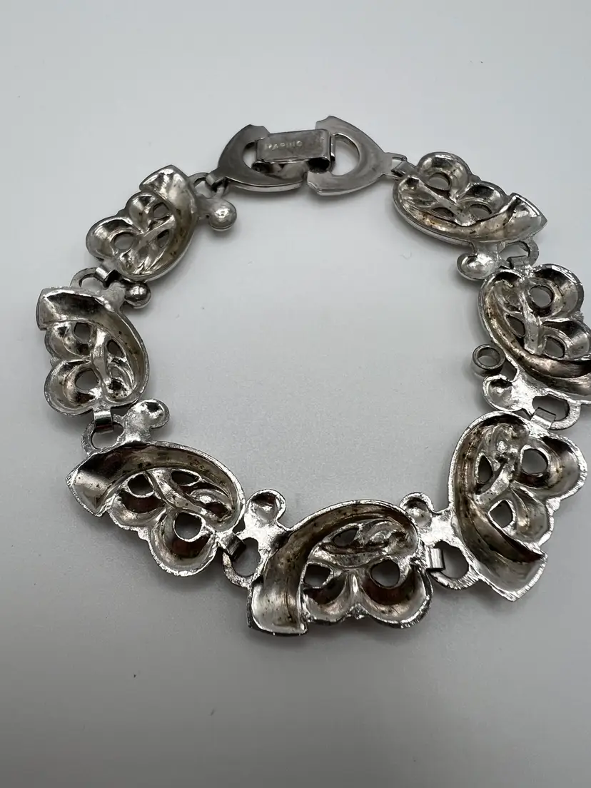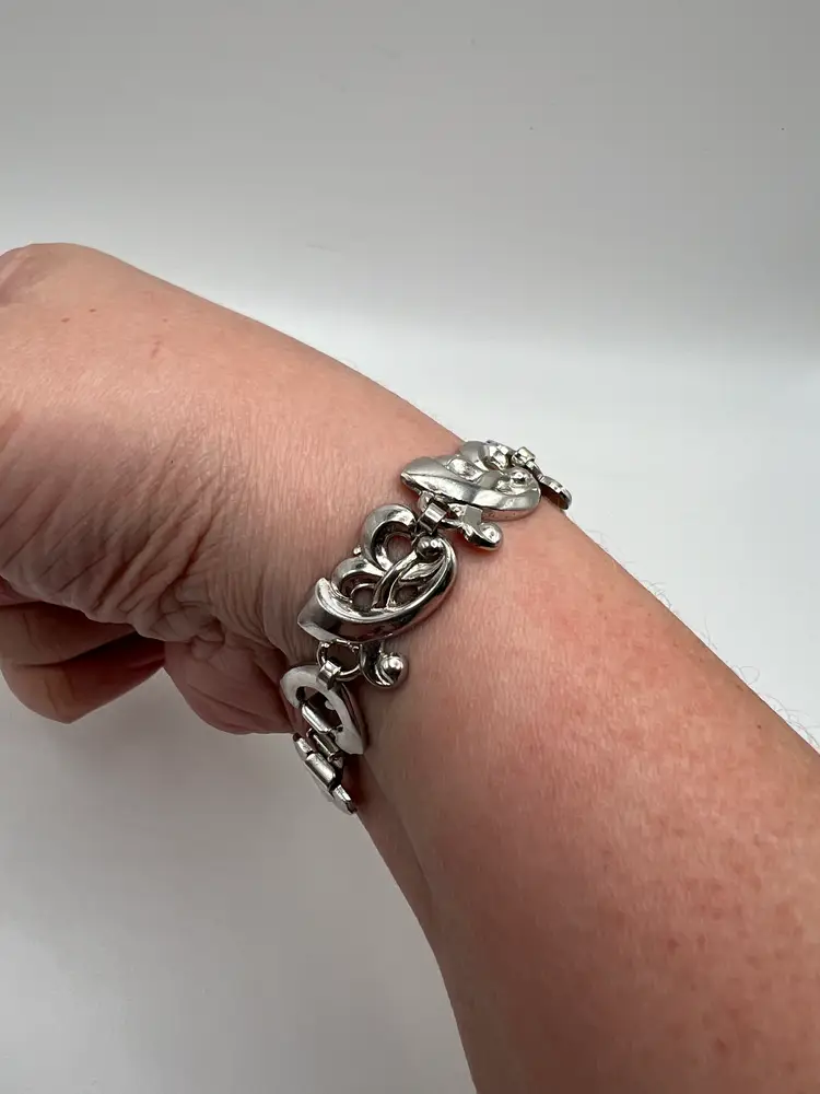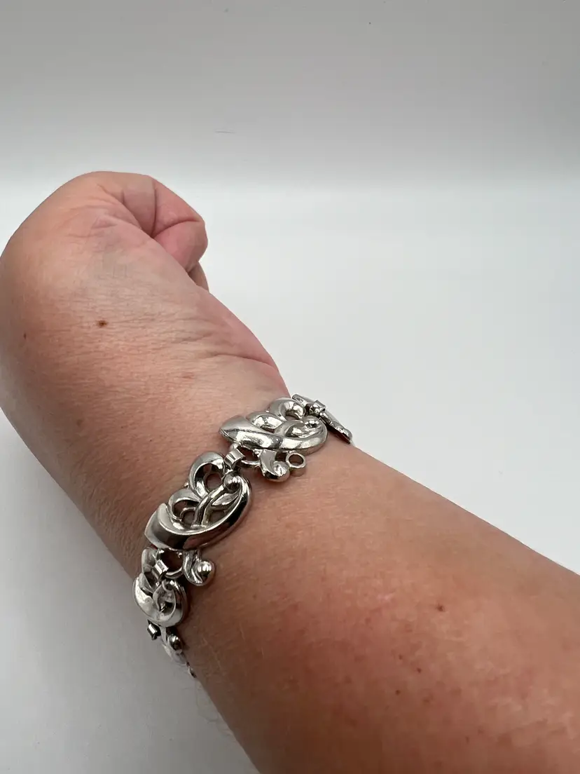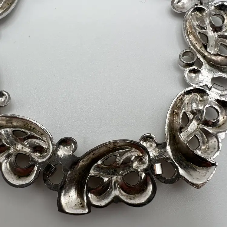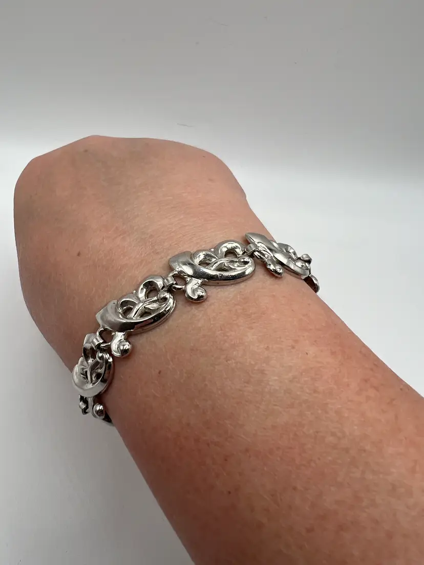 Measurements: Fits up to approx. 6.5" wrist comfortably. I am not sure of exact decade pieces were made from the 30s-80s. The look of it though leans more early eras 30s-50s then late 70/80s Condition: Vintage condition with visible wear. Notable pitting and darkening on the underside/back of links; front-facing side presents well when worn. Vintage Marino silver tone bracelet featuring an ornate scroll link design with a baroque, romantic aesthetic. The dimensional links give it a bold, decorative look while still being lightweight and wearable. This is a great “looks good on” piece—wear is mostly concentrated on the underside, making it ideal for styling without sacrificing visual impact.