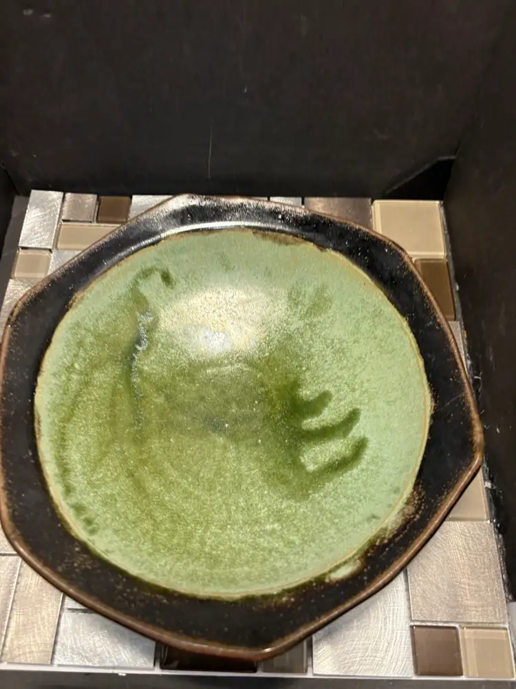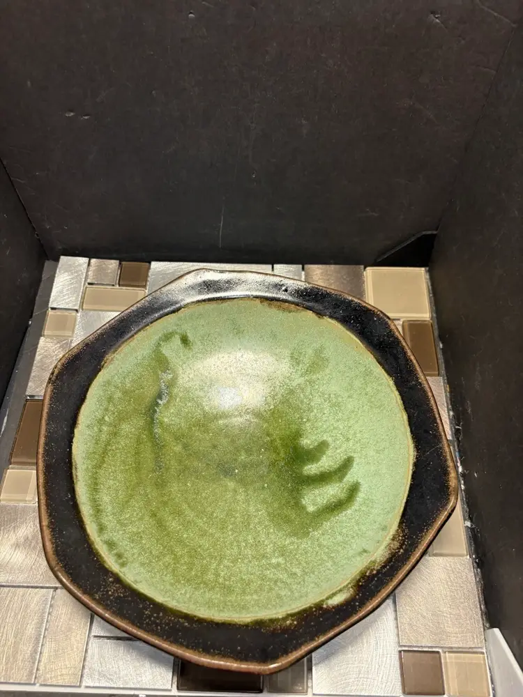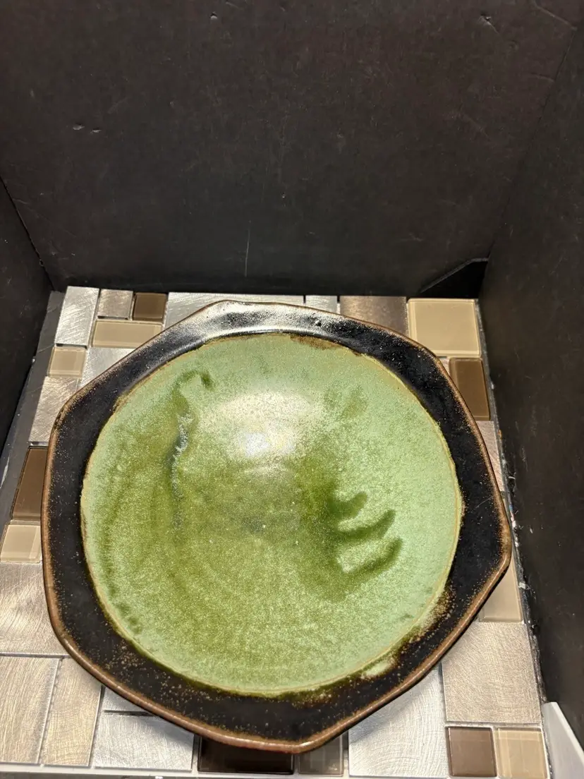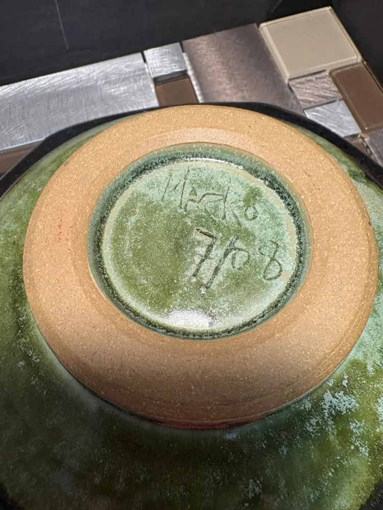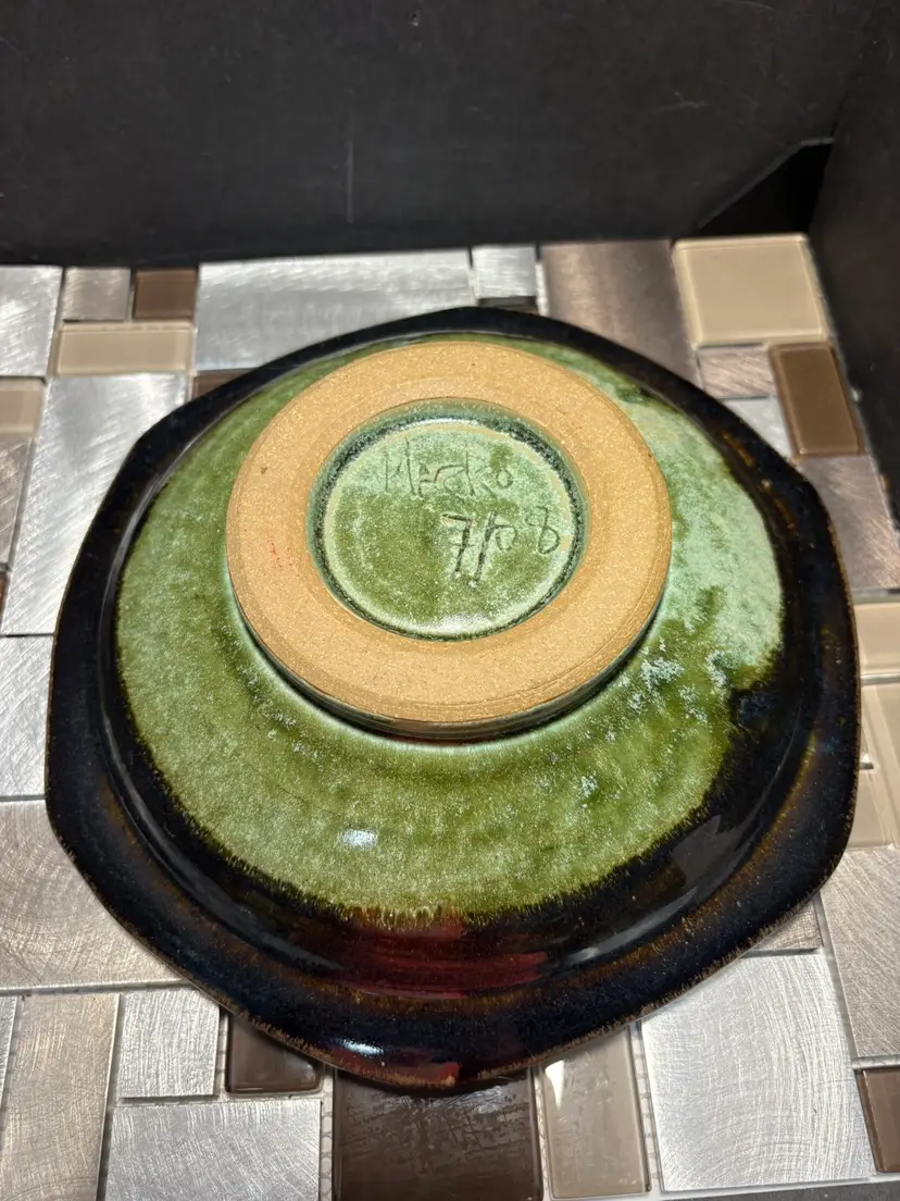This vintage MARKO pottery bowl is a stunning piece of art that would make a great addition to any collection. The green and brown colors create a beautiful contrast that is sure to catch the eye of any viewer. The bowl is signed and made of stoneware, making it a unique and valuable item.