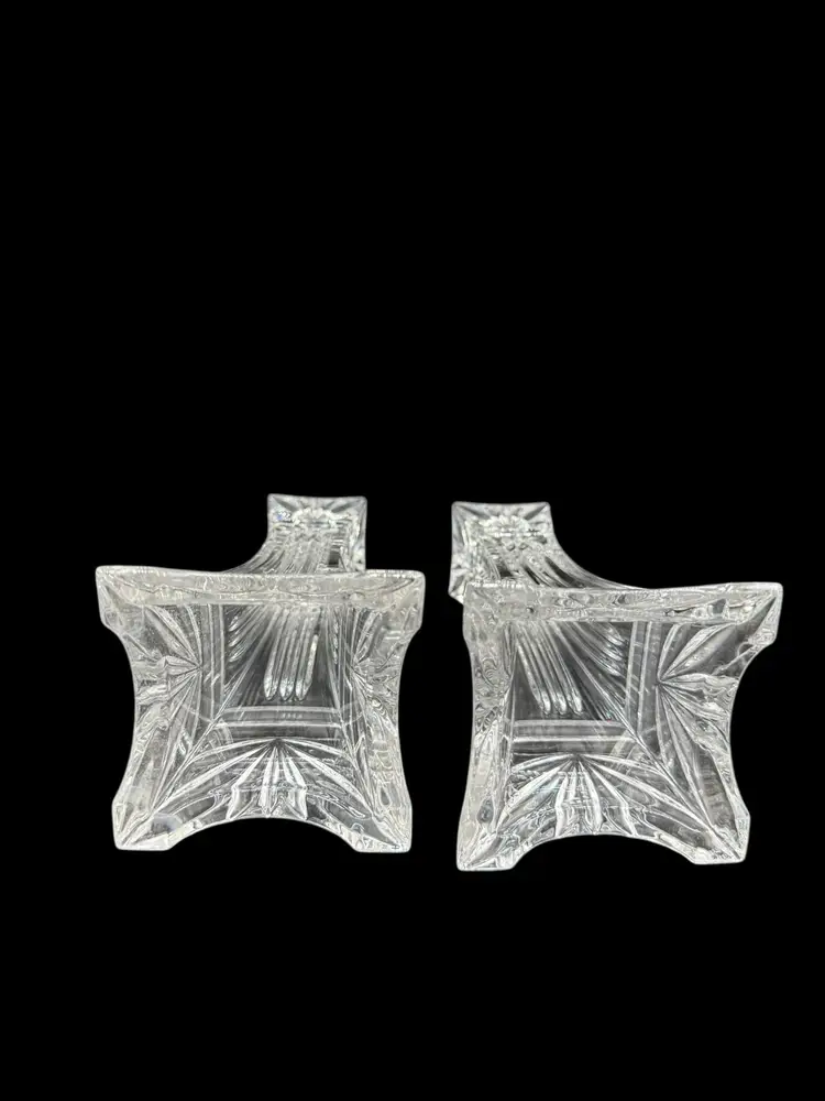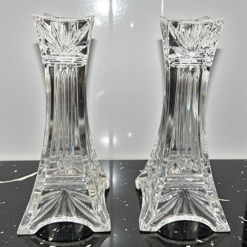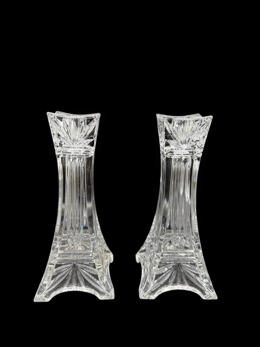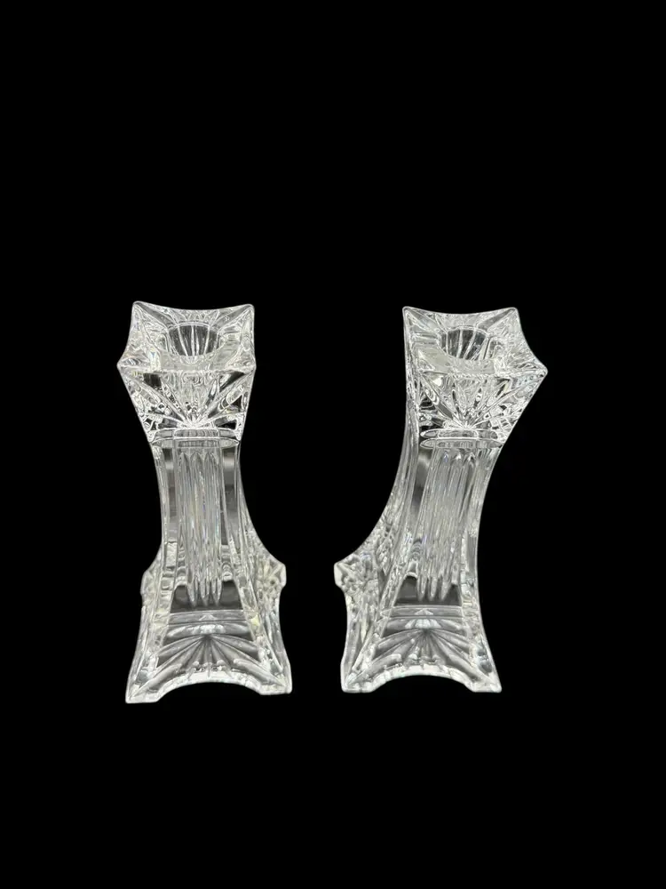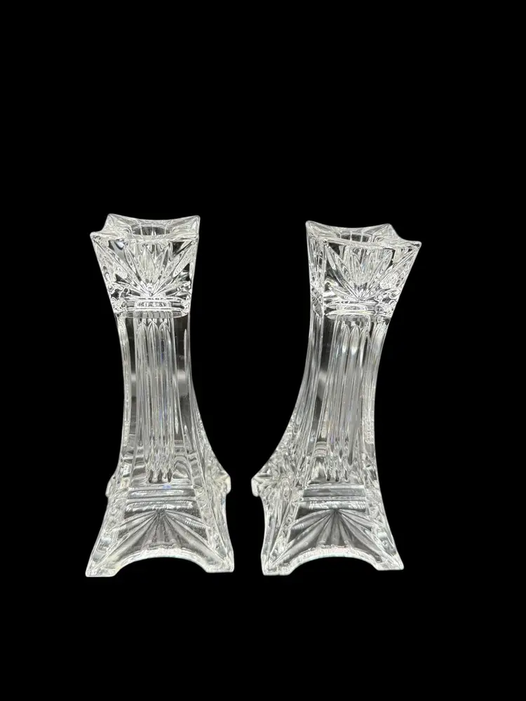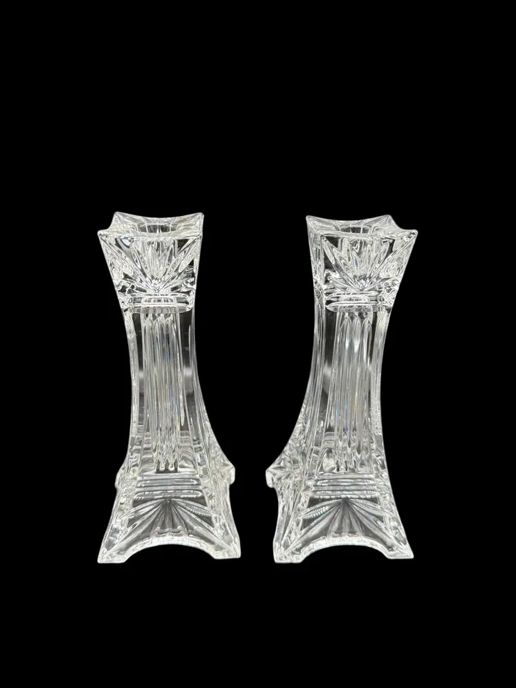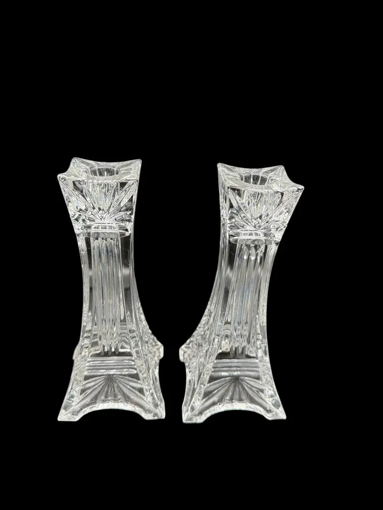The Vintage Marquis By Waterford Odyssey Clear Crystal Candle Holder set of 2 features a timeless and elegant design, perfect for adding a touch of romance to any decor. Standing at 7 inches tall and made of crystal, these candle holders are suitable for taper/dinner candles and are ideal for Valentine's Day or any other romantic occasion. The Odyssey pattern and Eiffel Tower subject evoke a sense of European charm and classic elegance, making them a beautiful addition to any home.