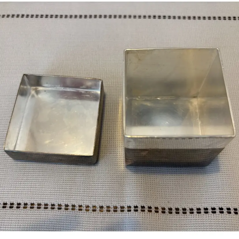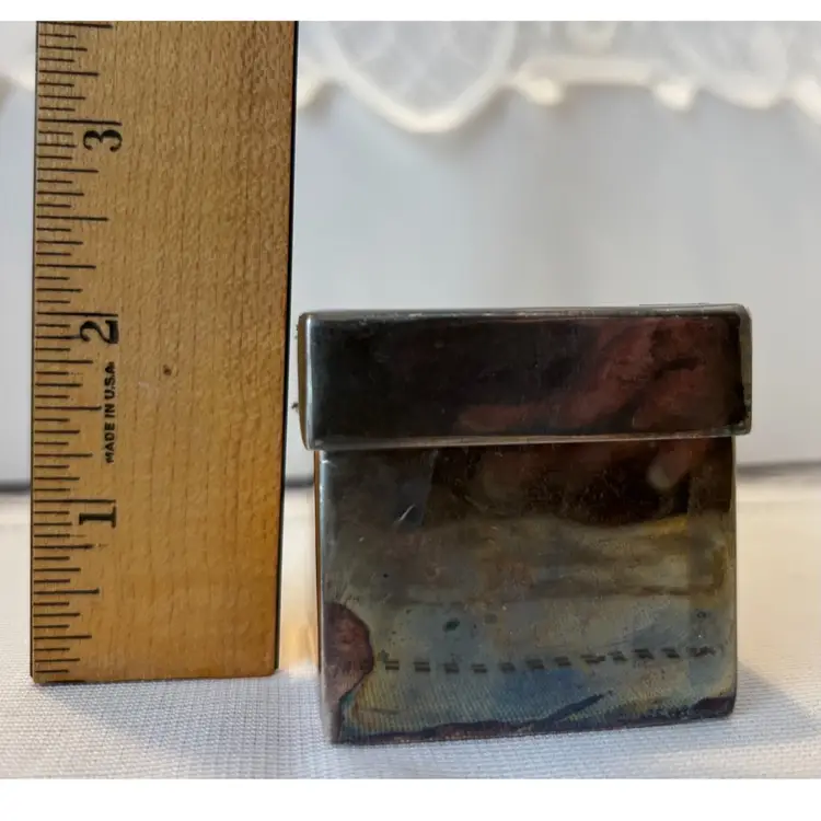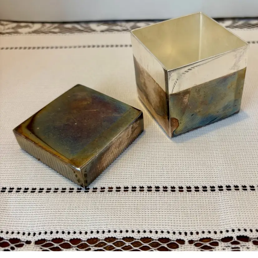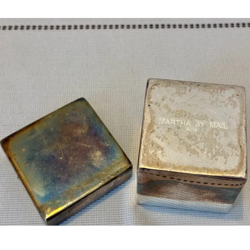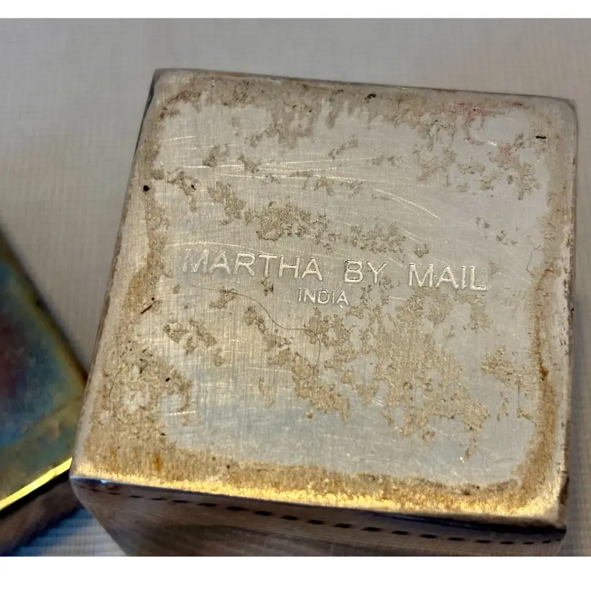 Approx. 2.25” squared Vintage "Martha by Mail" silver plated trinket box with lid , part of a highly sought after product line from Martha Stewart's former mail-order catalog business "Martha by Mail" operated from 1996 to 2004, offering high-quality home goods and collectibles. Items from this catalog are considered valuable collectibles among fans! The text "INDIA" indicates the country of origin for this specific piece