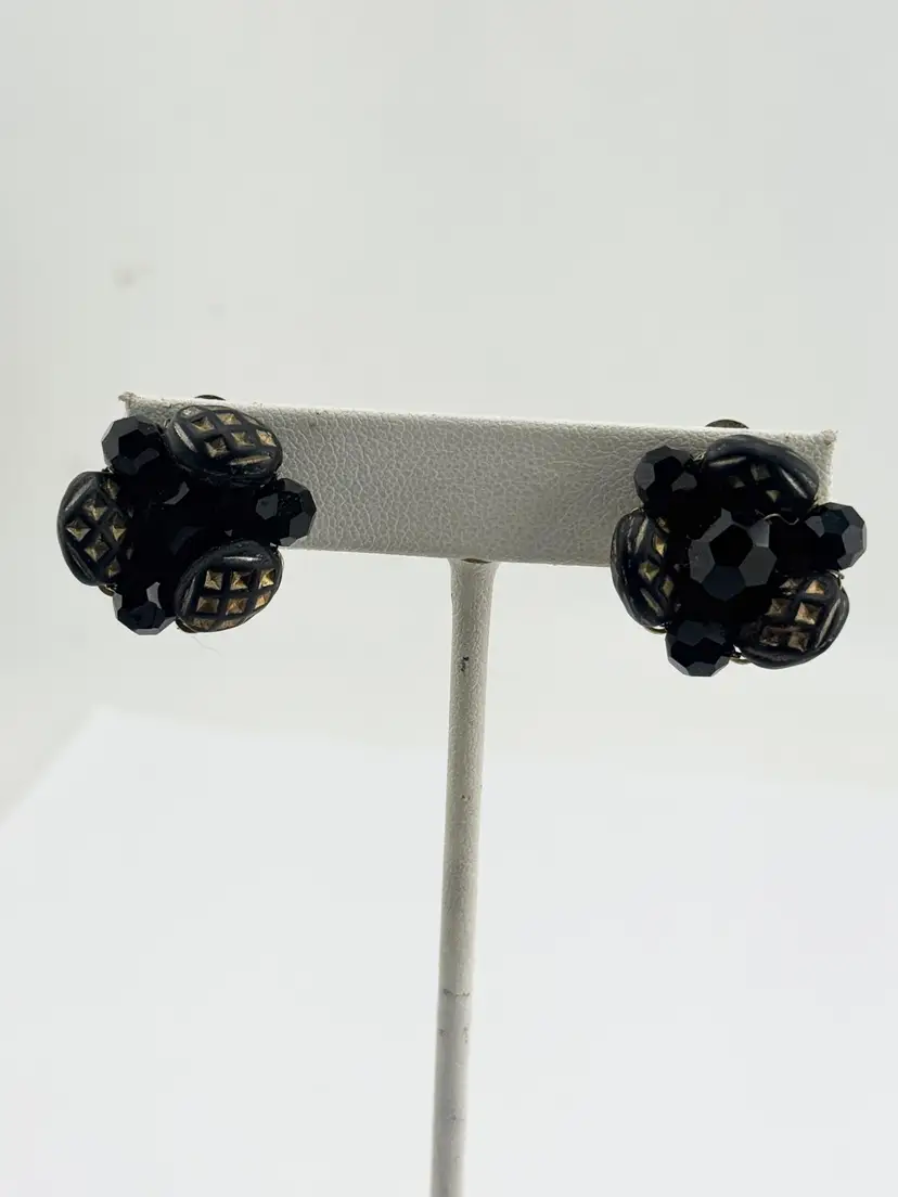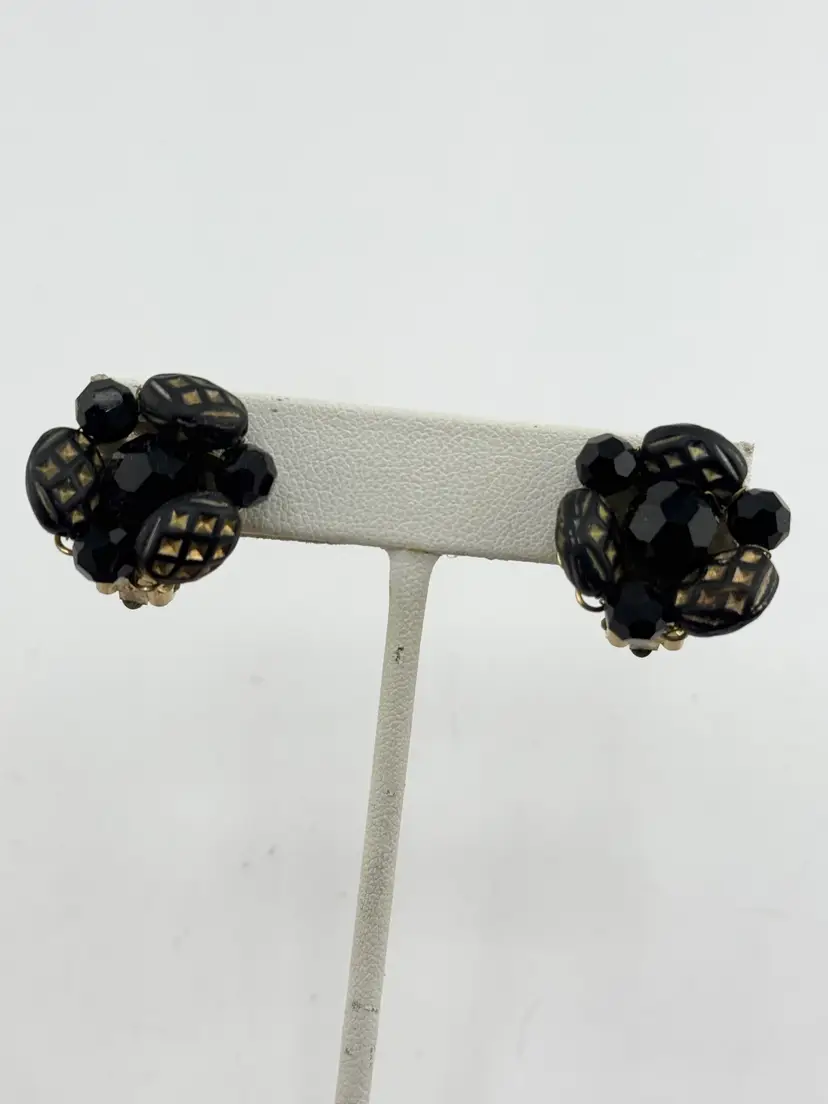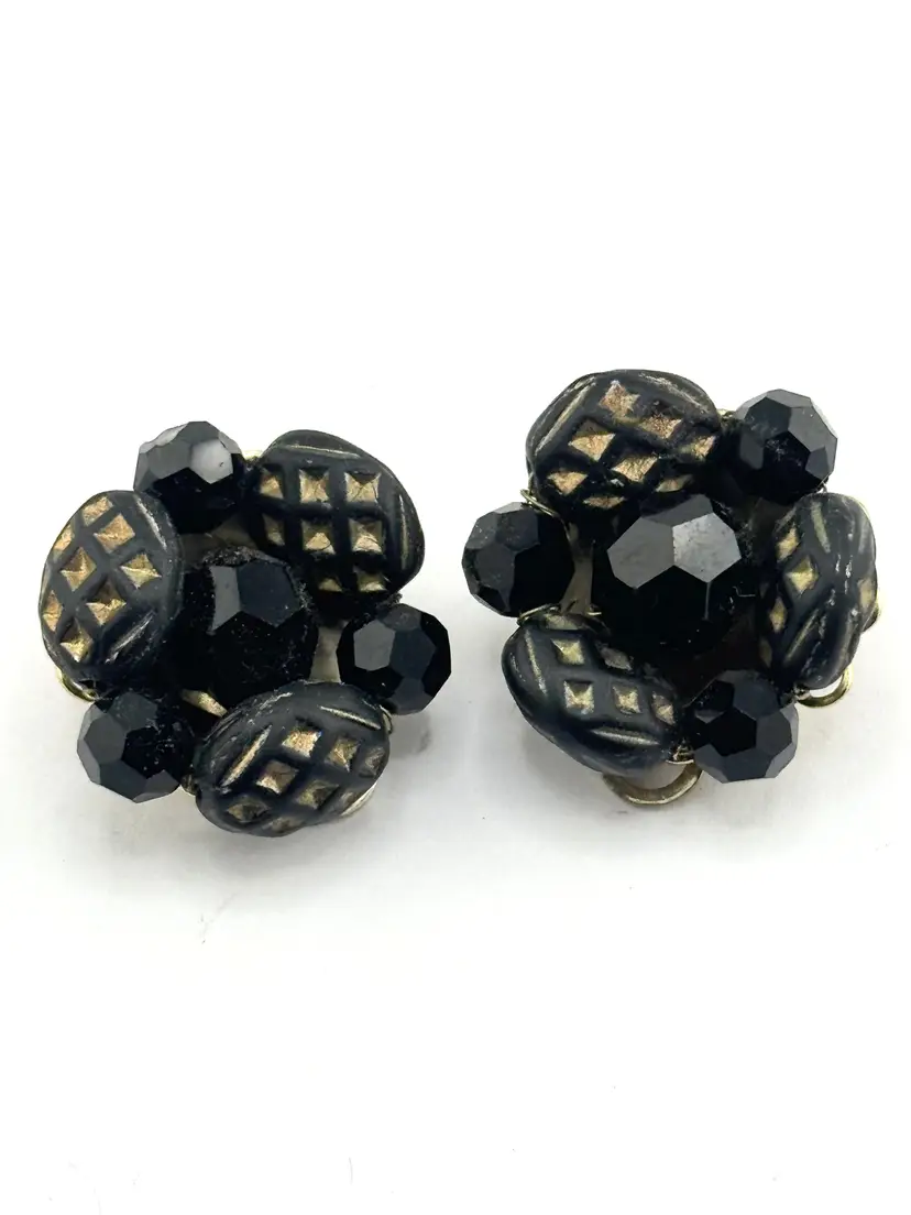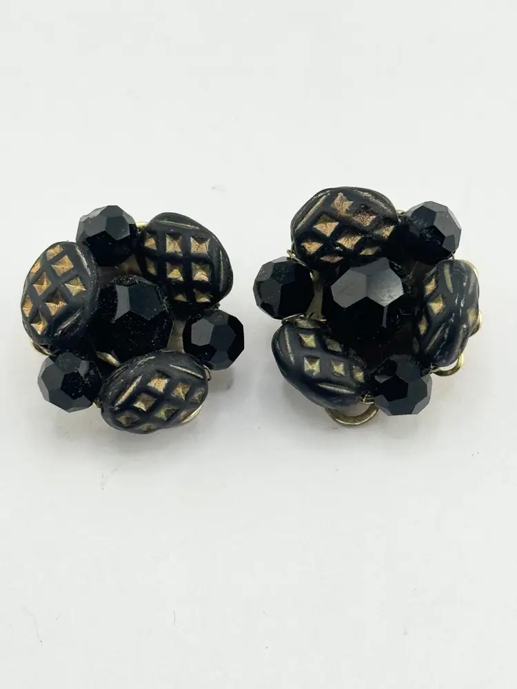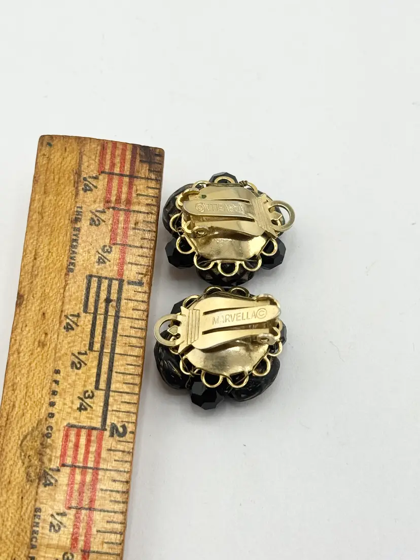 Vintage Marvella black crystal glass clip on earrings. Signed Marvella. Clip on vintage earrings with black glass stones and crystals. Hand wired earrings. MN53T.