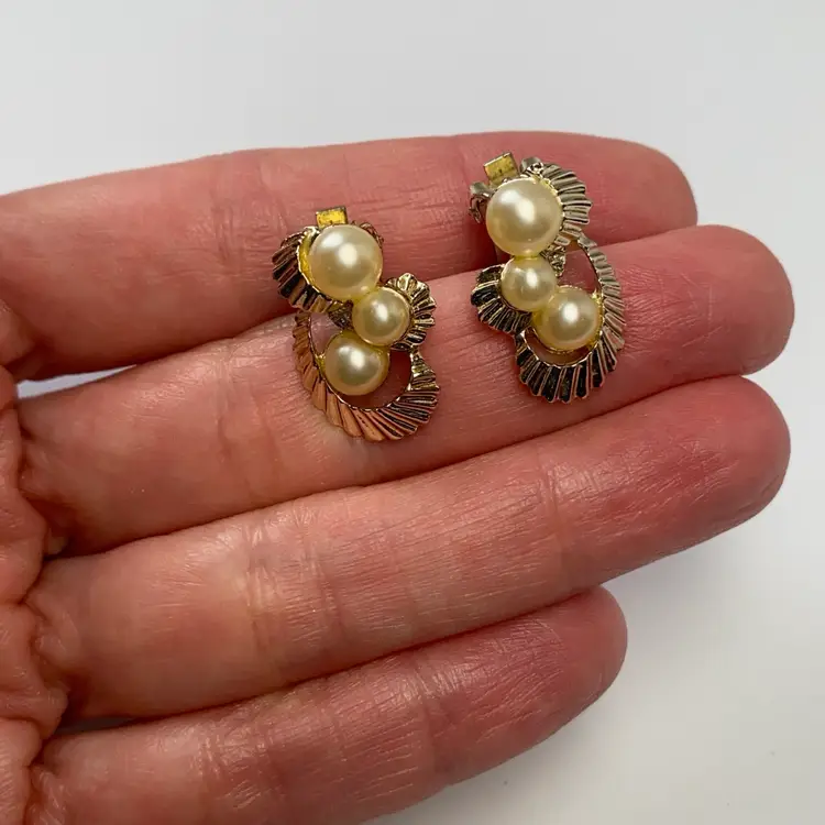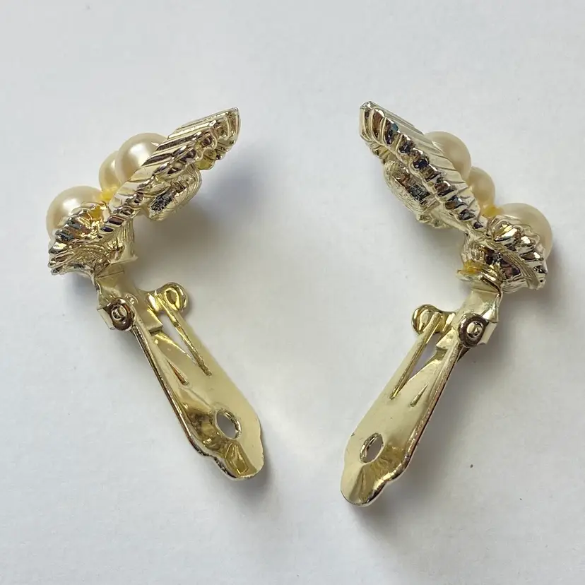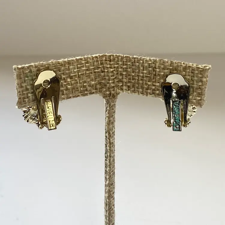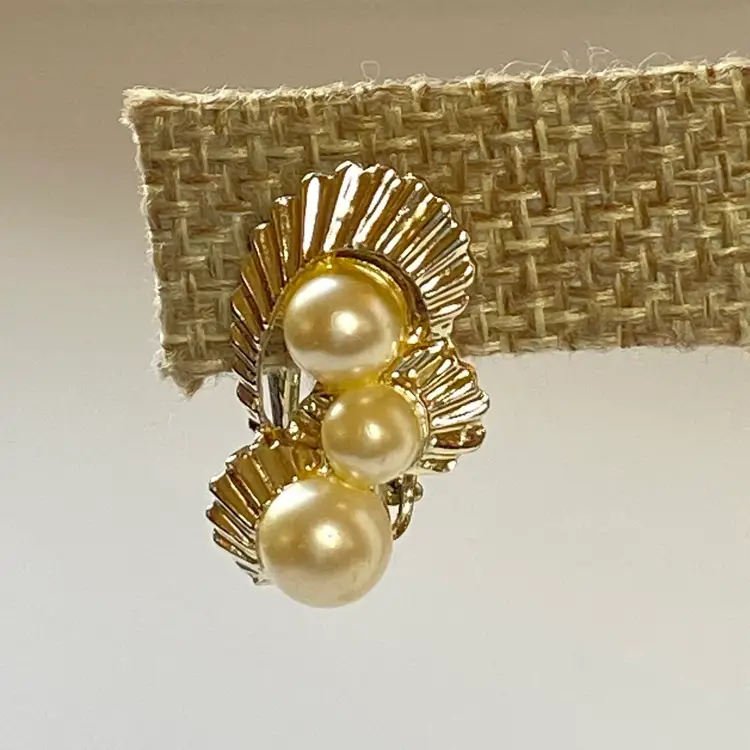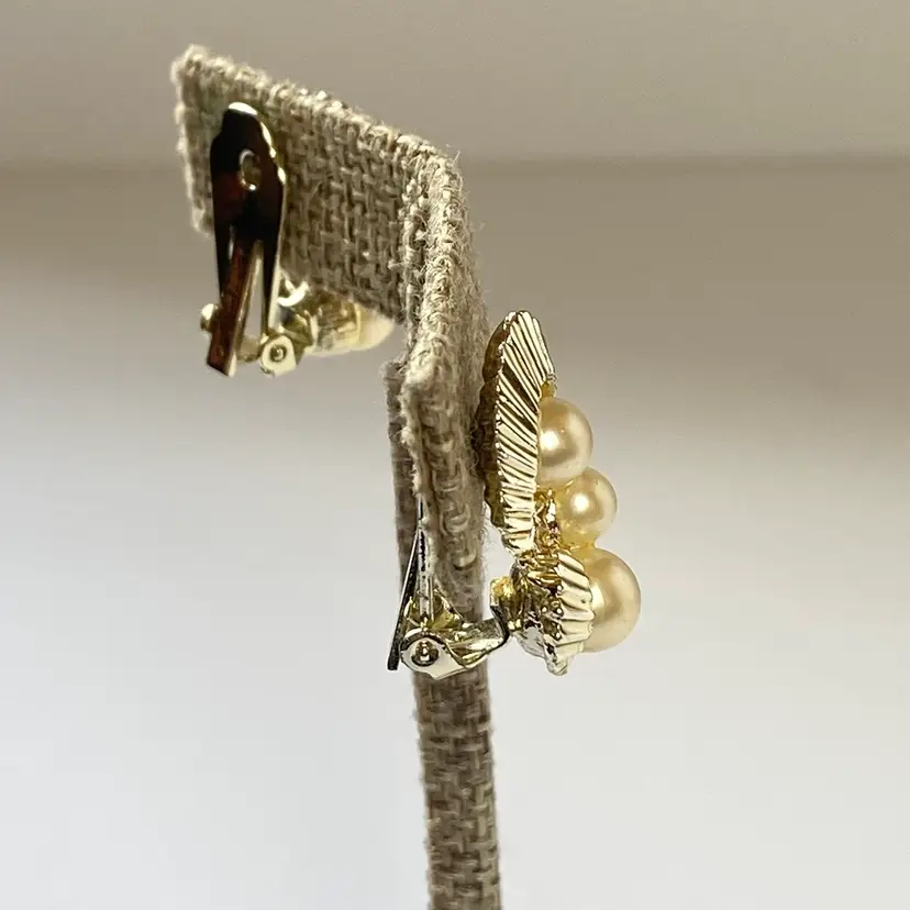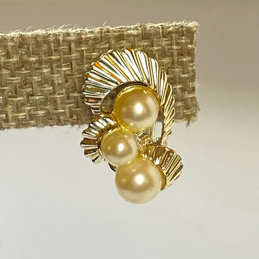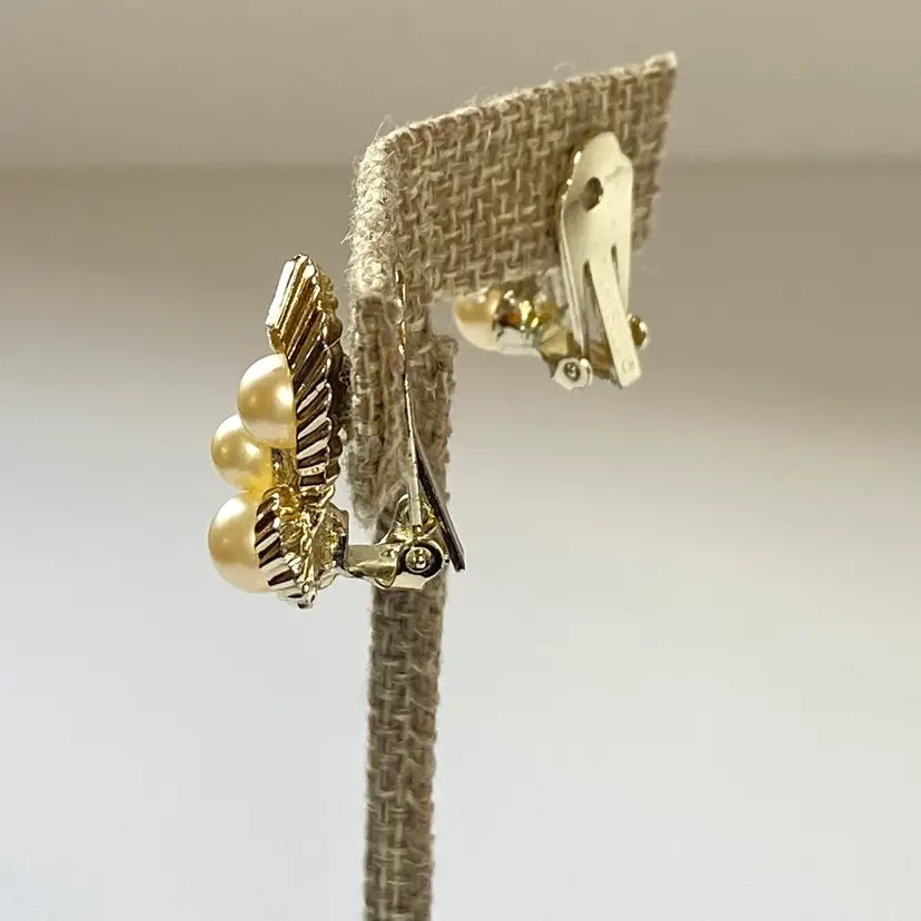 Add a touch of retro glamour to your outfit with these vintage Marvella clip-on earrings. The earrings feature beautiful cream imitation pearls mounted on a gold tone ribbon with a clip-on closure. The earrings are a great addition to any jewelry collection and are perfect for vintage jewelry enthusiasts. The earrings have a timeless beauty and are suitable for a range of themes and occasions, including beauty, art, family and friends, vacation, and fashion and costumes.