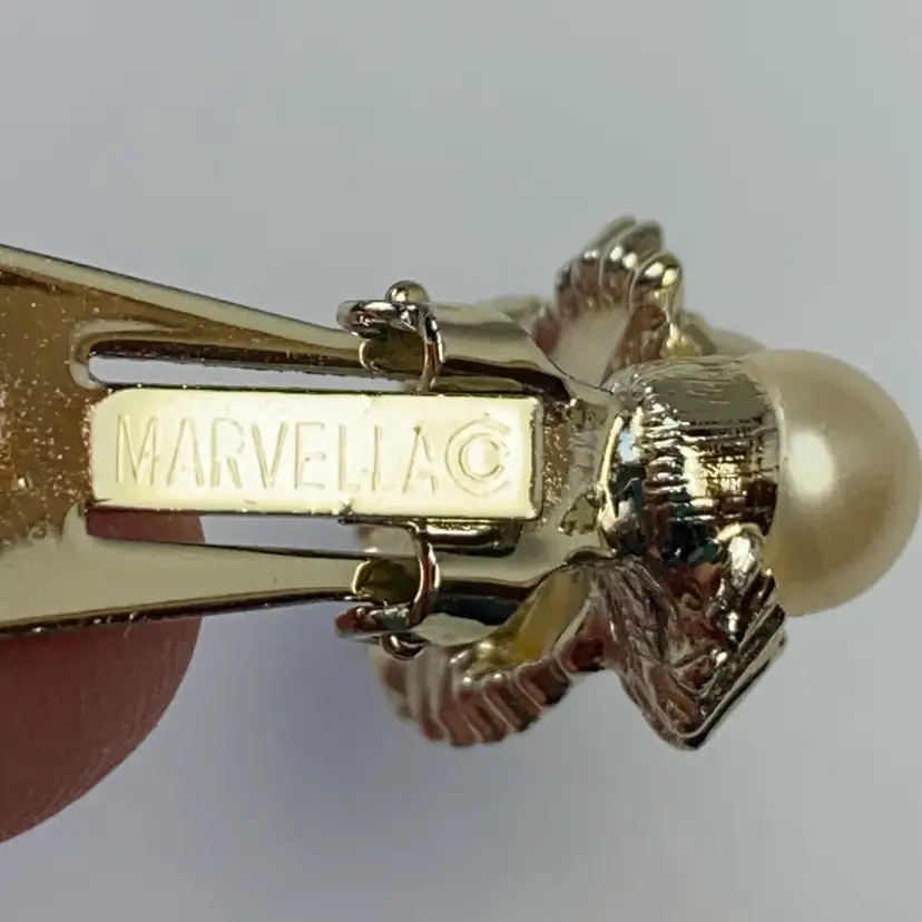 Vintage Marvella Signed Retro Faux Pearl Ribbon Gold Tone Clip On Earrings .8" Good vintage condition. Please see pictures for details. SMOKE FREE/PET FREE HOME Approximate measurements: Length- .8"
