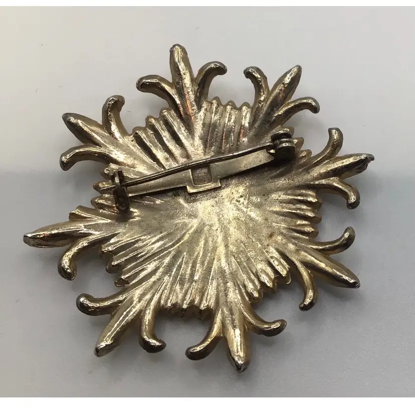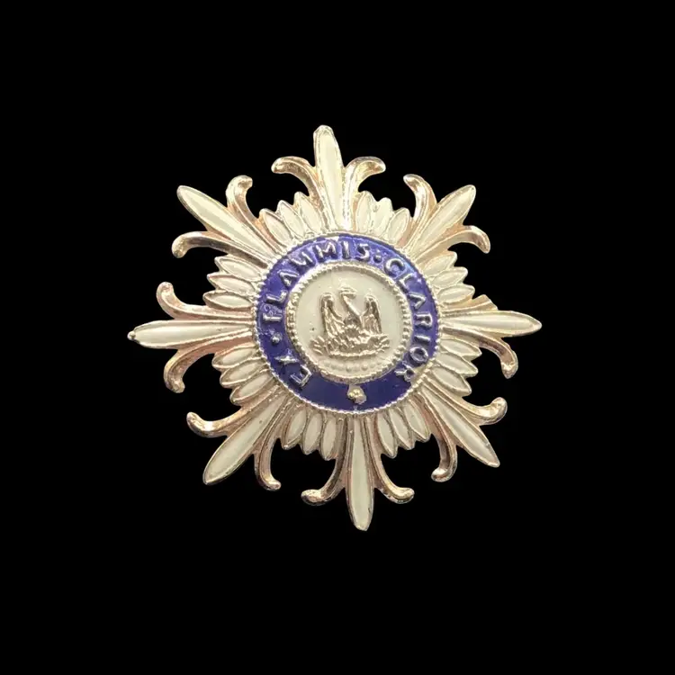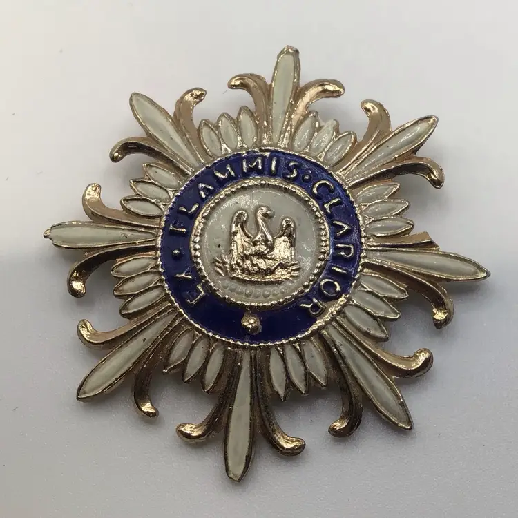 Latin motto ‘ex flammis clarior’ translates as ‘out of flame, brightness’. Enameled blue & white on gold tone metal 1-3/4” light wear. #115