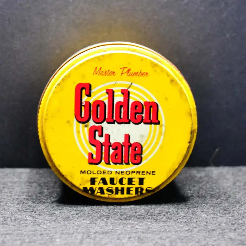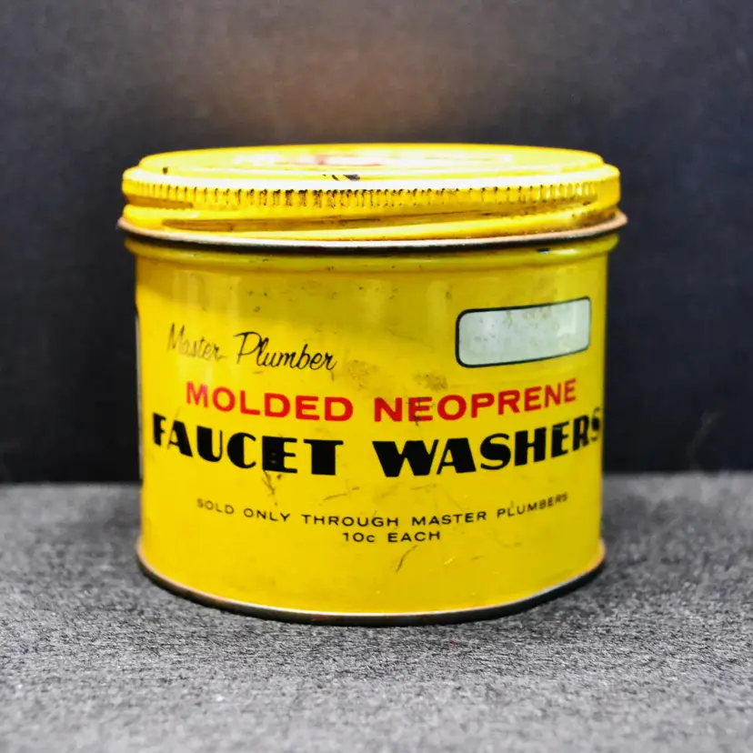 This bold yellow metal tin once held molded neoprene faucet washers, sold exclusively through Master Plumbers. Though the contents are long gone, the tin itself remains a striking relic of mid-century hardware branding. With its screw-top lid, classic typography, and “10¢ EACH” pricing, it’s a perfect piece for collectors of vintage advertising, plumbing memorabilia, or industrial décor.