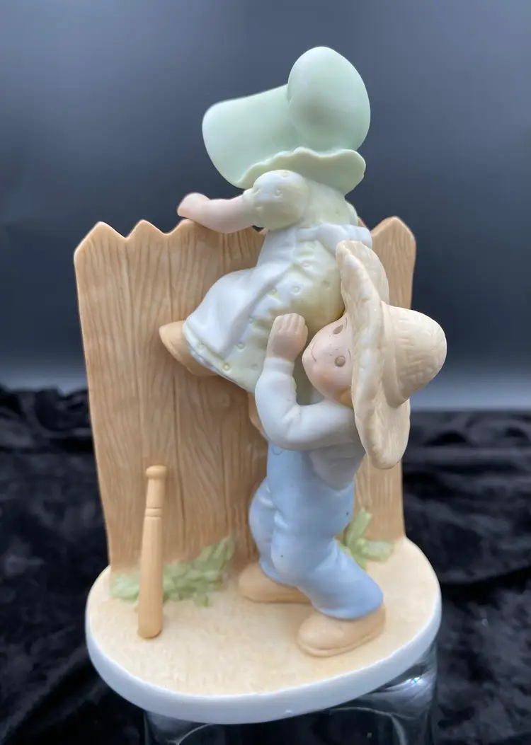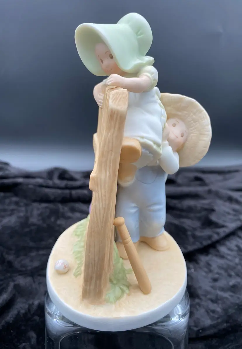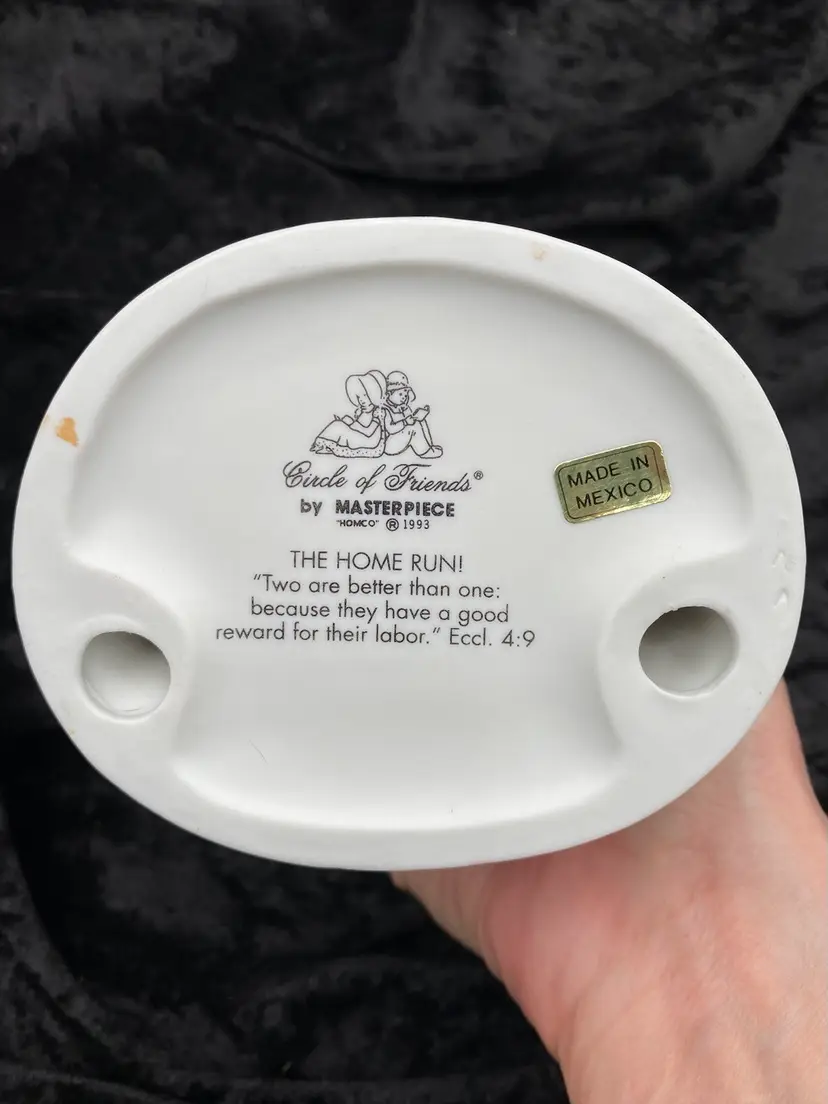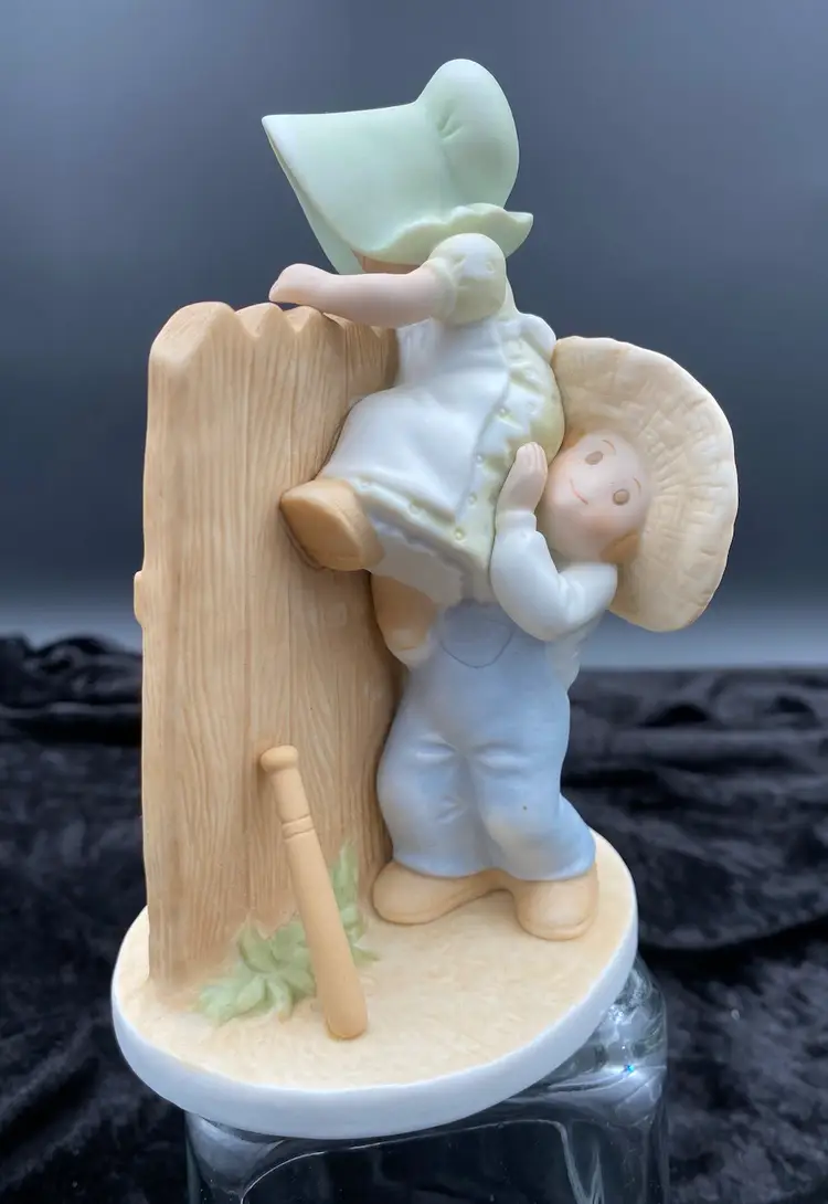 This vintage Homco Masterpiece figurine from the Circle of Friends collection is a beautiful addition to any decor. The piece features a a boy and girl in early 20th Century attire climbing over a fence to retrieve their baseball after a home run! Made of ceramic with a matte finish, this figurine stands at 5.75 inches tall and measures 4 inches in length and 3.6 inches in width. The figurine is an original from 1993 and comes with a sticker on the underside. It is a great piece for any room and occasion, and would make a wonderful gift for a baseball fan or someone who loves Little House on the Prairie (the attire). The figurine was manufactured in Mexico and is a traditional piece with a religious theme. The base has a scripture verse from the Bible, Ecclesiastes 4:9 - "Two are better than one: because they have a good reward for their labor." Add this unique and collectible piece to your decor today!