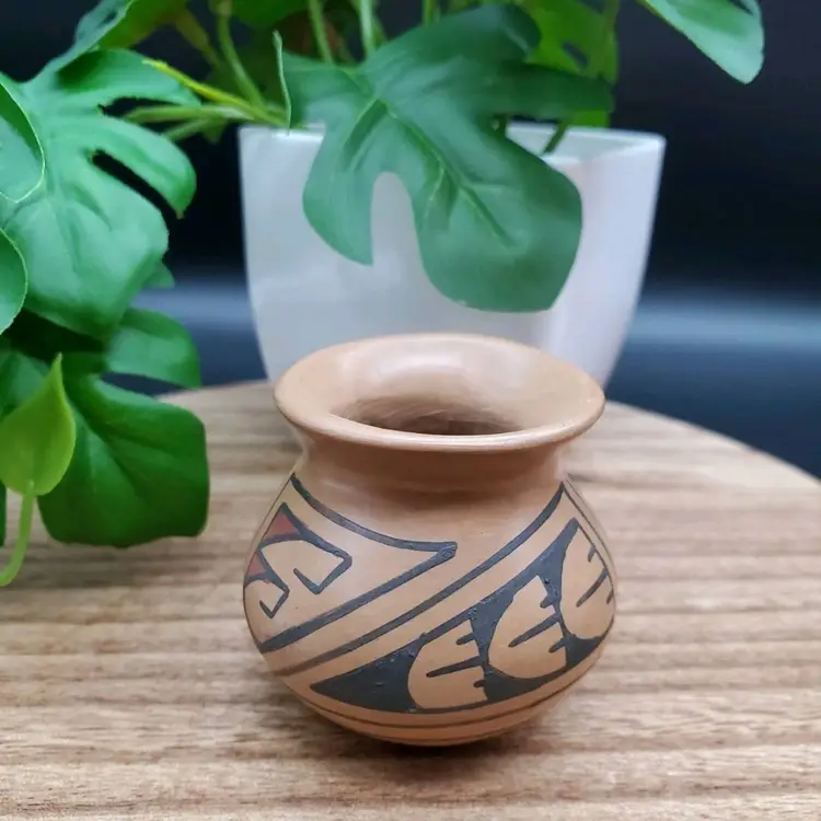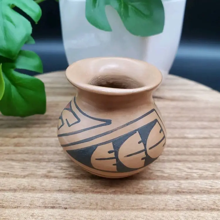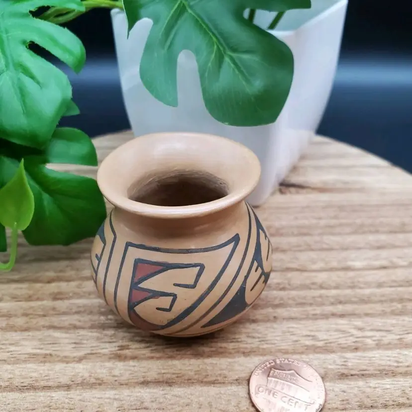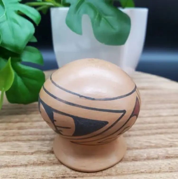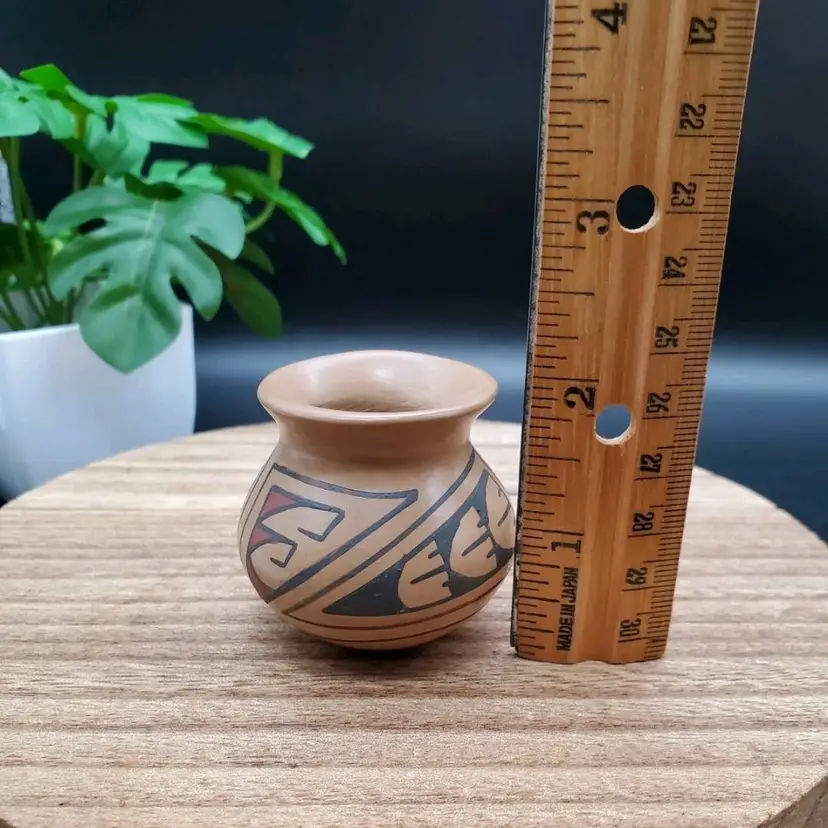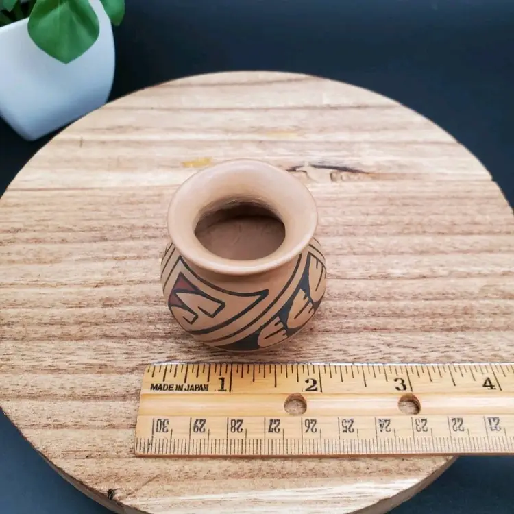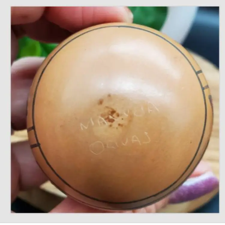 -Very good pre-owned condition with no chips or cracks. -Signed Manuela Olivas -Measures 2" x 2" and has a rounded bottom.