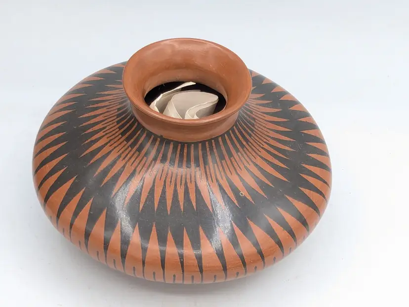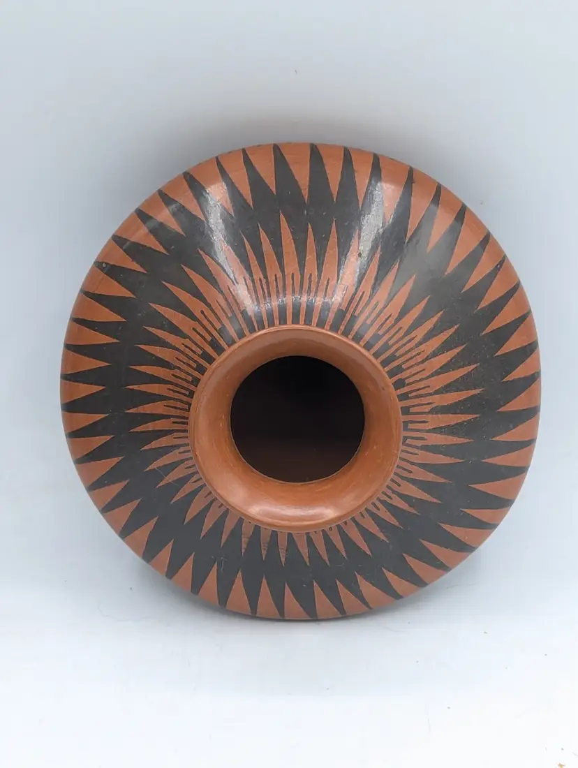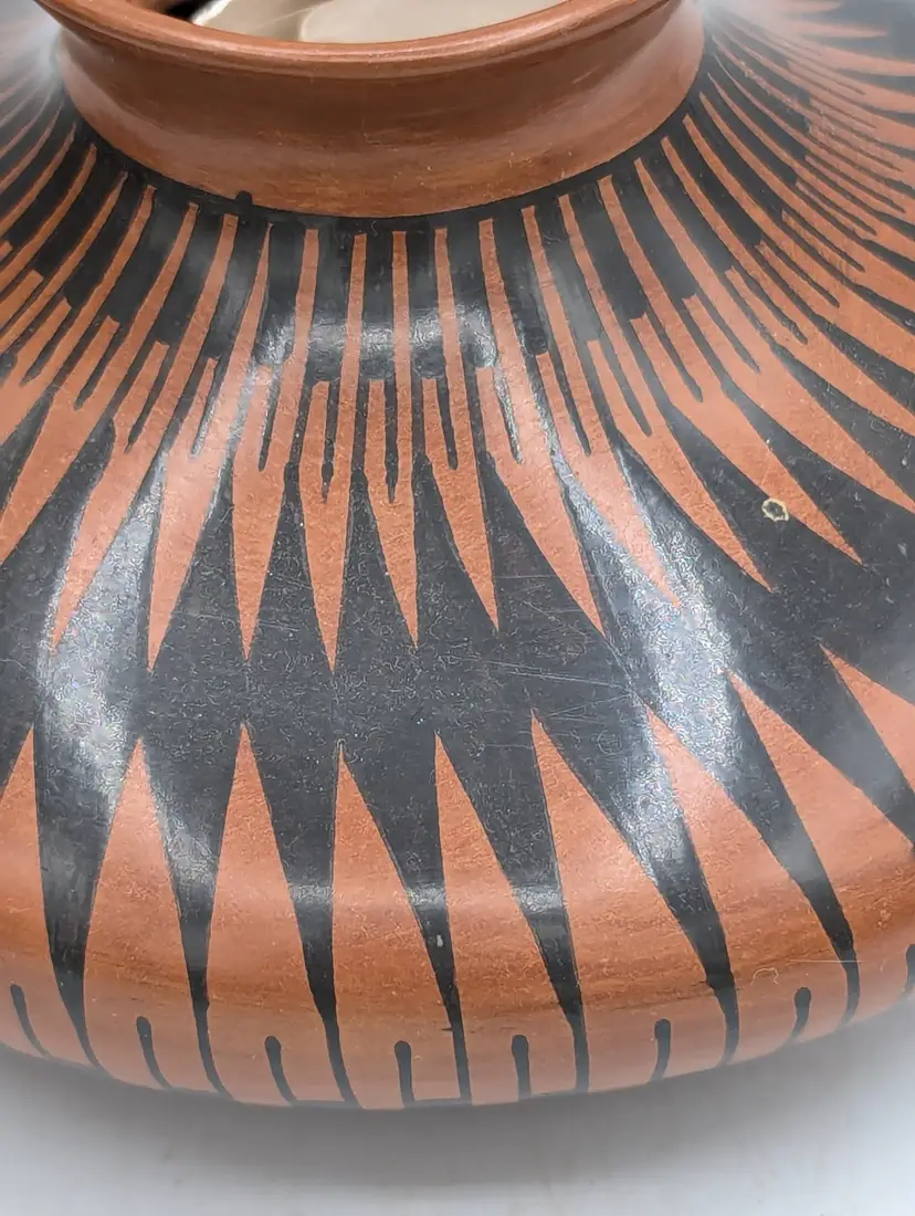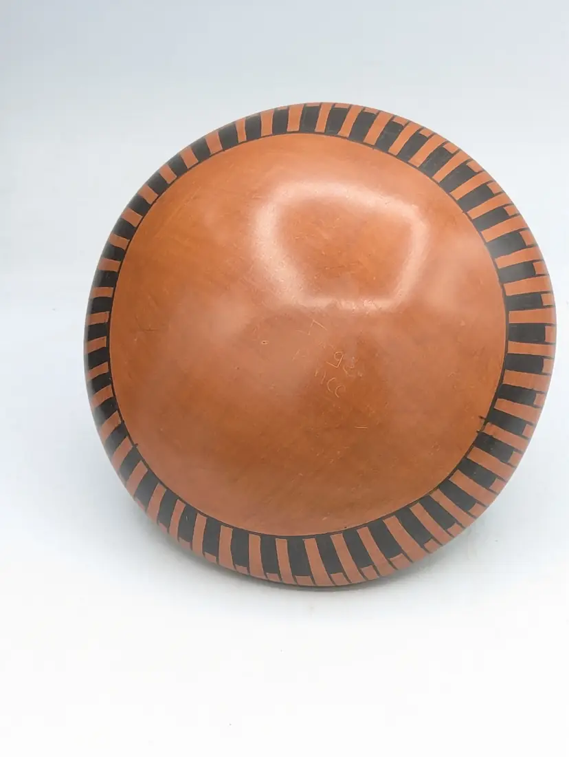 Highly Polished Dark Terra Cotta Detailed with Hand Painted Black and White Paint Checkerboard Pattern.