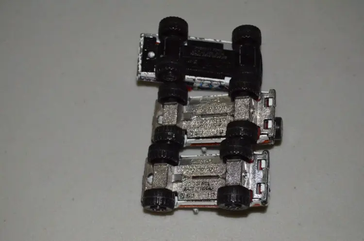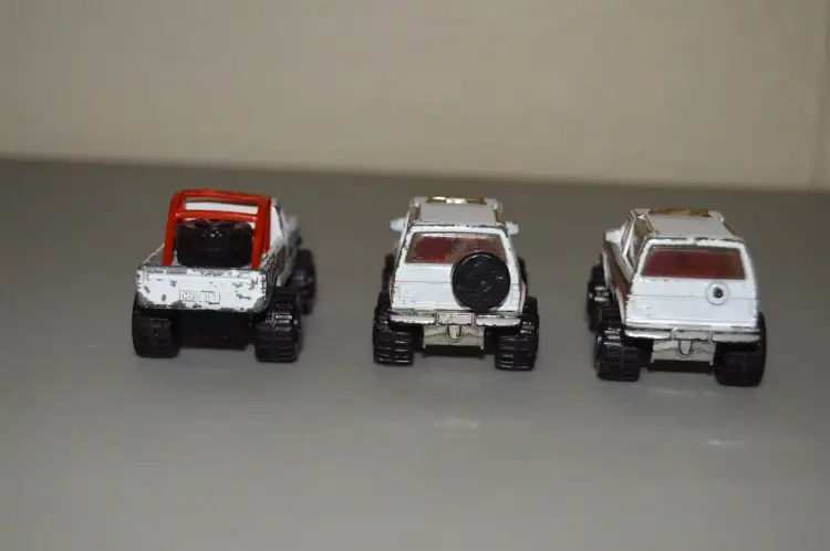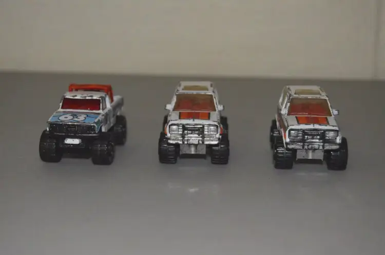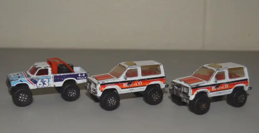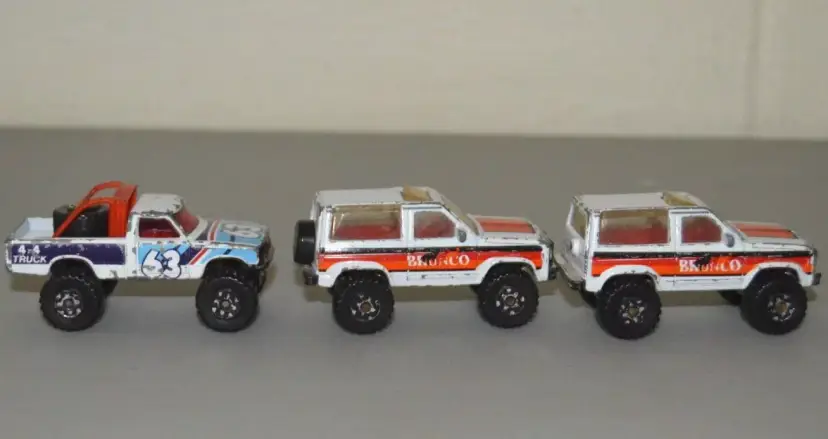 Three total trucks. 2 Ford Broncos and 1 4x4 Truck. Both vintage matchbox cars.