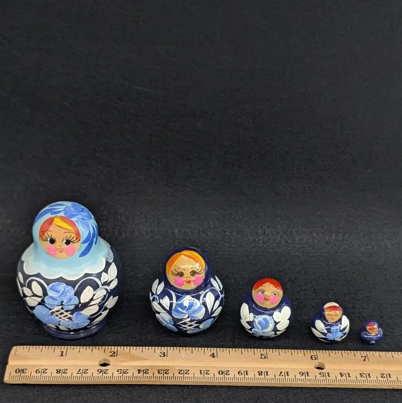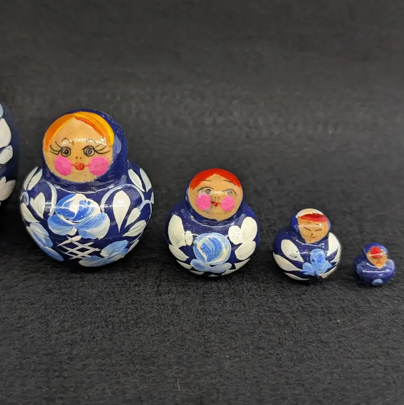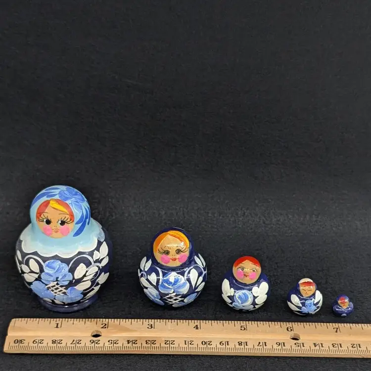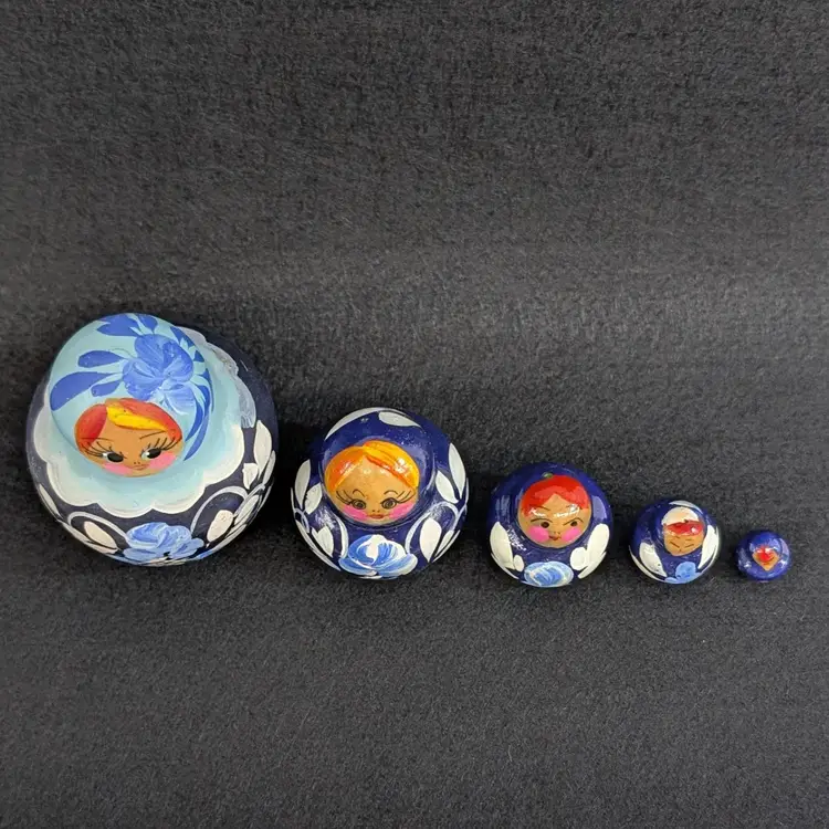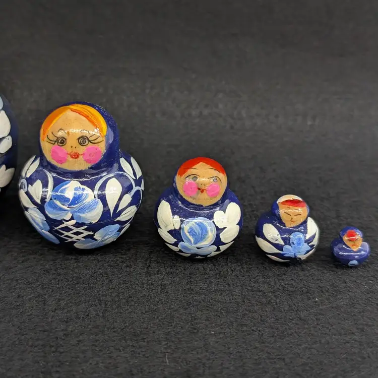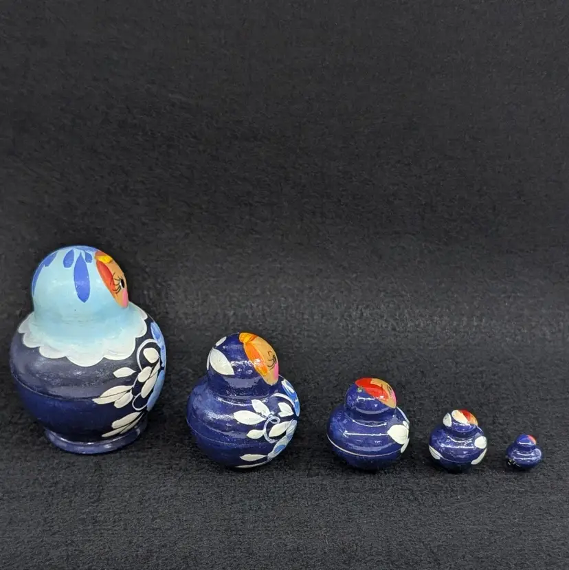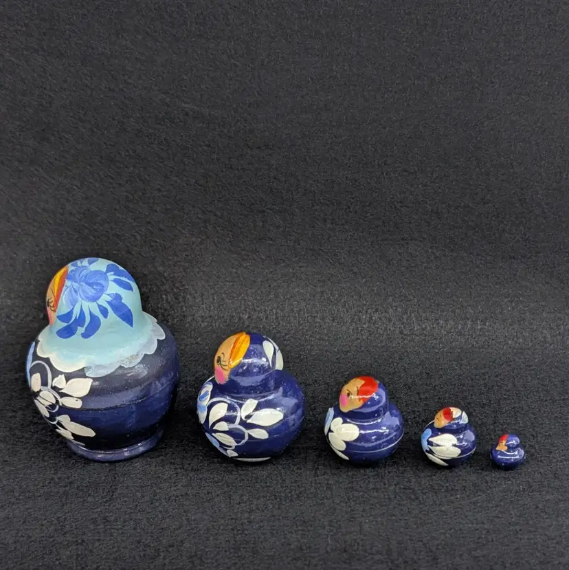 Set of 5 nesting dolls with a navy and light blur floral motif. In nice, vintage condition with minimal wear (see pictures). Measurements ~ 0.5-2" x 3/8-2.75"