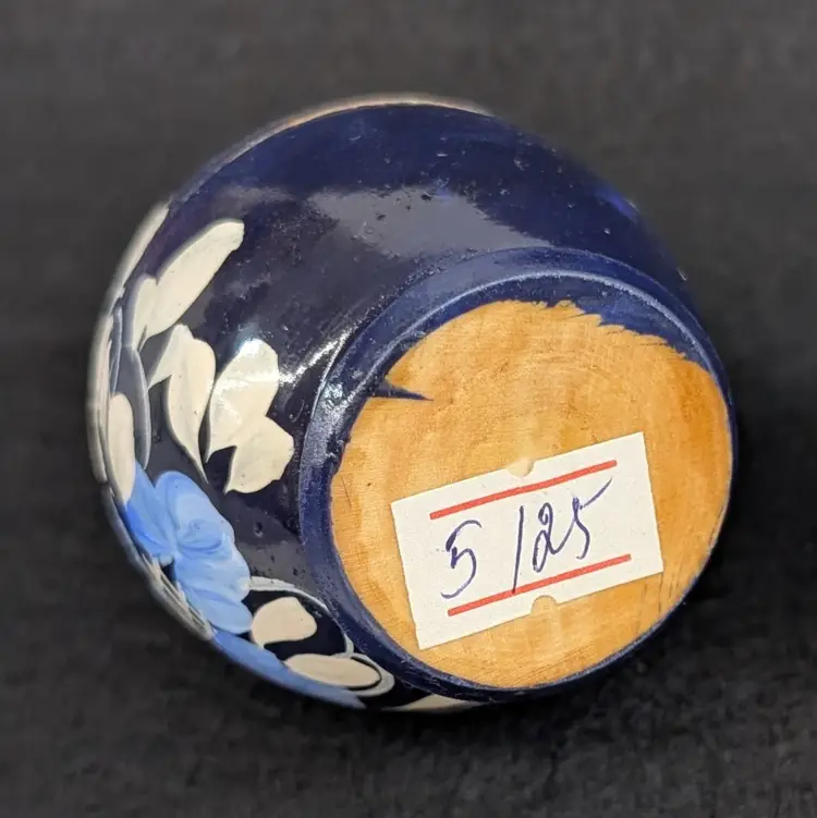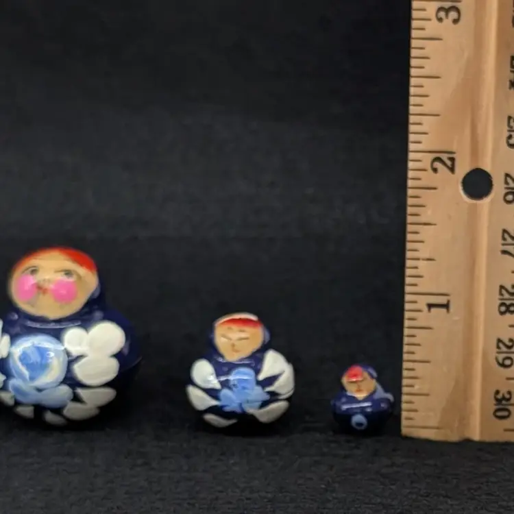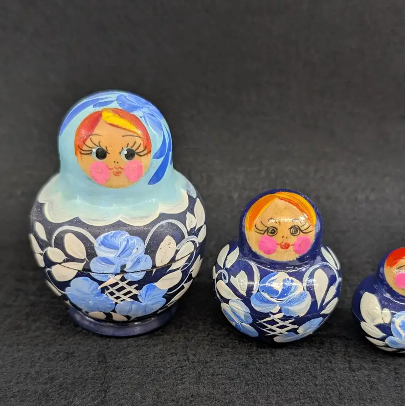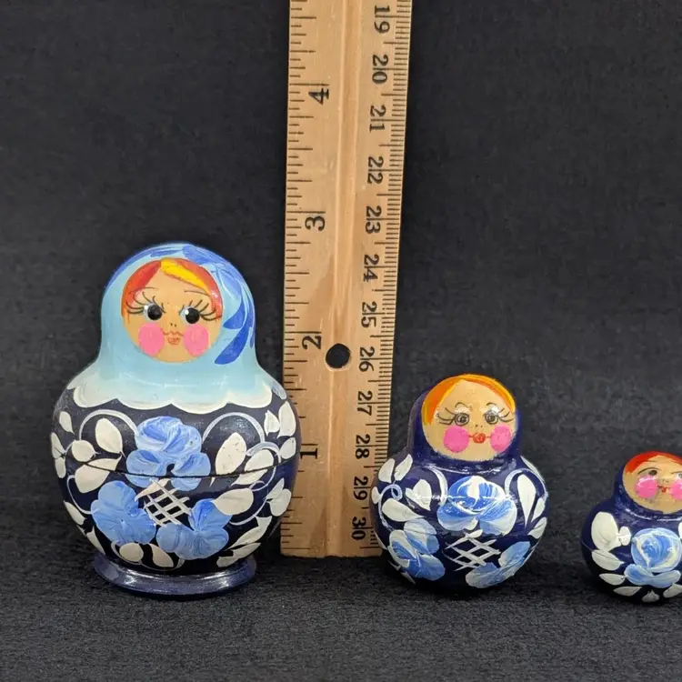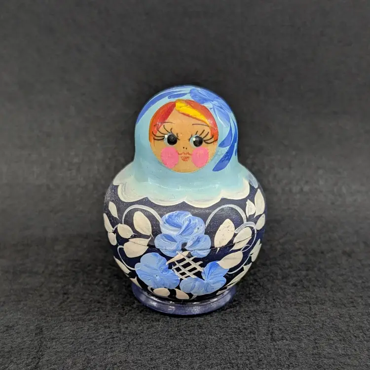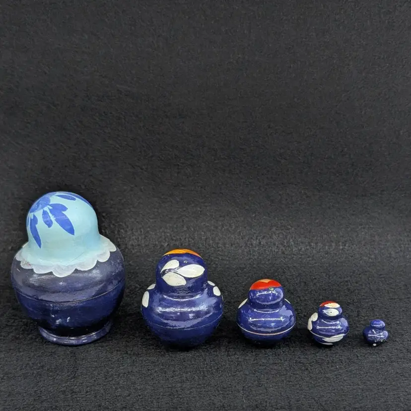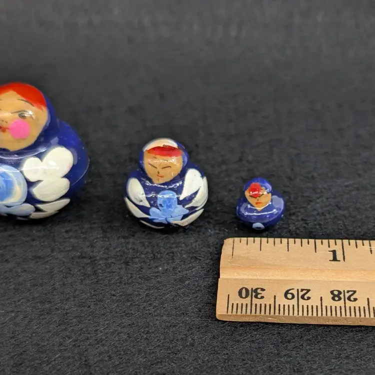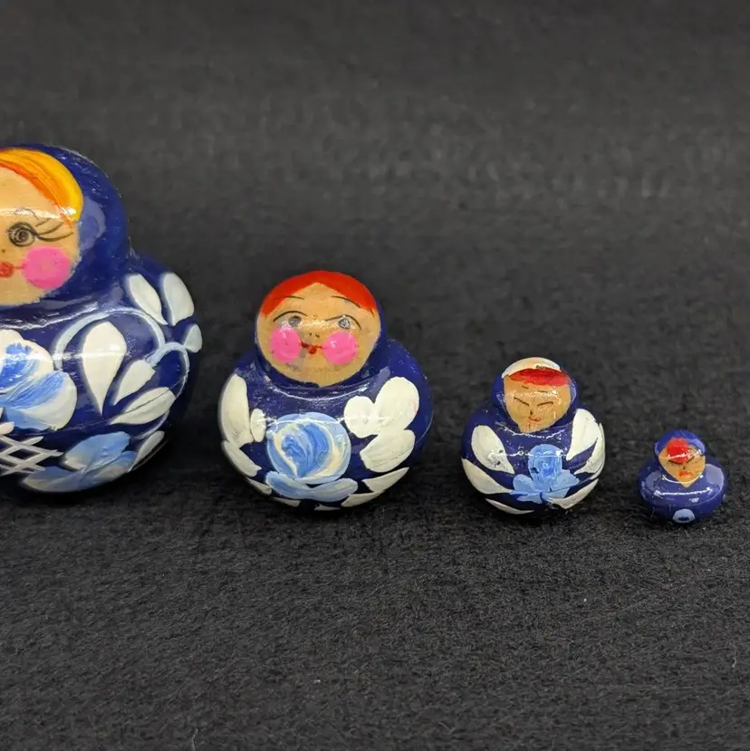 Set of 5 nesting dolls with a navy and light blur floral motif. In nice, vintage condition with minimal wear (see pictures). Measurements ~ 0.5-2" x 3/8-2.75"