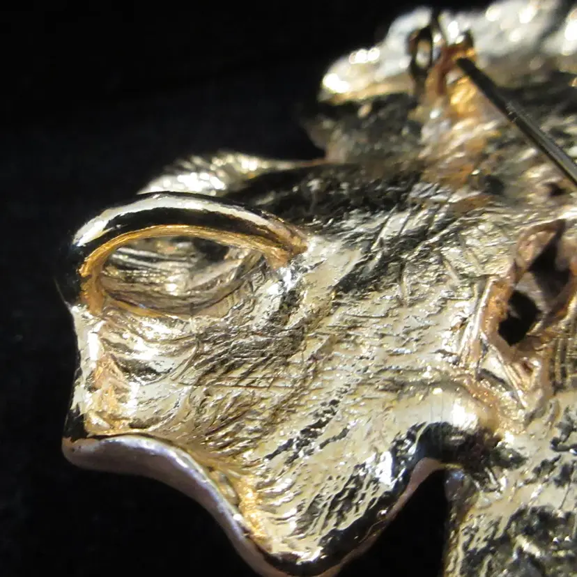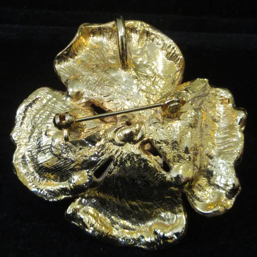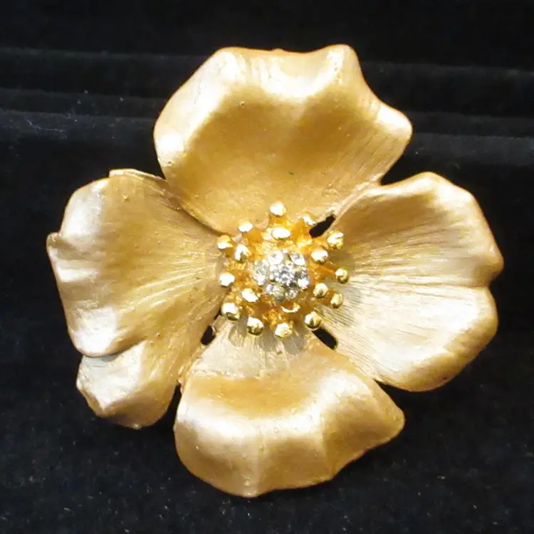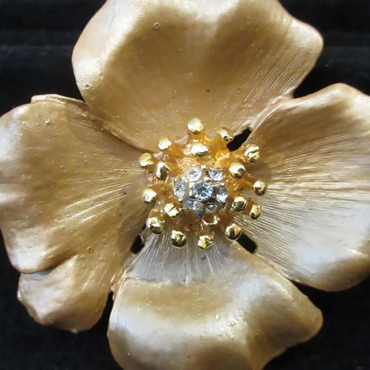 This is an AMAZING vintage brooch/pendant made of gold tone metal. The brooch is shaped like a Dogwood flower and is enameled with a matte gold color. The center of the flower features gold tone metal filaments and a clear rhinestone center with 7 small crystal rhinestones. The effect is amazing! There is a pin back AND a loop for a necklace, so this can be used as a brooch or a pendant. It is about 2 inches in diameter.