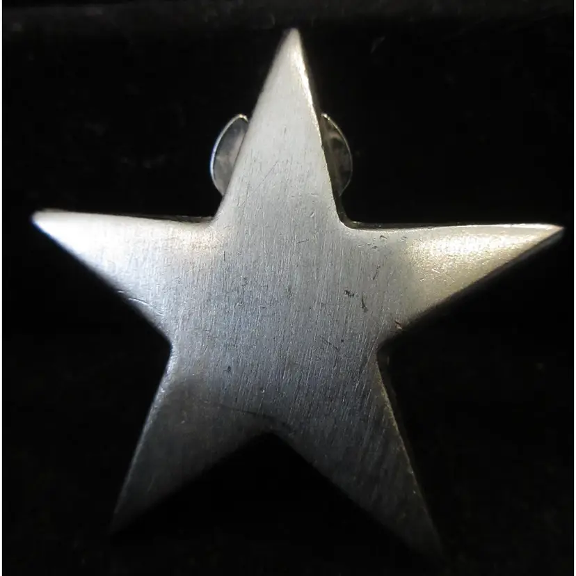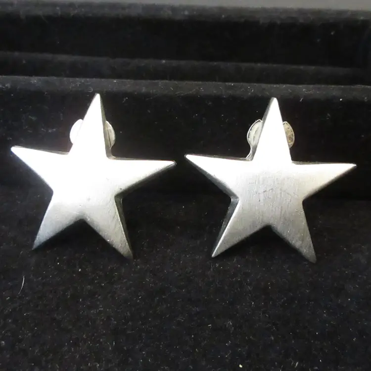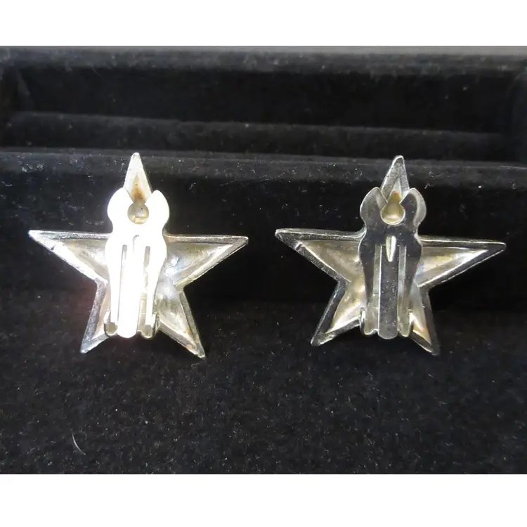 This is an AWESOME pair of vintage matte silver tone metal earrings. The earrings are shaped like 5-point stars and are slightly convex. They are each 1 inch wide and have a clip on attachment.