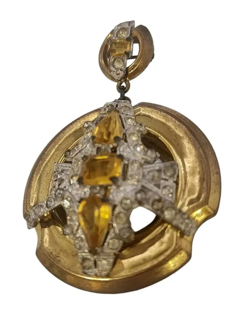 Size: 3" Color: Gold Condition: Very good vintage Signed: None Details: Not marked, but definitely McClleland and Barclay. A few replaced rhinestones, a little bit of pitting/darkening to the top metal, and the back as well as some scratches to the back.