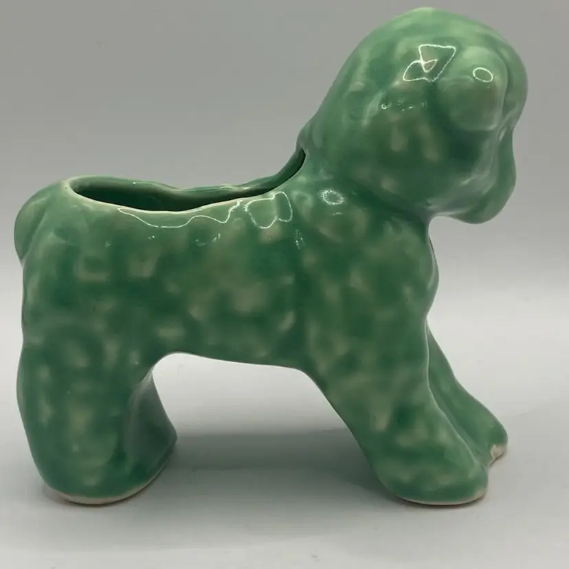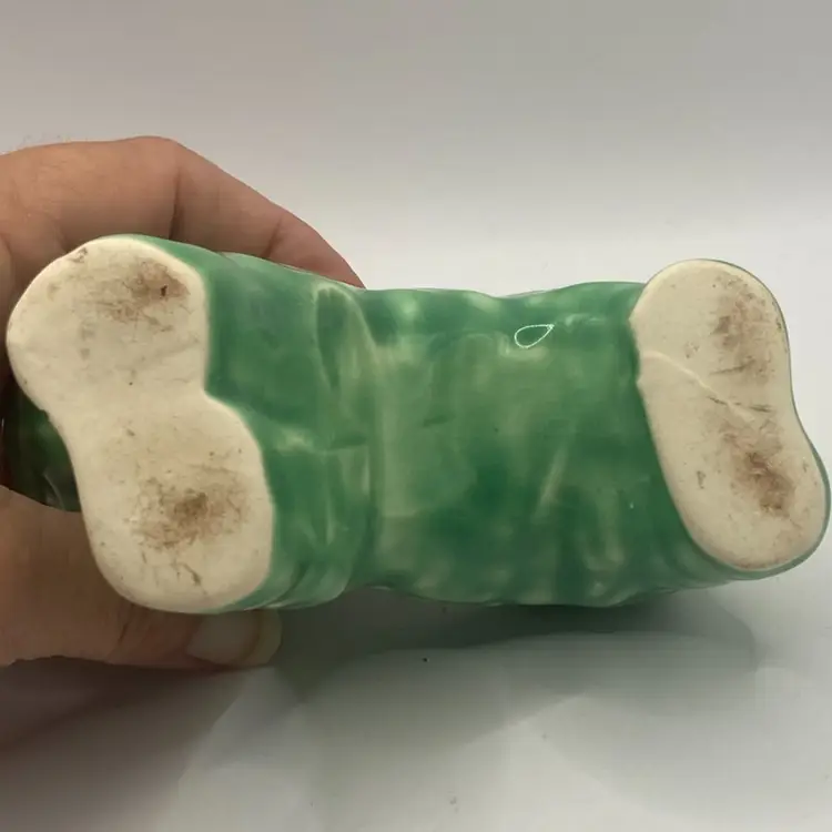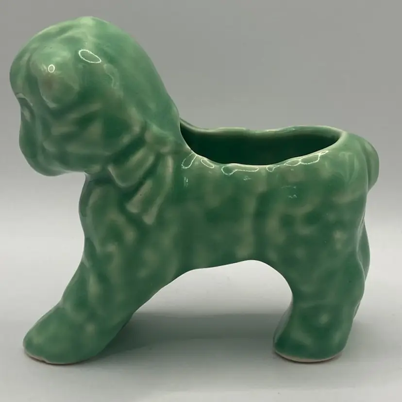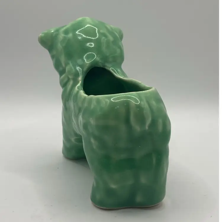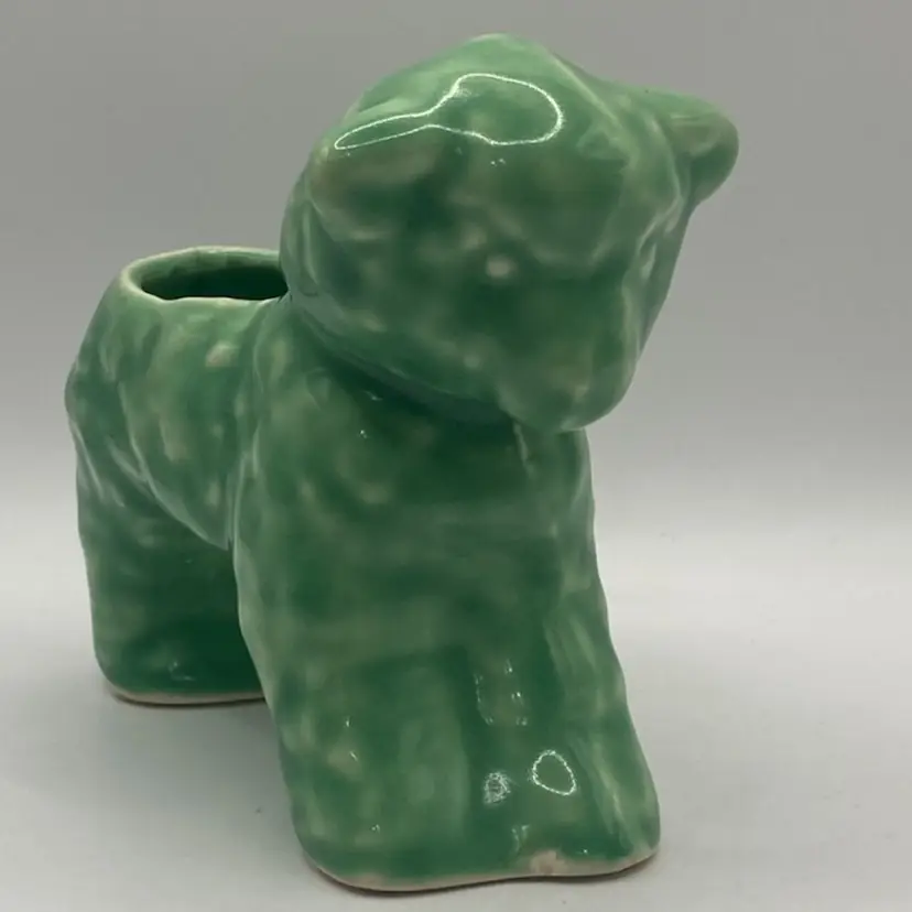 This planter is a green or teal color. The lamb has a bow on its neck, and is darling. It has a small chippy on the foot, but otherwise in good condition. See photos for details.