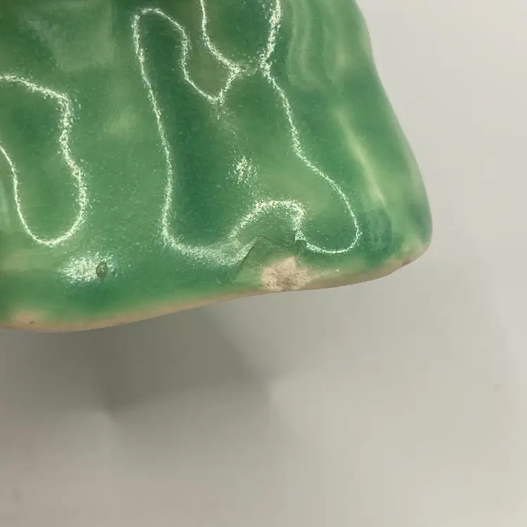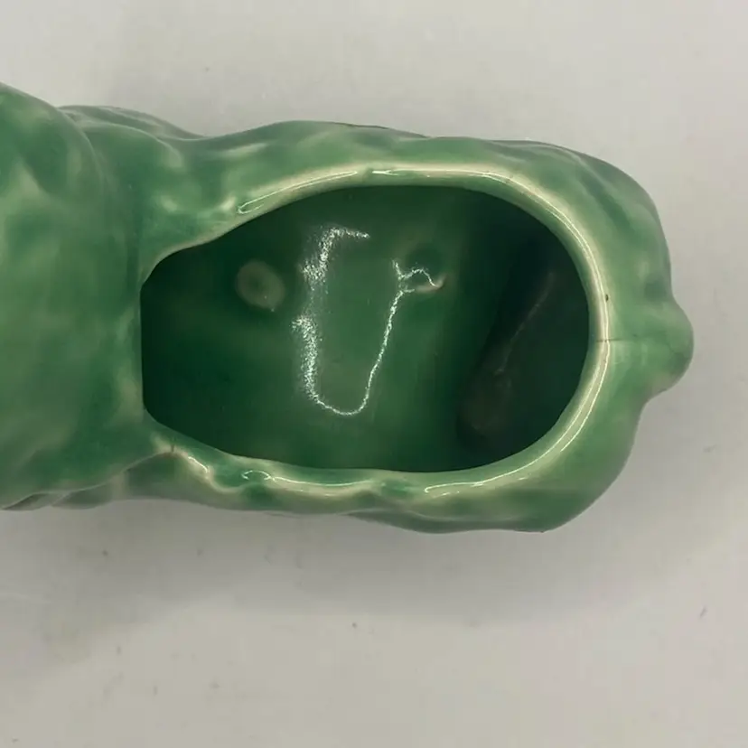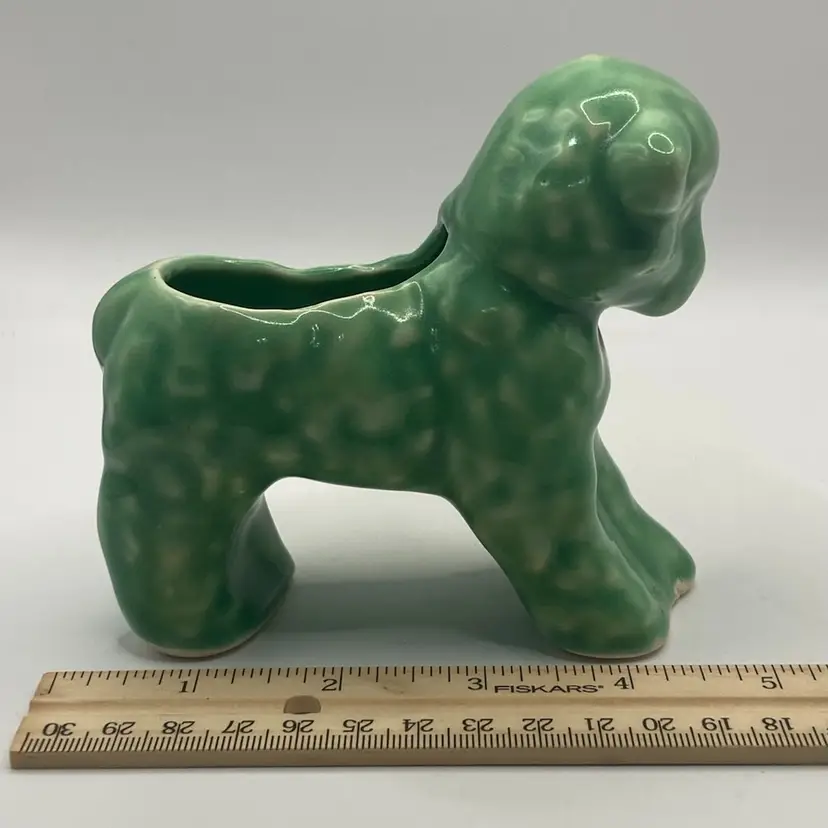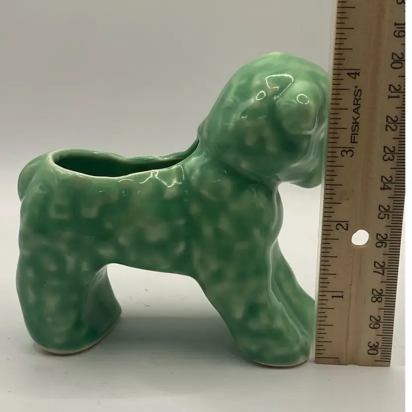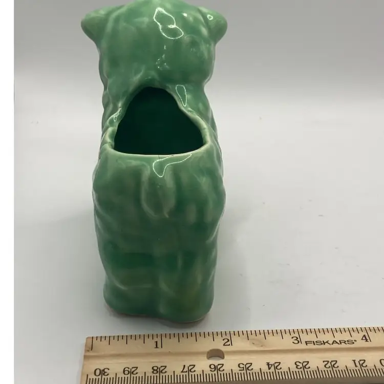 This planter is a green or teal color. The lamb has a bow on its neck, and is darling. It has a small chippy on the foot, but otherwise in good condition. See photos for details.