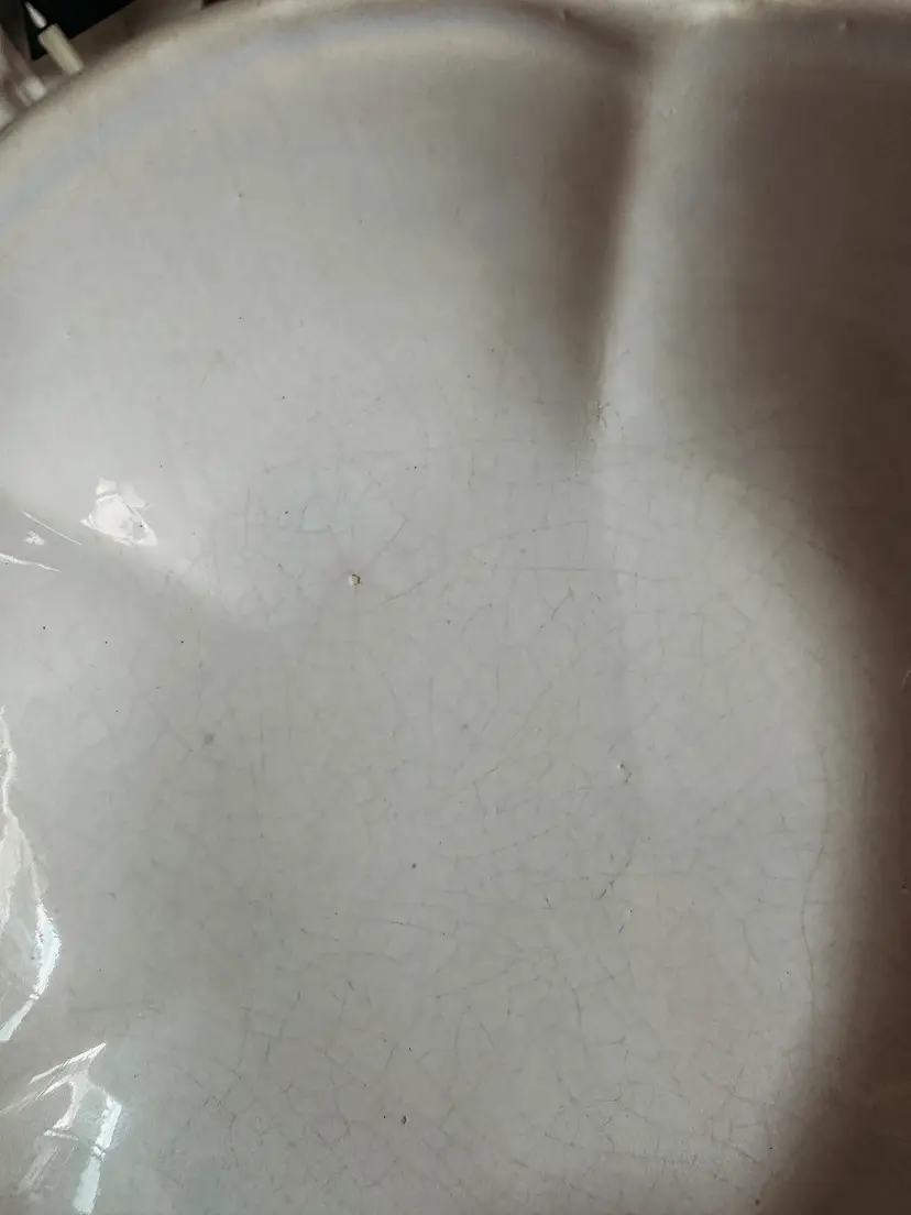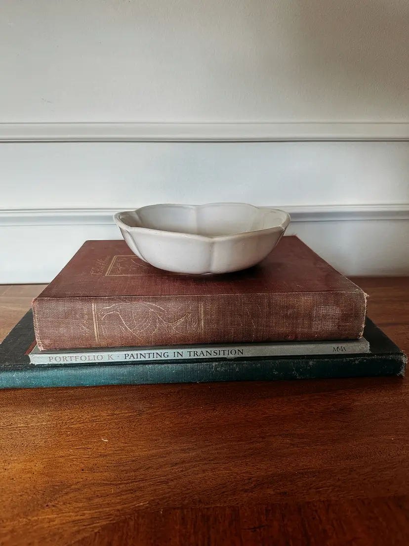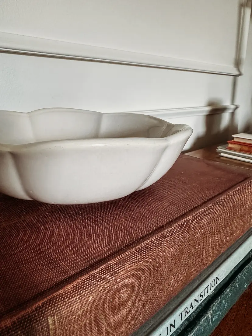 This BEAUTIFUL bowl is approximately 8 inches in diameter. It is often described as having a flower-like or lotus shape due to its scalloped rim. It also has a light blue tint to is! The bowl is a highly collectible item. In amazing vintage condition with no chips or cracks. There is some crazing which is lovely!