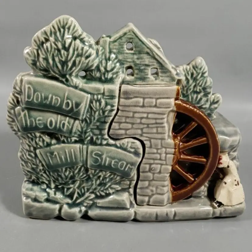• Ceramic • Hand painted, glazed • Fisherman Legend: "Down By The Old Mill Stream" • Embossed on base: